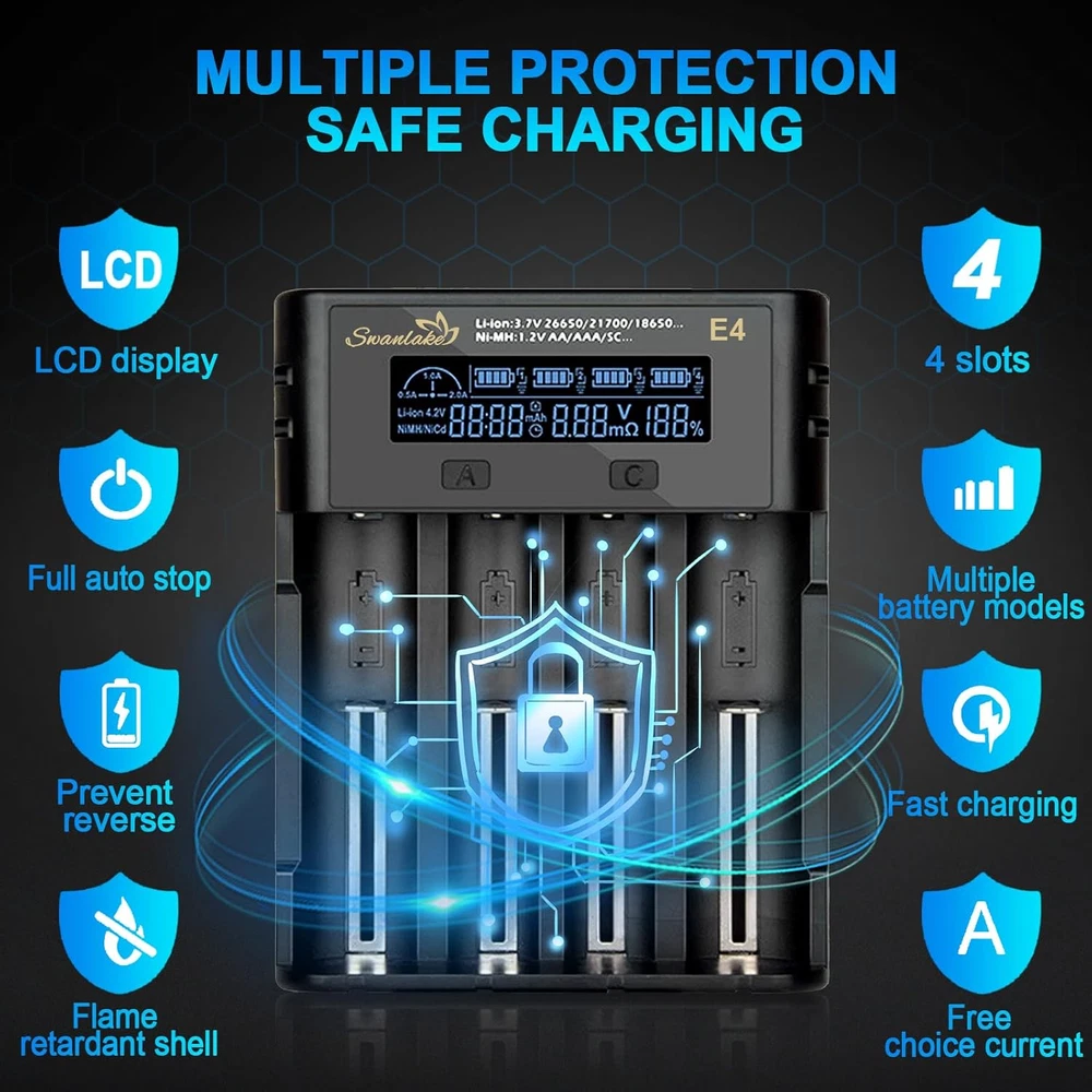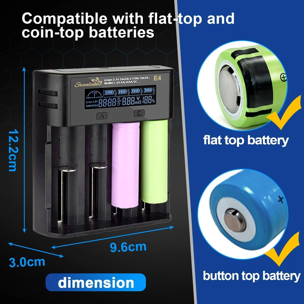 4 bay 18650 battery charger:Compatible with 3.7v Lithium li-ion rechargeable batteries 18650 26650 21700 18350 16340(RCR123) 10440 17670 18490 17500.And 1.2V/Ni-mh/Ni-cd batteries AAAA AAA AA A.The charger will automatically recognize the battery type Lithium Battery Charger: The 18650 battery charger has an LCD display, The button C switches the monitoring status, which can display the charging voltage, charging time, charging capacity, and charging progress% of each charging slot. Button A switches the charging current 0.5A/1A/2A, the 2500mAh battery can be fully charged in 1.5 hours Safety Protection: Safe and fire prevention PC+ABS material Battery Charger, Built-in intelligent circuits protection to protect the battery safety charged. A protection against short circuit, overheat, over-voltage and over-discharge. Distinctively, the discharging function can decrease the hurt of battery, making it more efficient Portable And Compact: 4 Slot Battery Charger Design Can Charge 4 Different Batteries At The Same Time, Equipped With 3 Input Ports: USB-C / Lightning / Micro, It Becomes Your Best Travel 18650 Universal Charger. Note: Only Charger,No Battery PREMIUM SERVICE: If you have any questions, please tell us at first time. We will provide professional service to solve your problems. There is a totally risk-free purchase. Product Description 18650 Battery Charger,LCD Display Smart Universal Charger for 3.7v Lithium Li ion Rechargeable Battery 26650 21700 18650 RCR123A,NiMH NiCd AAA AA A/C Smart button The button C switches the monitoring status, which can display the charging voltage, charging time, charging capacity, and charging progress% of each charging slot. The Button A switches the charging current 0.5A/1A/2A, the 2500mAh battery can be fully charged in 1.5 hours 4 bay 18650 battery charger Compatible with 3.7v Lithium li-ion rechargeable batteries 18650 26650 21700 18350 16340(RCR123) 10440 17670 18490 17500.And 1.2V/Ni-mh/Ni-cd batteries AAAA AAA AA A.The charger will automatically recognize the battery type.