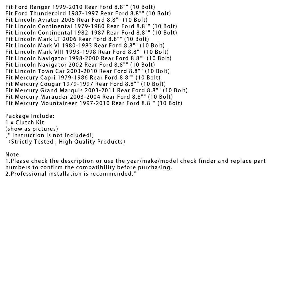 Locker Axle SL D44-30 Posi 30 Spline For Dana 44 Yukon Spartan Locker 169.85 USD Free shipping Rear Differential Coupling 387613KA0B For Infiniti QX60 Nissan Pathfinder 13-20 429.85 USD Free shipping 47800-39000 Coupling Assy 4WD For Hyundai Santa Fe 2001-2005 269.85 USD Free shipping Rear Differential Coupling 387613KA0B For Infiniti QX60 Nissan Pathfinder 13-20. 369.85 USD Free shipping Rear Differential Locker SL M35-1.5-27 For Jeep Wrangler Dana 35 27 Spline 84-04 163.85 USD Free shipping 8.8" Traclok Posi Clutch Pack Kit Lsd Spider Gears For Ford 8.8" Truck Rearend Feature: 1: According to the original factory specifications,perfect match for the original car. 2: Own different test machines to design exact accurate parameter for our products.All items were tested for performance. 3: Made by high quality material, lightweight, anti-rust, colorfast and durable. 4: Aftermarket product with premium quality. 5: Stable performance, high reliability,suitable for replacing your broken one. Specifics: Condition: 100% Brand New Material: Metal+Plastic Color:show as pictures Manufacturer Part Number: F8.8CPK, ZIKF8.8-T/L-31 Interchange Part Number: F8.8CPK, ZIKF8.8-T/L-31 Other Part Number: F8.8CPK, ZIKF8.8-T/L-31 Type: Gear Axle Spline: 31 Compatible Carrier: Factory Traclok posi carrier only (7/8" cross pin) Placement on Vehicle:Rear Fitment Type: Direct Replacement Fitment: For Ford 8.8" Truck rearend (10 bolt cover) (ears on clutch plates measure 1/2" tall) Vehicle Information: Fit Ford Bronco 1983-1996 Rear Ford 8.8" (10 Bolt) Fit Ford Crown Victoria 2003-2009 Rear Ford 8.8" (10 BoltFit) Fit Ford E-100 Econoline 1983 Rear Ford 8.8" (10 Bolt) Fit Ford E-150 2003-2014 Rear Ford 8.8" (10 Bolt) Fit Ford E-150 Econoline 1983-2002 Rear Ford 8.8" (10 Bolt) Fit Ford E-250 Econoline 1983-1998 Rear Ford 8.8" (10 Bolt) Fit Ford Expedition 1997-2001 Rear Ford 8.8" (10 Bolt) Fit Ford Explorer 1991-2001 Rear Ford 8.8" (10 Bolt) Fit Ford Explorer Sport Trac 2002-2005 Rear Ford 8.8" (10 Bolt) Fit Ford Explorer Sport Trac 2007-2010 Rear Ford 8.8" (10 Bolt) Fit Ford F-150 1983-2014 Rear Ford 8.8" (10 Bolt) Fit Ford Granada 1979-1982 Rear Ford 8.8" (10 Bolt) Fit Ford LTD 1979-1986 Rear Ford 8.8" (10 Bolt) FFit ord LTD Crown Victoria 1987-1991 Rear Ford 8.8" (10 Bolt) Fit Ford Mustang 1994-2004 Rear Ford 8.8" (10 Bolt) Fit Ford Mustang 2006-2014 Rear Ford 8.8" (10 Bolt) Fit Ford Ranger 1999-2010 Rear Ford 8.8" (10 Bolt) Fit Ford Thunderbird 1987-1997 Rear Ford 8.8" (10 Bolt) Fit Lincoln Aviator 2005 Rear Ford 8.8" (10 Bolt) Fit Lincoln Continental 1979-1980 Rear Ford 8.8" (10 Bolt) Fit Lincoln Continental 1982-1987 Rear Ford 8.8" (10 Bolt) Fit Lincoln Mark LT 2006 Rear Ford 8.8" (10 Bolt) Fit Lincoln Mark VI 1980-1983 Rear Ford 8.8" (10 Bolt) Fit Lincoln Mark VIII 1993-1998 Rear Ford 8.8" (10 Bolt) Fit Lincoln Navigator 1998-2000 Rear Ford 8.8" (10 Bolt) Fit Lincoln Navigator 2002 Rear Ford 8.8" (10 Bolt) Fit Lincoln Town Car 2003-2010 Rear Ford 8.8" (10 Bolt) Fit Mercury Capri 1979-1986 Rear Ford 8.8" (10 Bolt) Fit Mercury Cougar 1979-1997 Rear Ford 8.8" (10 Bolt) Fit Mercury Grand Marquis 2003-2011 Rear Ford 8.8" (10 Bolt) Fit Mercury Marauder 2003-2004 Rear Ford 8.8" (10 Bolt) Fit Mercury Mountaineer 1997-2010 Rear Ford 8.8" (10 Bolt) Package Include: 1 x Clutch Kit (show as pictures) [* Instruction is not included!] (Strictly Tested , High Quality Products) Note: 1.Please check the description or use the year/make/model check finder and replace part numbers to confirm the compatibility before purchasing. 2.Professional installation is recommended. -About US Founded in 2012, VIPJQ have professional development and sales, and are involved in various products, providing customers with various high-quality products. Since its establishment, VIPJQ has always adhered to the service concept of "customer first" and the management concept of "pursuit of quality", and is committed to providing customers with high-quality original designs. We commit to provide you the best innovative, quality products & professional services with competitive prices. We value every customer, and we look forward to providing solutions for your business needs to help your business achieve its goals, please contact us immediately! We are all about you! We are a Japanese seller,but with large warehouse in USA. We are profesional on Auto Parts,Car Parts,Motorcycle Parts,3C,other hot sale items and so on. We aim to provide to customers high quality product and best service. -About Shipment&Returns The item usually will be dispatched within 3 days after you ordered.All are free shipping. And it usually takes 3-10 working days to delivery depends on buyers' address or other majeure on the way. If you are not satisfied with the items and want to return the item,we hope you could message us first,we will give you the return details, we think we could give you the best service to save your time and money.Thank you. -About Feedback&Customer Service If you are enjoy your shopping here,not only enjoy the items but also the service,we are appreciate you could give us a 5-star feedback. If you are not satisfied with the item,before you give us the negative feedback,we hope we could give you the best solution through our commutication. We think we could do it if you give us the chance.Thank you.