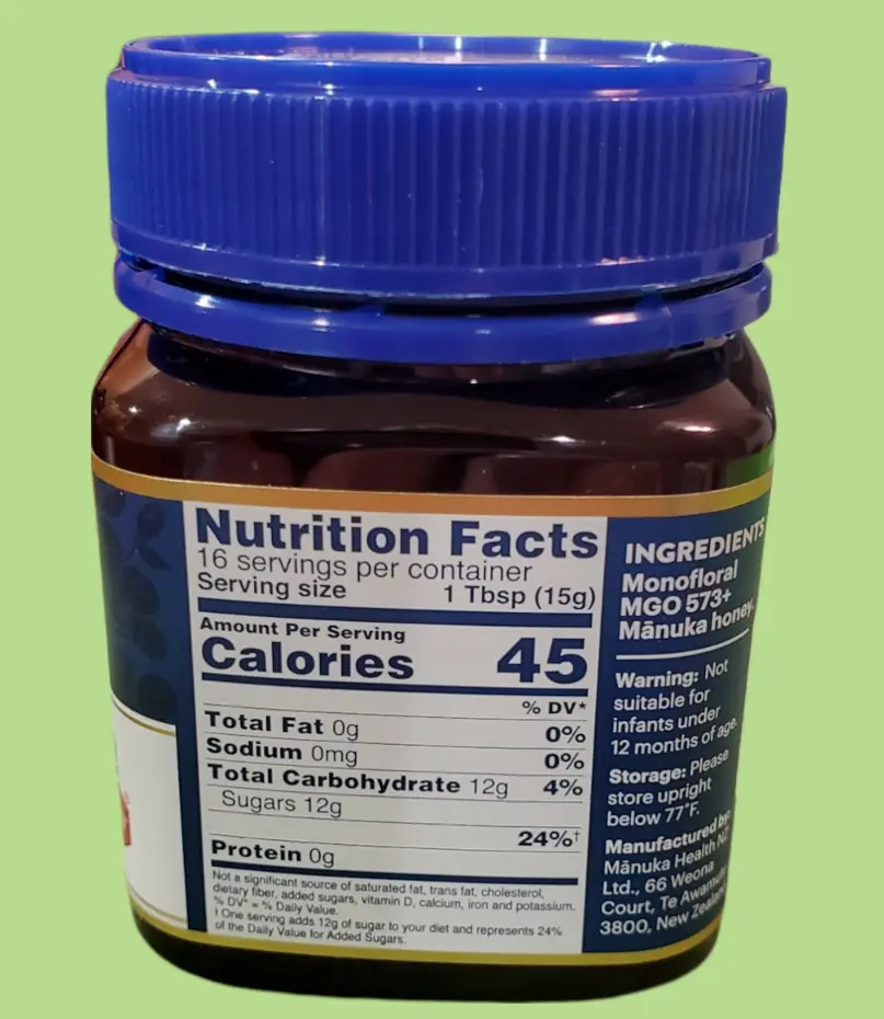 Food Specifications:BPA-FreeType:Manuka HoneyForm:JarFood Aisle:PantryServing Size:1 Tbsp (15g)gtin13:895015001568Item Weight:250 gIngredients:Manuka HoneyExpiration Date:01/2029Product:HoneyUPC:895015001568Brand:Manuka Health New ZealandCalories per Serving:45Country of Origin:New Zealand