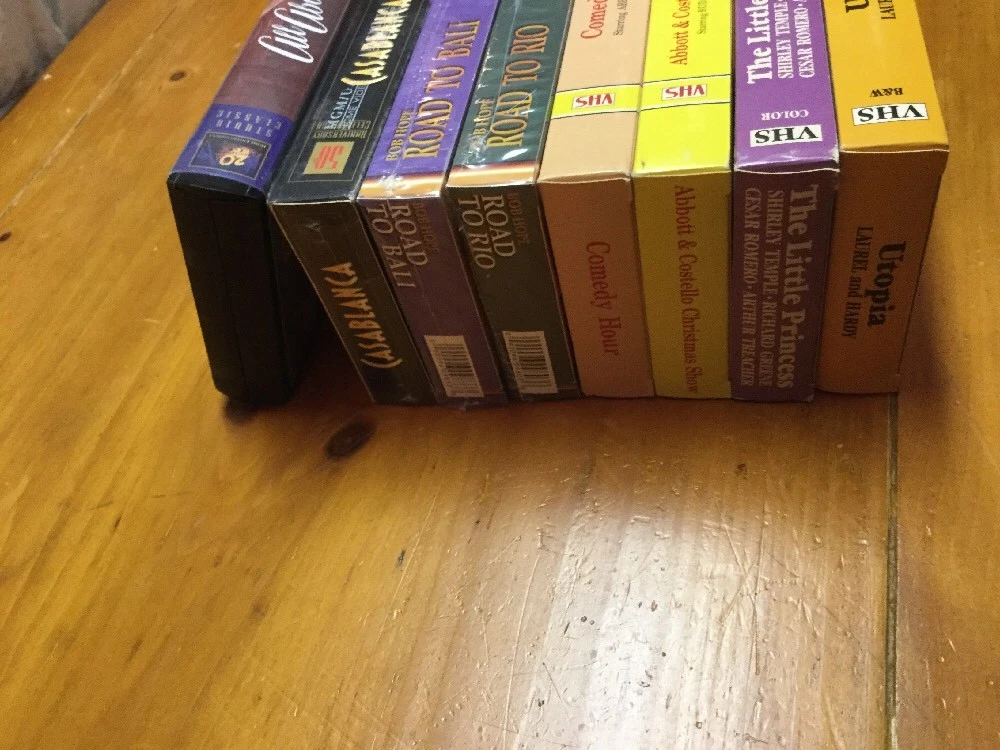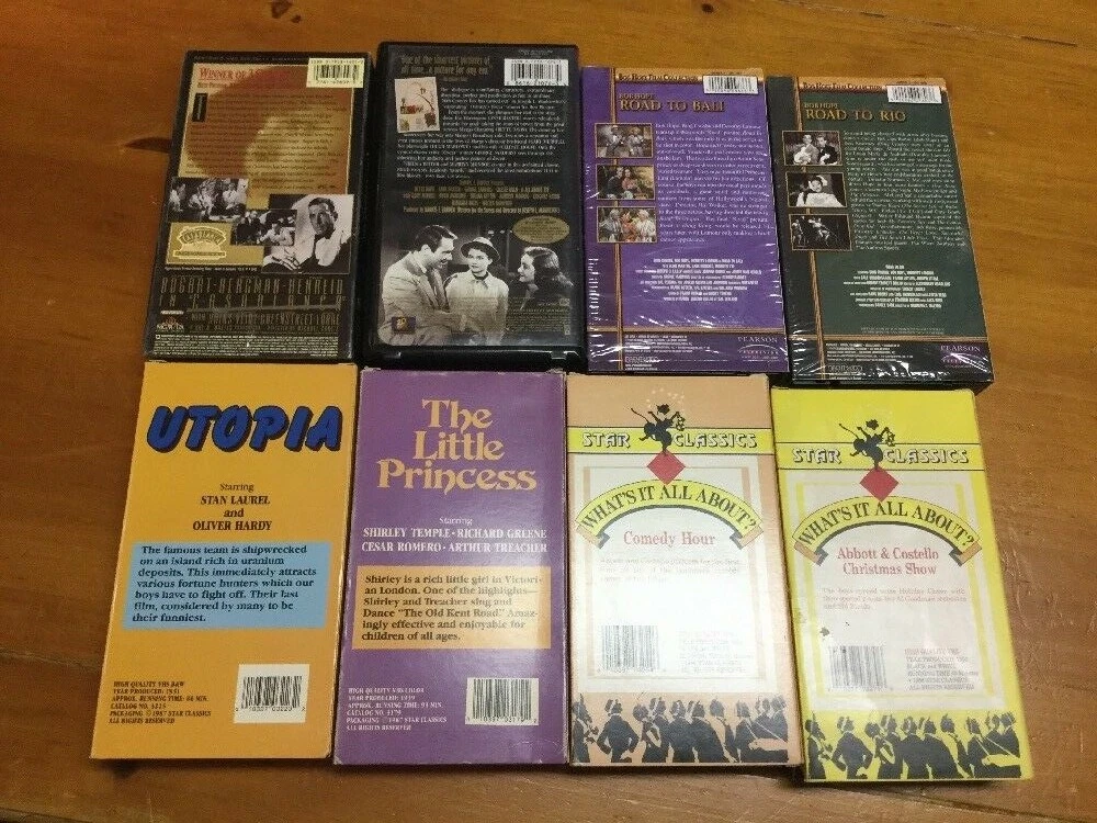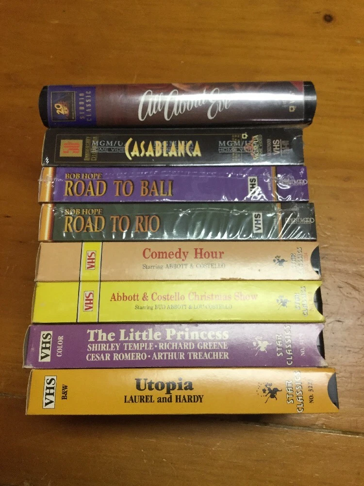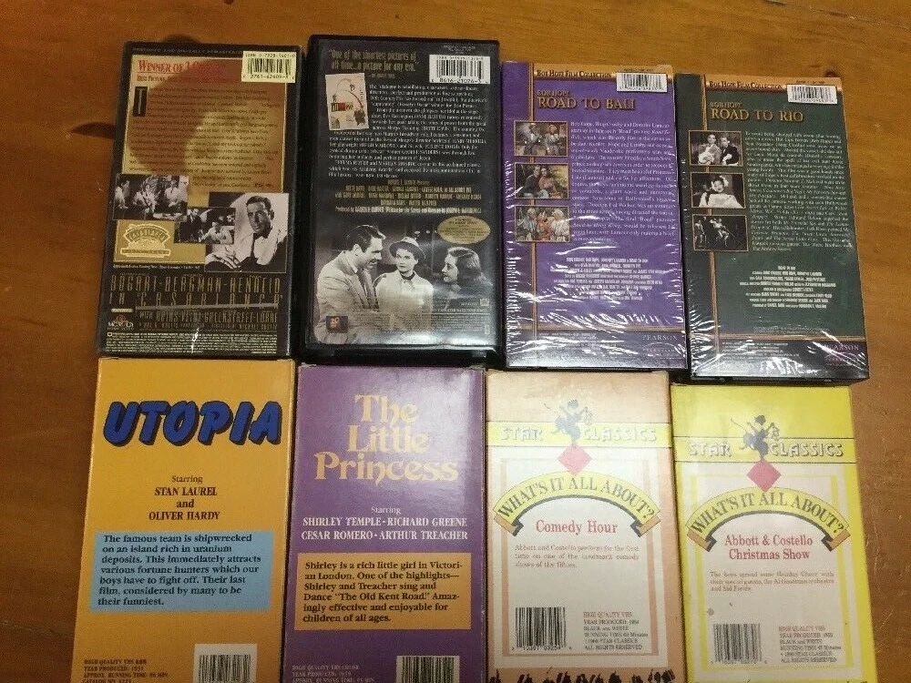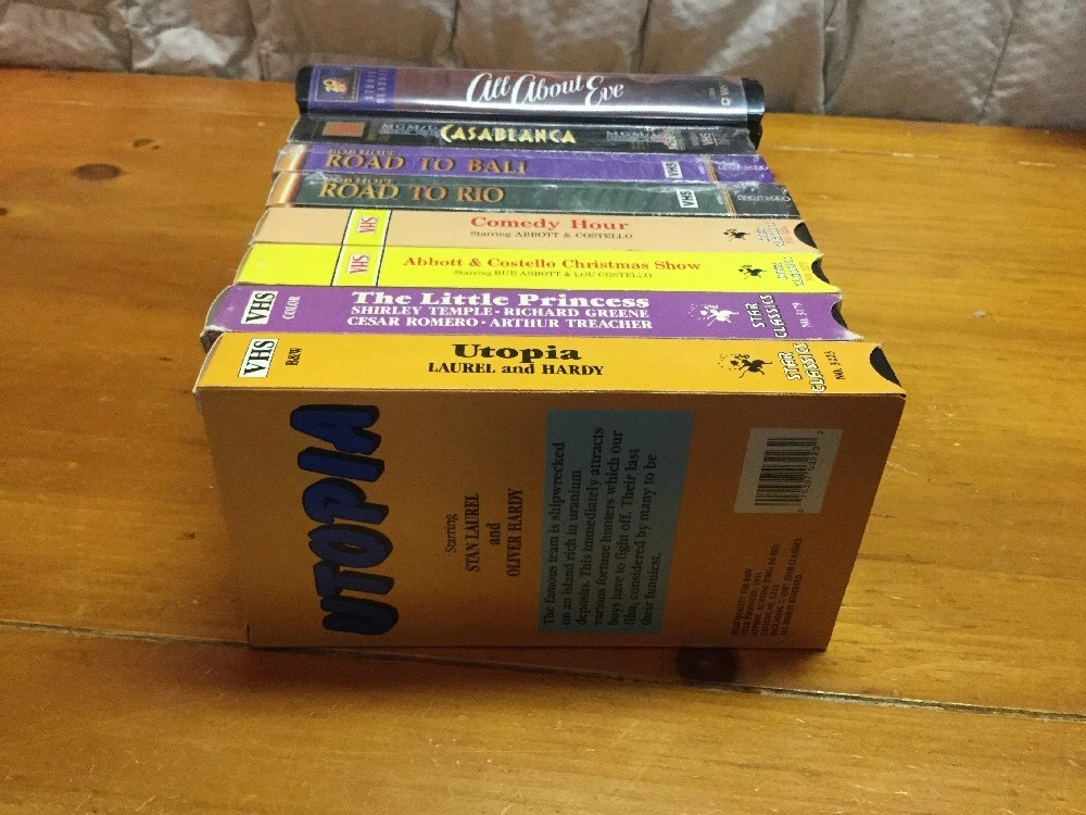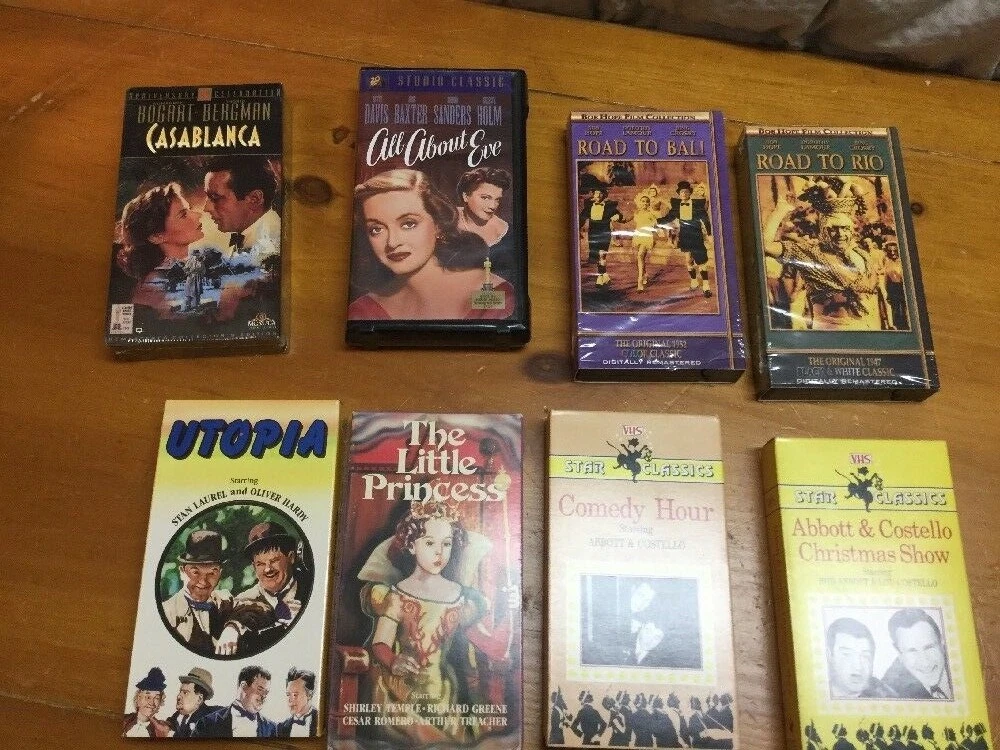 8 Classic Film VHS Tapes Movies Laurel & Hardy- Utopia Bud Abbott & Lou Costello- Comedy Hour, and Abbott and Costello Christmas Show Bob Hope & Bing Crosby - Road to Rio, and Road to Bali All About Eve Casablanca - Brand new, never opened. The little princess – starring Shirley temple and Cesar Romero Please see our other ads we are happy to combine shipping if you purchase more than one item. These tapes saw very little use, though untested they should still be in decent shape. Casablanca is brand new, the rest are in very good or like new condition. Thanks for looking!