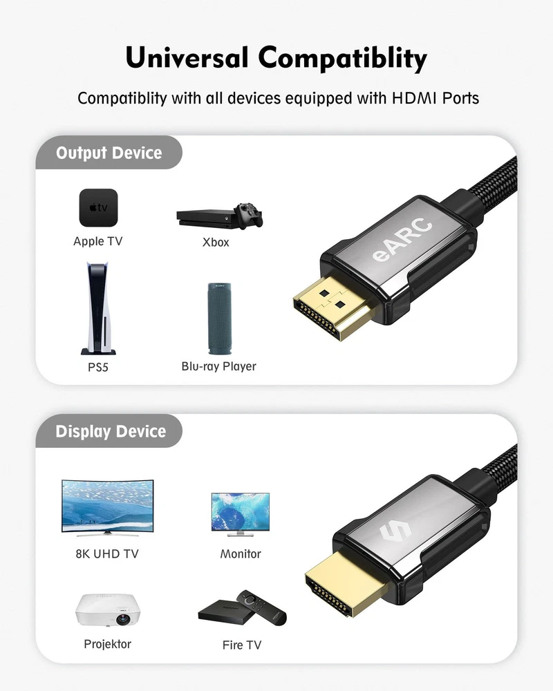 [Use for ARC/ eARC Audio] it is a standard HDMI 2.1 version cable,which are equipped with eARC technology. (Compatible with arc function) Supports the latest high-bitrate audio formats including DTS Master, DTS:X, Dolby Atoms, eARC. Provides enhanced support for your soundbar or AV receiver. In other words, your ears are in for a surprise. [HDR in 8K] This 8K HDMI Cable uses the most cutting-edge technology, allows for a brilliant, lifelike images. clearly displays every particle, and accurately processes every signal source. With 8K HDMI's unique dynamic HDR and 12 Bit color processing technology, each scene of the video is every frame, with more ideal depth, brightness, detail, contrast and wider color gamut. [Supports 120fps] Take your gaming to the next level. A 48Gbps higher bandwidth, especially suitable for the latest generation of game consoles. up to 120Hz/144Hz refresh rate at 4K resolution gives you an advantage over the competition. Pair with your Xbox Series X, PlayStation 5, or any other compatible gaming console or HDMI device to unleash the full potential and speed of 4K HDR. [Better Continuity] More expensive zinc alloy housing have excellent corrosion resistance. 24K gold-plated connectors and 3-layer copper shielding provides reliable connectivity and preserves signal purity. Less screen flickering, or white dots, more flawless videos. Withstands 25,000+ bends for strong durability. [Services you will also get]Originated from confidence in product quality. All costs covered during 2-year service of replacement process of this HDMI 2.1 Cable. Please contact us if you have any question, friendly and prompt customer service will be offered within 24 hours.