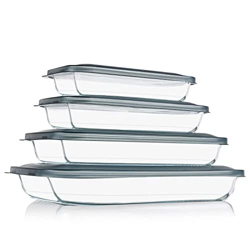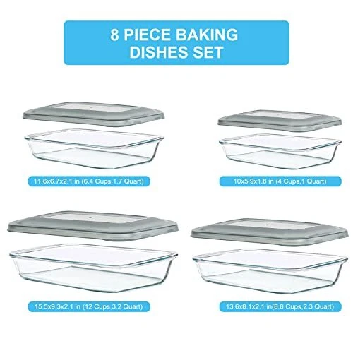 Return Policy Fast Delivery Trusted seller 8-Pieces Glass Baking Dish with Lids Rectangular Glass Baking Pan Bakeware Set with BPA Free Lids, Baking Pans for Lasagna, Leftovers, Cooking, Kitchen, Fridge-to-Oven, Nesting for Space-Saving Product Description BOROSILICATE GLASS BAKING PAN SET: These baking dishes are made of borosilicate glass, stronger and can adjust to temperature changes, goes straight from the refrigerator to the microwave or oven to the table and table-to-dishwasher without the risk of cracking or shattering. Cadmium and Lead free. STACKABLE LIDS: Comes with 4 convenient BPA-free plastic tight fitting lids, designed to keep moisture, heat contained and keep your food fresher. You can stack these 4 containers with lids on top of each other in your fridge or freezer for space saving storage. Also they can be nested without lids, easy to storage. The ideal set for baking, serving and storing food. CONVENIENT & ELEGANT DESIGN: The clear glass baking pan makes a charming decoration in your dining table and kitchen. You can also monitor the baking process and identify leftovers. With a widened, thickened, and anti-scalding handle, providing a safe and secure grip while taking to and from the oven. MULTI FUNCTIONAL: Includes 4 pieces pans of difference dimensions ( includes the ears' size): 1Quart (10 x 5.9 x 1.8-inch), 1.7Quart (11.6 x 6.7 x 2.1-inch), 2.3Quart (13.6 x 8.1 x 2.1-inch), and 3.2Quart (15.5 x 9.3 x 2.1-inch). Perfect for baking lasagna, casseroles, desserts, stews, spaghetti, brownies,chicken, meat, beef, vegetables and storage them as well and reheating leftovers and etc. 100% CUSTOMER SATISFACTION:Sometimes, accidents may happen during the shipping of our glass food storage containers. If they are cracked or broken, please inform us so that we can do our best to deal with your order for a full refund then make sure you are 100% satisfied with our product and service. Shipping Returns Payment Shipping Shipping is FREE to all addresses other than APO/PO boxes in the lower 48 states. All our stock ships from US-based warehouses. Shipped via USPS or UPS (depending on location and package weight) Unless stated otherwise, all orders will ship within 24-72 hours of your payment being processed. Check our feedback to see the great reviews of FAST shipping we offer. Returns Seller does not accept returns Payment We currently accept payment via eBay managed payments only. Once payment is cleared, we will dispatch your shipment within 1-3 business days. Please refer to the "Shipping" tab for more information regarding shipping speed to your destination.