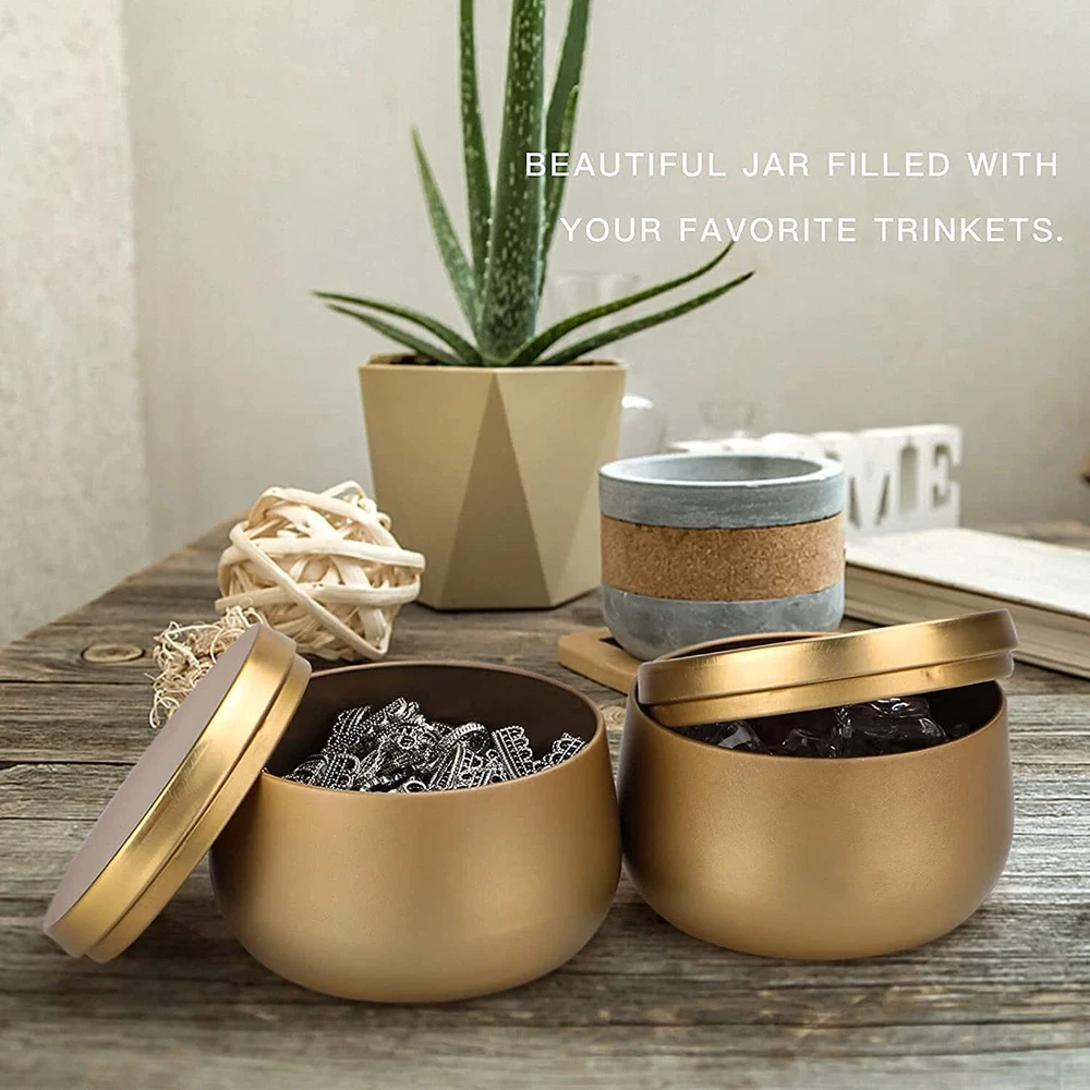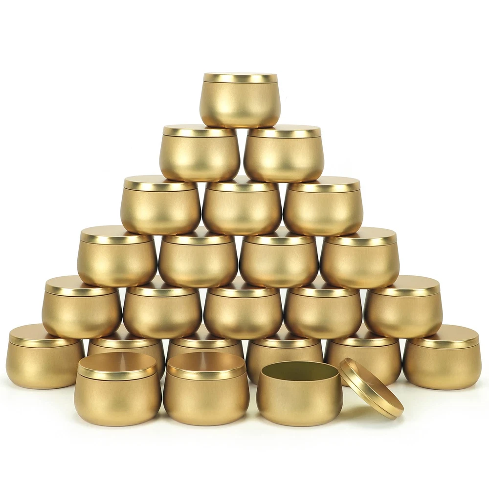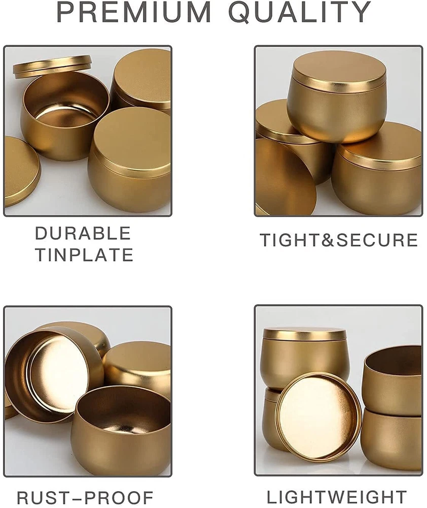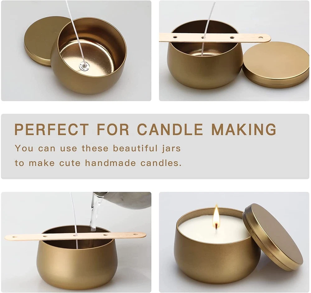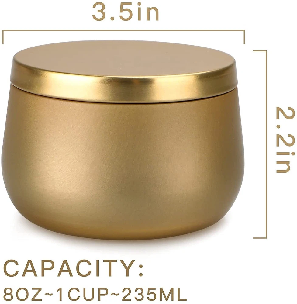 Candle Tins for Candle Making Specifications Colors: 24pcs gold tins Packing Quantity: 24Pieces Volume: 8 Ounce Size: 2.7'' Diameter x 2''H Material: Tinplate Style: Round with slip-on lid Features *Metal Tins24Piece Candle Tins Set including 24Pcs Small Pretty Tin Jars with lids included, you will love it! *DIY Candle Making Supplies Candles Tins 24Pack work great for candle making. Enough quantity for your DIY project usage. *Special Gift Portable Metal Tins are great Christmas gift, Birthday gift, Thanks giving gift for your mom, girlfriends, sisters, , candle making beginners and lovers. Exquisite graduation gift for her or him. Different Usage Small Storage Jars: These small candle containers can be used to many things, such as candy, cookies, coins, bracelets, etc. For Candle Making: If you want to make your own candle, the candle tins are good choice, its work great for candle making, small and portable. It can make beautiful jar candles for home. Home Decor Nursery Pots: Please don't think they are just ordinary tin. If you want to plant some succulent plants, for example cactus etc. Or some flowers and grass, put them on the dining table, coffee table, TV cabinet, balcony, it will make your room nice. CAPACITY: 8oz=1cup=240ml,SIZE: 2.2 inches tall by 3.5 inches diameter. WHAT'S INCLUDED: 24PCS 8-OUNCE Gold Candle Tins With Lids. QUALITY:These candle tins are made of tinplate,matte dold printing on the surface,golden printing on the inside. MULTI-USE: Use these tin containers for DIY Candle Making, party favors, candle tins, treasure boxes, jewelry storage, organization, office supplies, gift containers, candy cans. BULK CANDLE TINS:Offer bulk candle tins for small busniess and enterprise making candle.