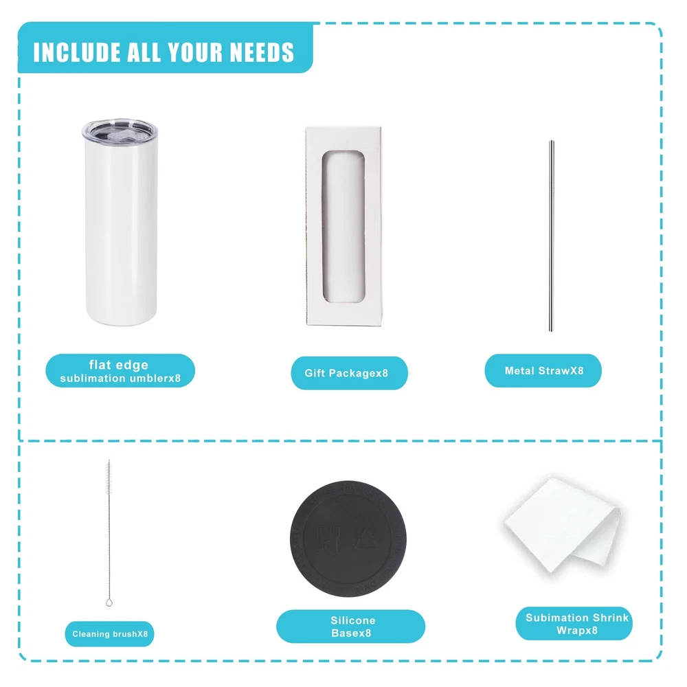 flat edge tumblers [Flat Edge] : This flat bottom is better for sublimation and won't make your bottom a mess. More suitable for your full design pattern. Package including: 8pcs 20oz sublimation tumbler,8pcs metal straw and straw brush,8pcs sliding lid ,8pcs Silicone base ,8pcs window white box 8pcs shrink flim If you choose heat press machine to sublimate your tumblers,Recommended time is 50 seconds,Recommended Temperature is 334 Degree Fahrenheit,If you choose oven to sublimate your tumbler, Recommend time is 6 minutes,Recommended temperature is 300 Degree Fahrenheit; Using shrink wrap can make your heat sublimation patterns better 20oz sublimation tumblers ,Double-Wall stainless steel Vacuum insulated ,keep cold for a night . absolutely straight, same size between top and bottom,and also the tumbler is ready with a polymer coating for Dye sublimation prints using heat press or convection oven.so it can allow you design your cups with your perssonal picture, which can be special gift for your friends or anybody you care.