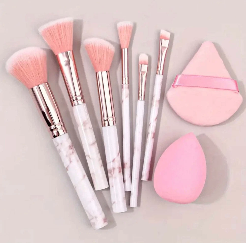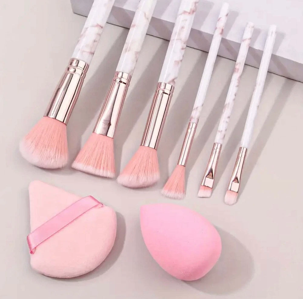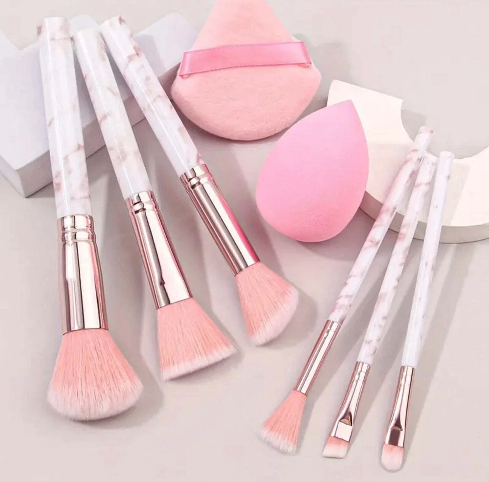 8pcs Pink Marble Makeup Brush Set with Blending Sponges - Includes Face, Eye &