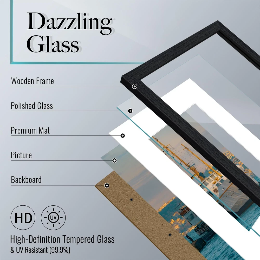 Award-Winning Design: Immerse yourself in the timeless elegance of Pennsylvania oak grain, masterfully reimagined in black by our independent designers team at . This tribute to classic craftsmanship fits seamlessly into any décor and brings a touch of sophistication to your life. FSC PREMIUM WOOD: Embrace the commitment of to sustainability and uncompromising quality. Our robust, long-lasting frames, echo our pledge to nature. Enhanced corners and backboards make sure your cherished moments are beautifully encased for eternity. PRODUCT FEATURES: Our versatile frame is perfect for displaying 8x10 without mat or 5x7 with mat photos. With the innovative design, you can effortlessly load your pictures and choose between horizontal or vertical display. Optimal View: Enjoy a new visual experience with our shatterproof HD tempered glass. Offering unparalleled UV ray protection and glare resistance, it's a safe and perfect choice for homes with children. Satisfied, or money back: At , we prioritize your satisfaction and strive for excellence in our product experience. We pack our frames securely to ensure a pristine condition upon arrival.