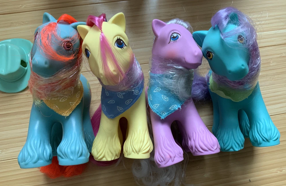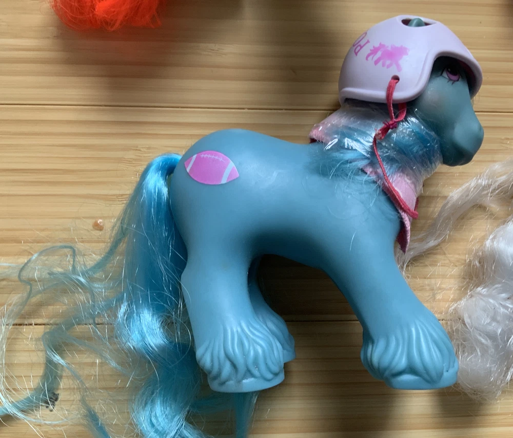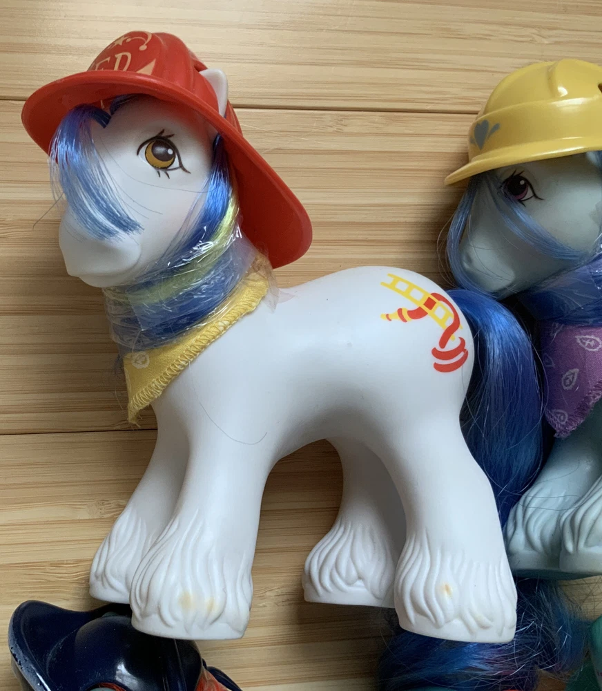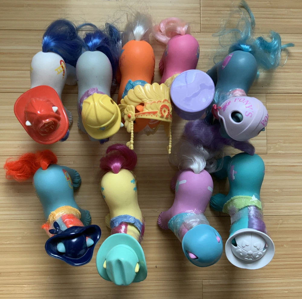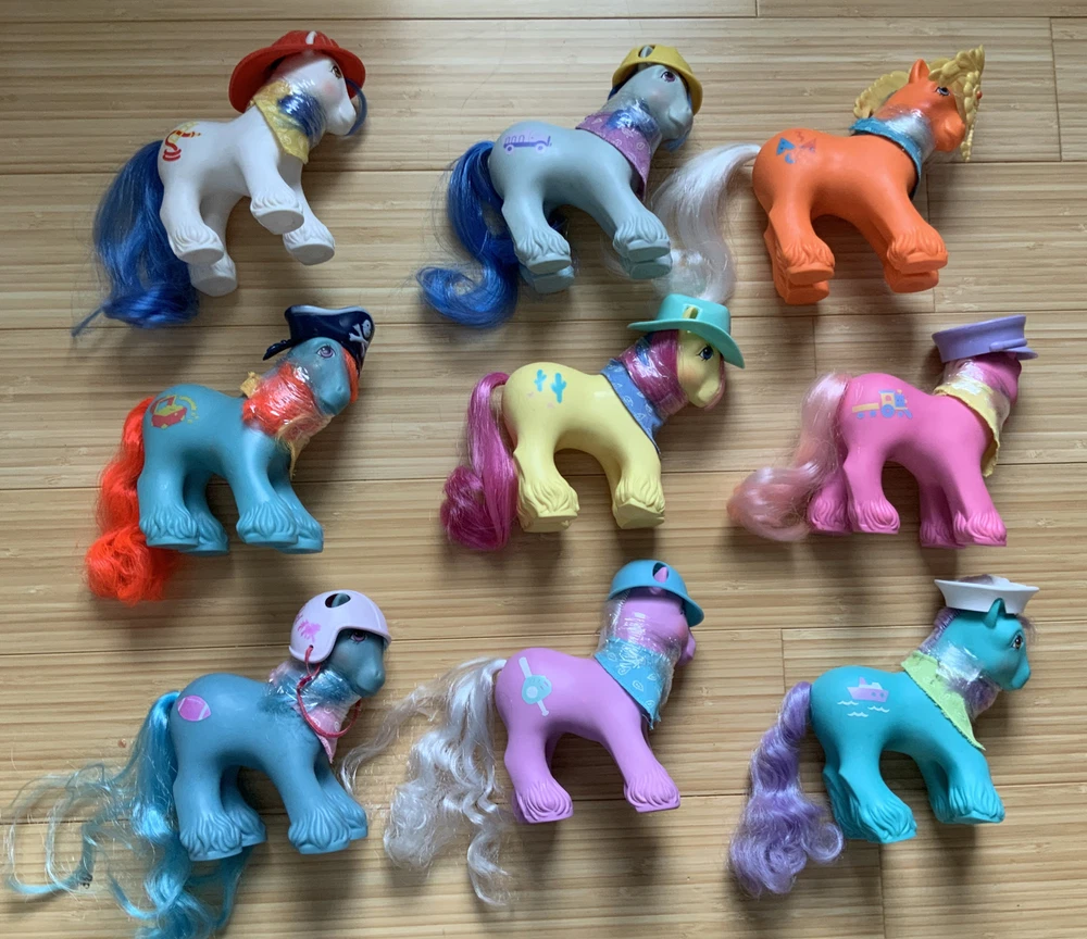 This lot is for ALL 9 My Little Pony Big Brother ponies! All with their hats and bandanas! These have been carefully stored with their manes wrapped for over 20 years. That being said, they still have some dots and/or discoloration due to their age. This is a perfect way to collect all of the US-released Big Brother ponies at once, either for yourself or maybe a holiday gift for someone else! Please check all pictures thoroughly and ask any and all questions before buying! You will receive: Chief - yellow spots on body 4-Speed - body does have marks and discoloration WigWam - looks good Quarterback - some marks and discolorations Steamer - some pink dots, light pen mark (?) on muzzle Pirate - marks on body, face - you can see some under right eye and left nostril Tex - couple of very light marks, clean Slugger - couple of pink dots Salty - couple of light marks From a non-smoking home! FAST shipping from US seller!