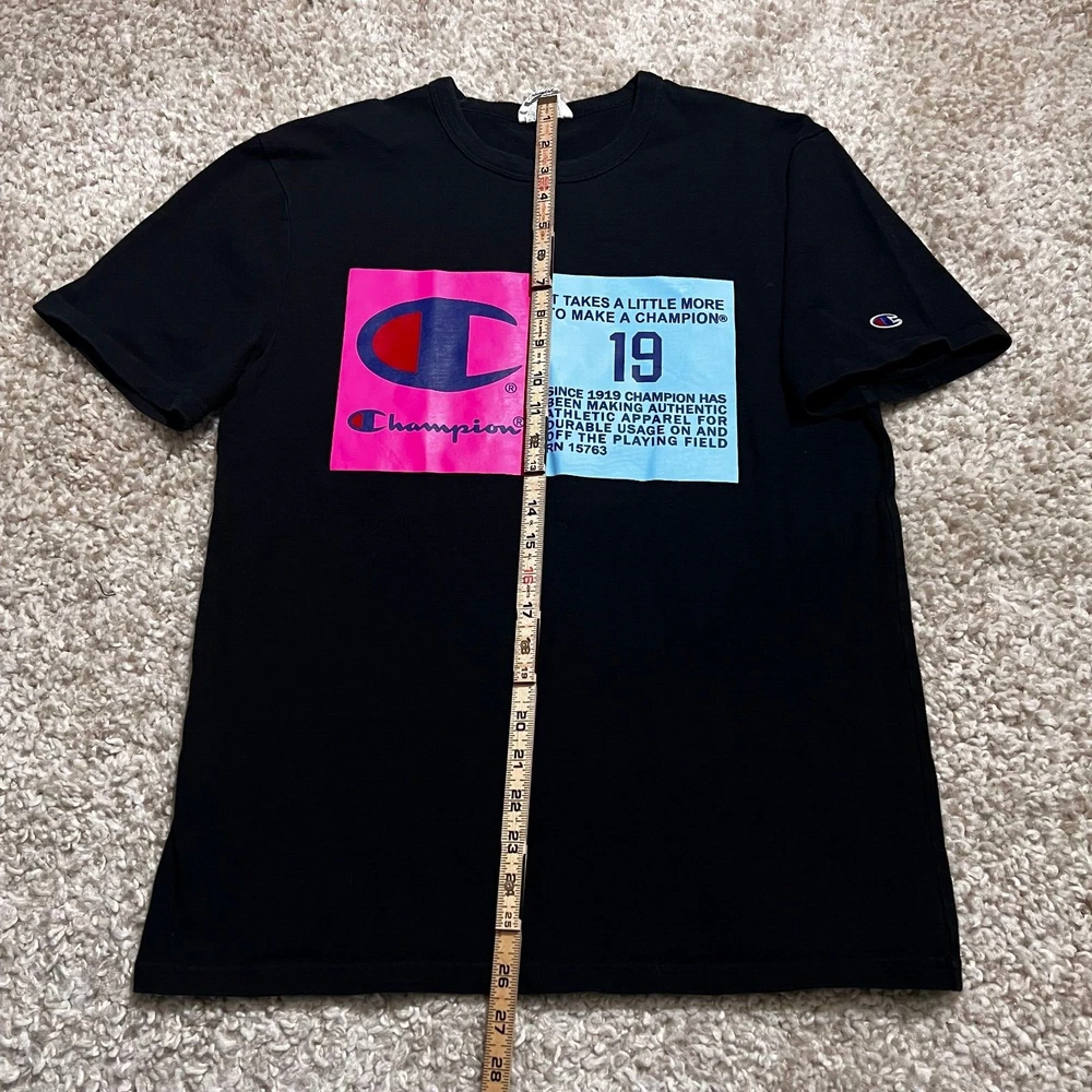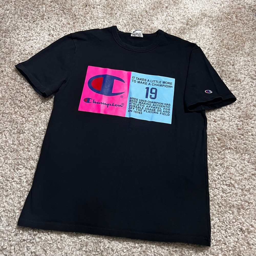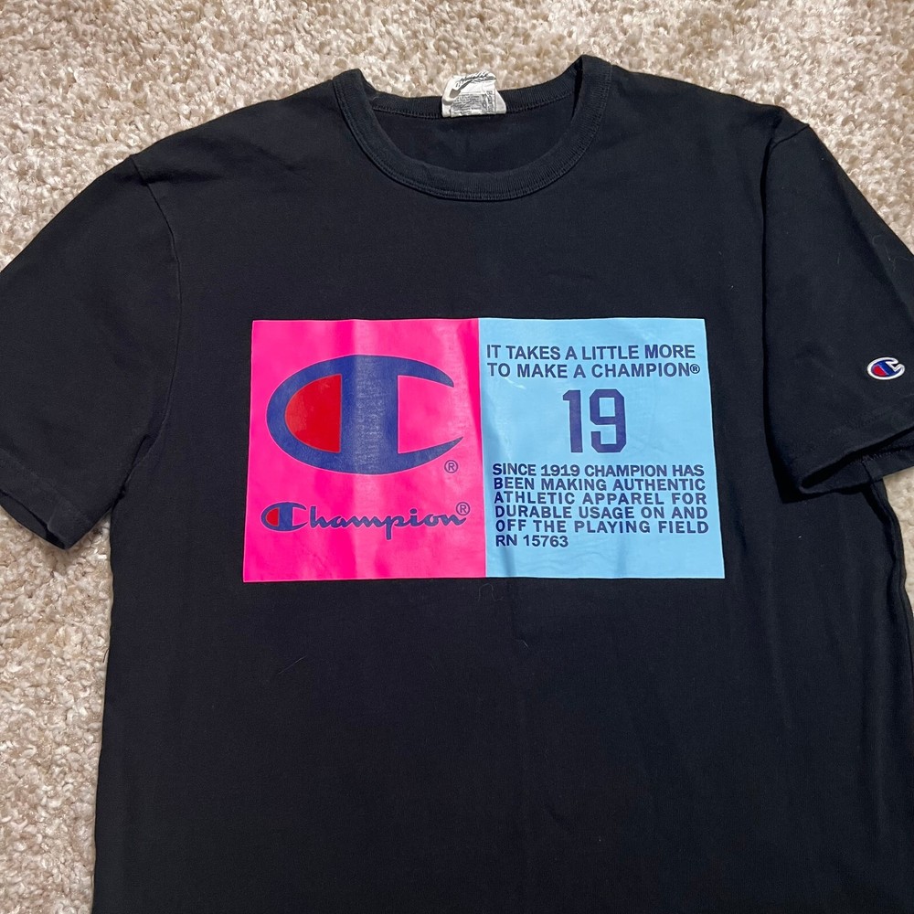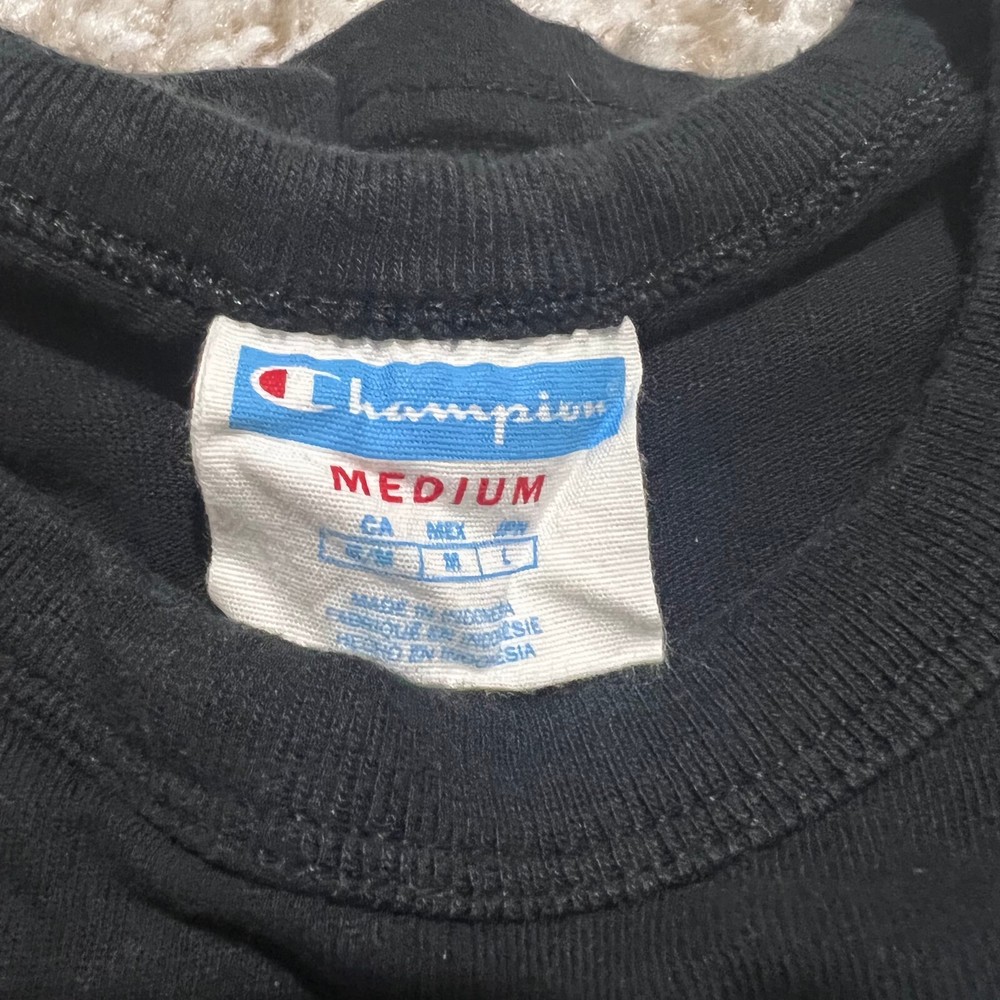 FOR SALE - VINTAGE Champion Shirt Men Medium Black 90s Blue Label Big Logo Casual Graph Tee Product Size : Mens - Medium Product Condition: Shirt is in very good used condition Measurements: All sizing and measurements provided in photos above. Please review before ordering. Shipping: I Ship Items Same Day or Guaranteed Next day After Payment Confirmation. Monday - Sunday. All Items Under 13 OZ are shipped Via USPS First Class. Global Shipping Available . Questions or Concerns: Please Don't Hesitate to ask any questions you may have I'm t raditionally always available to answer. FEEDBACK: Feedback is Important to us. If your satisfied with your purchase please leave a p ositive review. I appreciate your business!