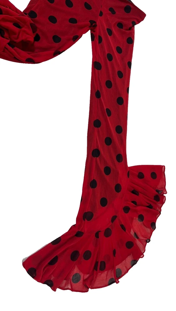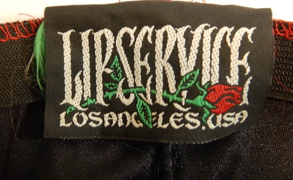 Vintage Lip Service pants, elastic waist. Low rise (7.5"). Inseam crotch to bottom of ruffle is 33". All the polka dots are black, for some reason some of them showed up white in the photos even though they aren't reflective that I can tell.