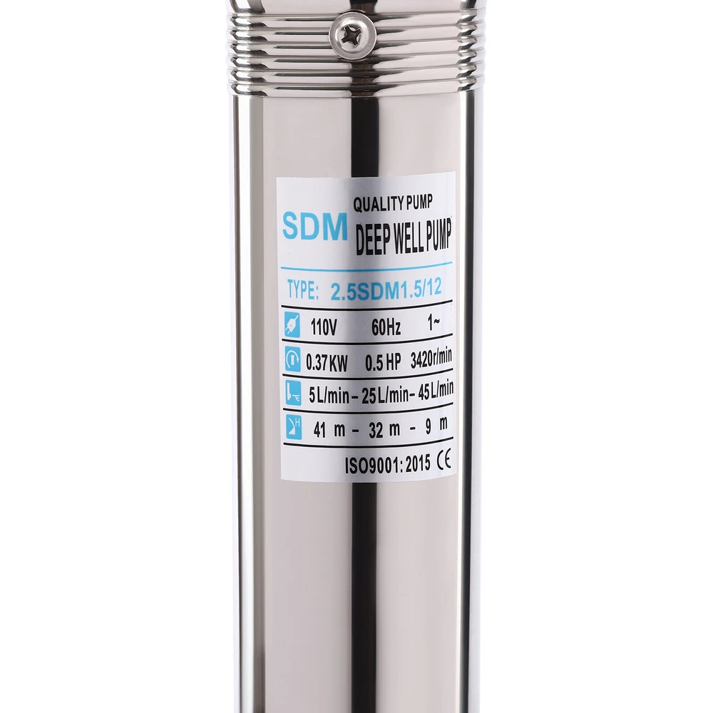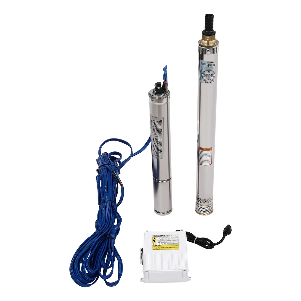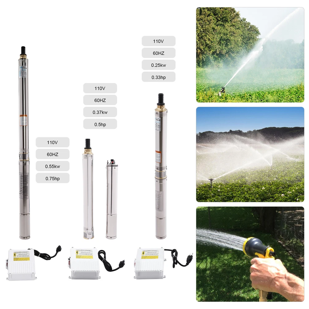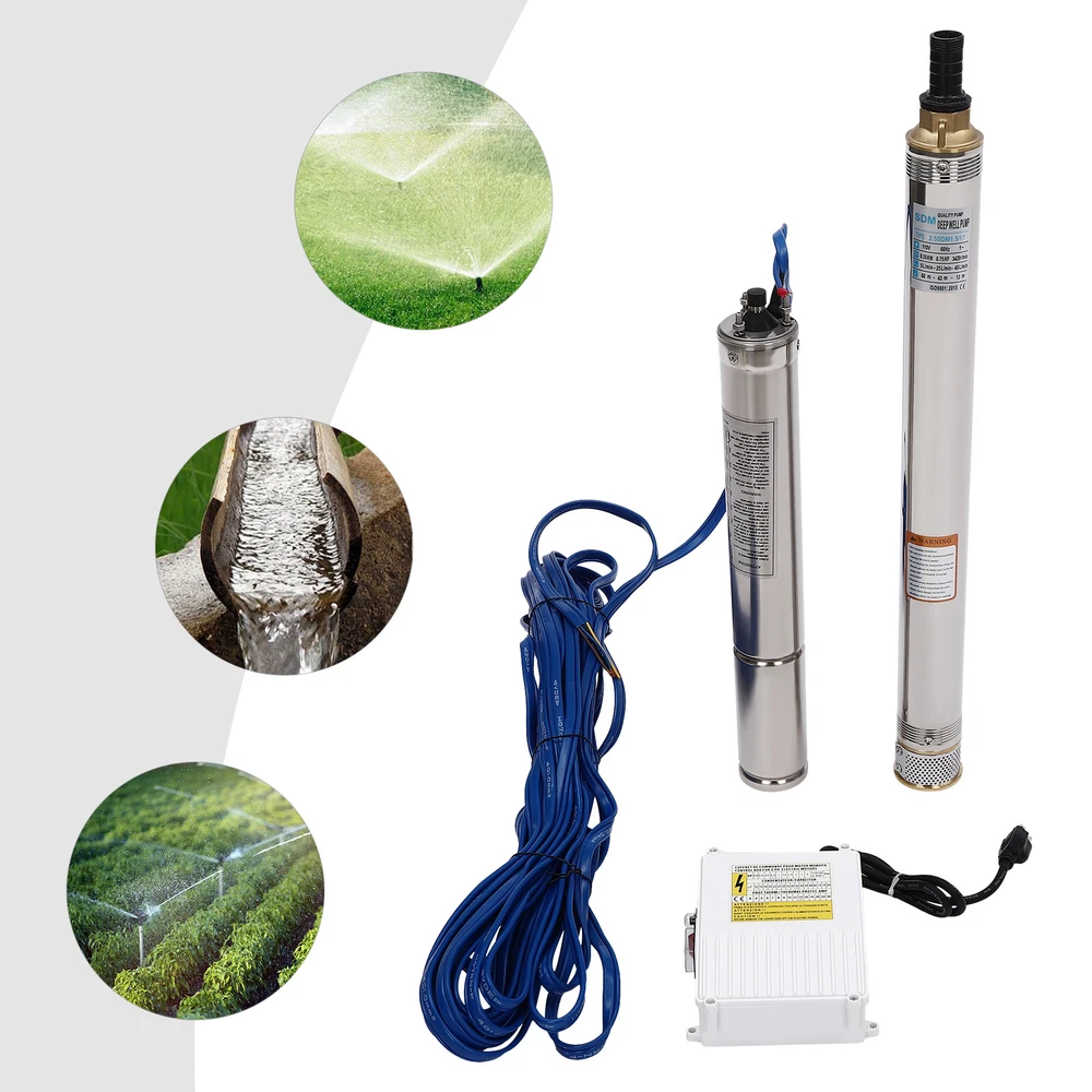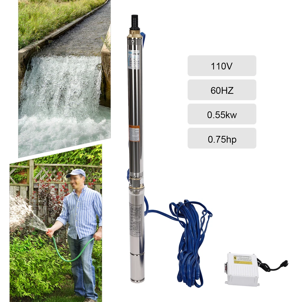 Type: 2.5SDM1.5/17 Power: 0.55KW(0.75HP) Delivery Lift: 13m/42.65ft, 43m/141ft, 60m/196.85ft Flow Rate: 5L/1.32gal/min, 25L/6.6gal/min, 45L/11.89gal/min Gross Weight: 12.5kg/27.56lbs Package Size: 96.5*26.5*11cm/37.99*10.43*4.33inch Product Size(D*H): 6.6*107.2cm/2.6*42.2in Type: 2.5SDM1.5/8 Power: 0.25KW(0.33HP) Delivery Lift: 6m/19.69ft, 21m/68.9ft, 28m/91.86ft Gross Weight: 9kg/19.84lbs Package Size: 105*11*20cm/41.34*4.33*7.87inch Product Size(D*H): 6.6*77.3cm/2.6*30.43in Type: 2.5SDM1.5/12 Power: 0.37KW(0.5HP) Delivery Lift: 9m/29.53ft, 32m/105ft, 41m/134.5ft Gross Weight: 10.2kg/22.49lbs Package Size: 125*20*11cm/49.21*4.33*7.87inch Product Size(D*H): 6.6*90.5cm/2.6*35.63in Package Included 1* Submersible Pump 1* Water Outlet 1* Control Box 1* English Manual 91.86/134.5/196.85 FT Deep Well Submersible Pump 1" Stainless Steel Water Pump Description If you're looking for an efficient and simple irrigation solution, take a look at our submersible pump, a jewel in the world of irrigation technology for its performance and ease of operation. This submersible pump's unique design of deep water and silent operation quietly provide your farmland with a constant supply of living water, making every inch of soil come alive, which is undoubtedly the ideal choice for scientific irrigation and improved agricultural efficiency. Key Features Build to Last : It is made of high-quality stainless steel, copper, plastic, and rubber, and adopts a polishing process, making it solid, and not prone to rust and corrosion, so it can remain beautiful and practical for a long time. High Efficiency: The 0.55/0.25/0.37KW submersible motor, 3420rpm speed, maximum 11.89gal flow rate with 17 impellers as well as a diffuser and intake screen make your pumping and watering work faster and easier. Large Delivery Lift: The maximum lift of the pump is 196.85/91.86/134.5ft, which allows you to irrigate farmland, fish ponds, and orchards for a long distance, saving the time and cost of manual transportation. Easy to Clean: Thanks to its smooth surface and simple structure, and it is used to work in water, so it is very easy to clean. Space-saving: Vertical construction and compact dimensions allow it to be used or stored in the trunk of a car without taking up too much space. Simple Installation: Simple construction and a detailed English manual make it easy to put together and get up and running quickly. Protective Package: Our product is packaged with a sponge to maximize protection from damage during shipping. Customer Service: We aim to provide quality products and services. If you have any problems, please feel free to contact us. We will reply and solve the problem for you as soon as possible. Details Standard Water Outlet: The pump adopts a 1-inch large diameter water outlet, which can be matched with different types of water pipes and is very practical. Long Cable: The 65.62ft long cable increases safety and convenience for you. Application This product is suitable for extracting groundwater from deep wells, and can also be used in water-lifting projects of rivers, reservoirs, canals, and so on. It can be used for farmland irrigation, and water for humans in mountainous areas, villages, homes, farms, campervans, cities, factories, and railways. Specifications Material: Stainless Steel, Copper, Plastic, Rubber Color: Silver and Blue Process: Polishing Assembly Required: Yes Power Source: Corded Electric Plug Type: US Standard Voltage: 110V, 60Hz Speed: 3420rpm Number of Impellers: 17 Outlet Diameter : 2.54cm/1in Cable Length: 20m/65.62ft Control Box Size: 18.5*15*6.8cm/7.28*5.91*2.68in Water Outlet Size(D*H): 2.54*5.5cm/1*2.17in Type: 2.5SDM1.5/17 Power: 0.55KW(0.75HP) Delivery Lift: 13m/42.65ft, 43m/141ft, 60m/ 196.85ft Flow Rate: 5L/1.32gal/min, 25L/6.6gal/min, 45L/11.89gal/min Gross Weight: 12.5kg /27.56lbs Package Size: 96.5*26.5*11cm/37.99*10.43*4.33inch Product Size(D*H): 6.6*107.2cm/2.6*42.2in Type: 2.5SDM1.5/8 Power: 0.25KW(0.33HP) Delivery Lift: 6m/19.69ft, 21m/68.9ft, 28m/ 91.86ft Gross Weight: 9kg /19.84lbs Package Size: 105*11*20cm/41.34*4.33*7.87inch Product Size(D*H): 6.6*77.3cm/2.6*30.43in Type: 2.5SDM1.5/12 Power: 0.37KW(0.5HP) Delivery Lift: 9m/29.53ft, 32m/105ft, 41m/ 134.5ft Gross Weight: 10.2kg /22.49lbs Package Size: 125*20*11cm/49.21*4.33*7.87inch Product Size(D*H): 6.6*90.5cm/2.6*35.63in Package Included 1* Submersible Pump 1* Water Outlet 1* Control Box 1* English Manual Notes Please check that the voltage and frequency correspond to local standards before ordering. Please do not use it without water. Please note that the pump needs to be installed vertically. Please note that the pumping speed is related to the depth at which the water pump enters the water, and the deeper the depth, the lower the speed. Please note that this product is only suitable for pumping clear water, not oil, chemical raw materials, and other liquids. Please read the operating manual and label completely before use, and pay particular attention to the safety instructions included. Please allow the slight color difference caused by the shooting light and 1-3cm error due to manual measurement, and make sure you do not mind before ordering. Payment Delivery details Terms of sales About us Contact us Payment We accept ebay payment 。 Fees such as import duties, taxes are not included in the item price or shipping costs. These charges are the buyer's responsibility. Delivery details Shipping: 2-9 working days to: USA Terms of sales We maintain high standards of excellence and strive for hundred percent customer satisfaction. Feedback is very important to us. We hope that you contact us immediately before you give neutral or negative feedback, so that we can address your concerns. It is impossible to address issues if we do not know about them! About us Your satis faction is our ultimate goal. We work hard to earn your trust and future business. Our certified technicians have tested each item before shipping. The unit 