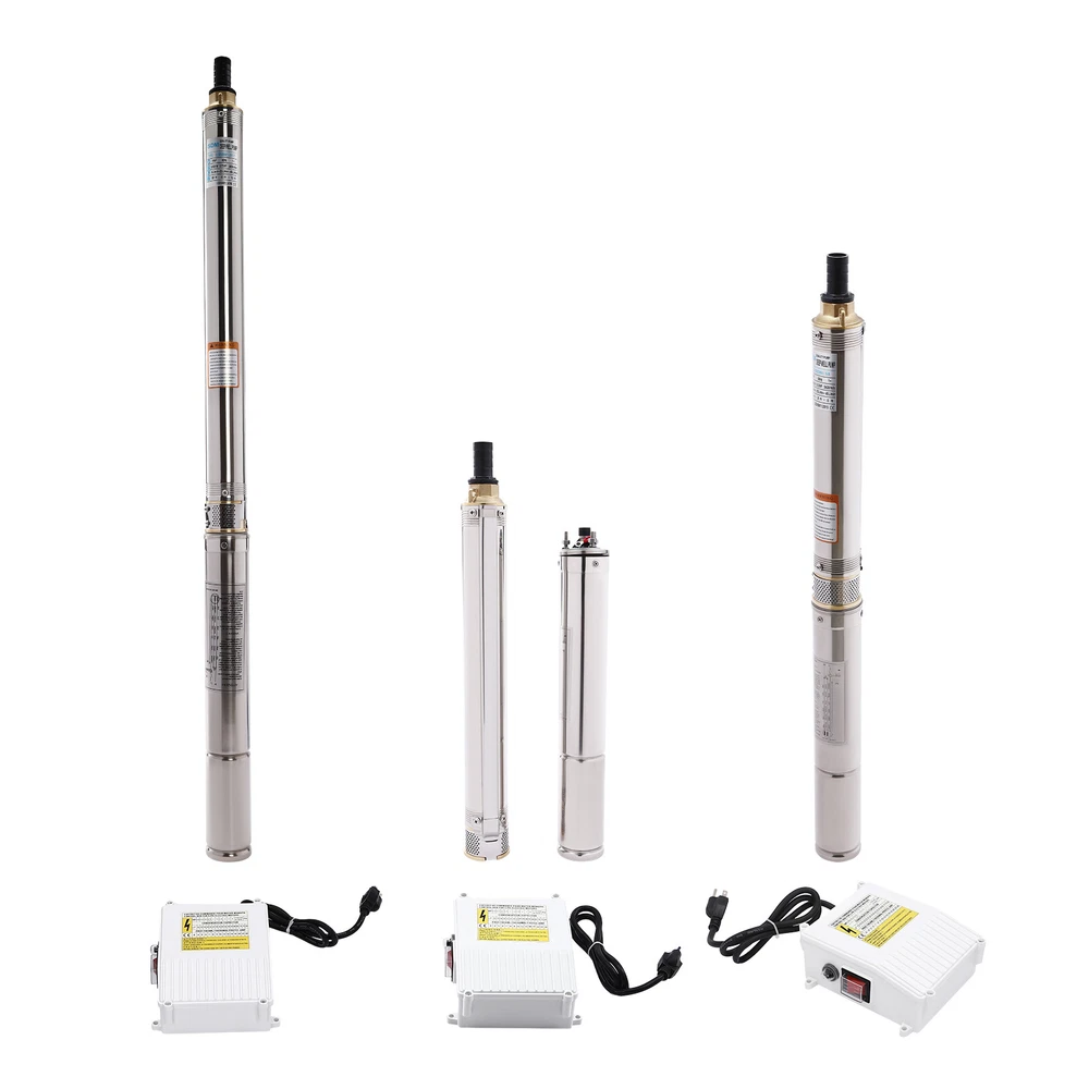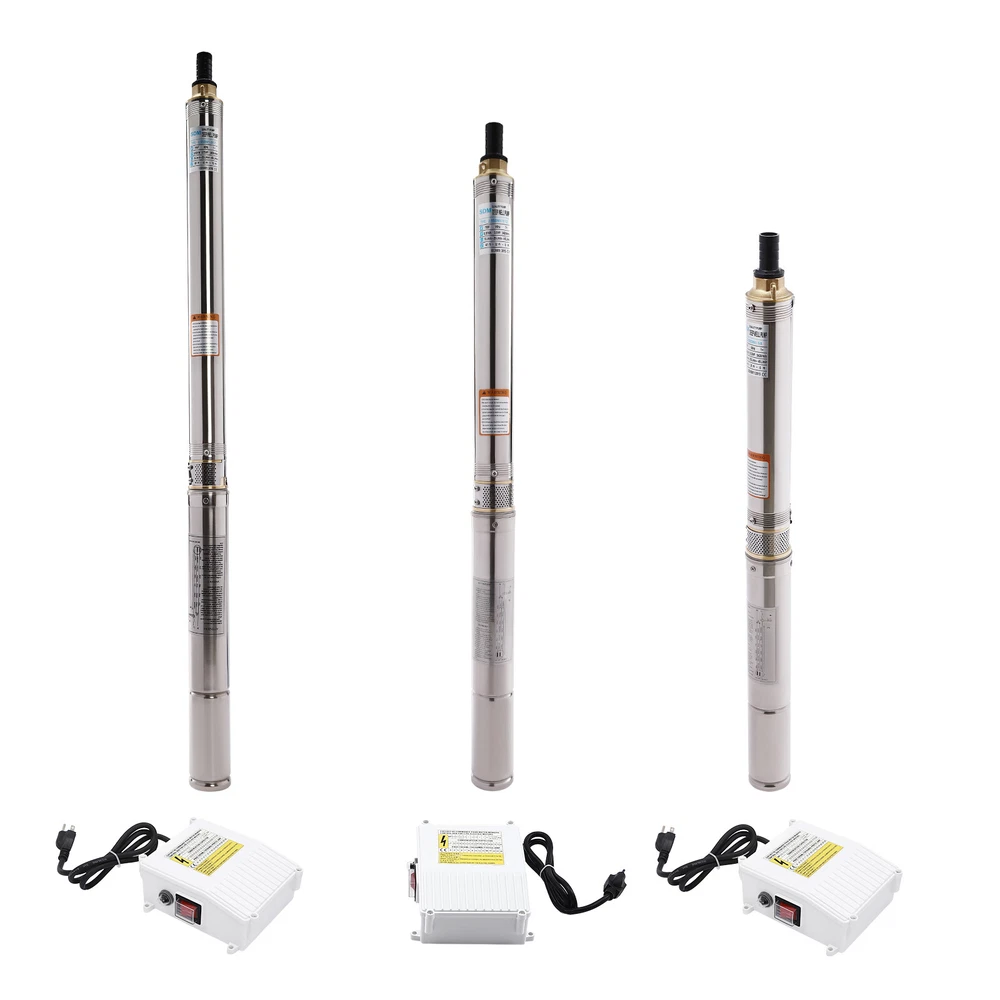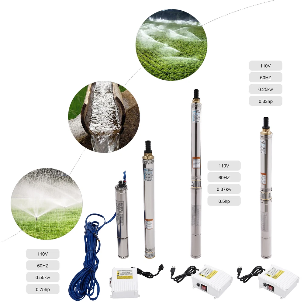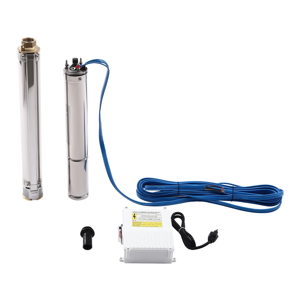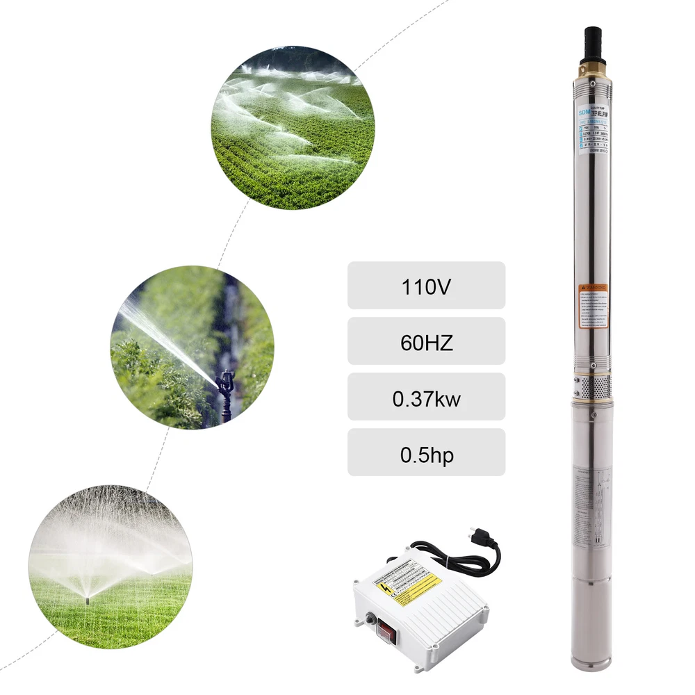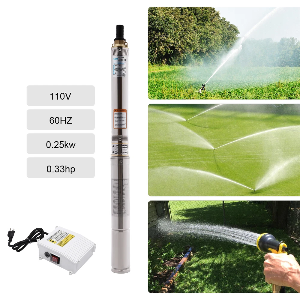 Type: 2.5SDM1.5/17 Power: 0.55KW(0.75HP) Delivery Lift: 13m/42.65ft, 43m/141ft, 60m/196.85ft Flow Rate: 5L/1.32gal/min, 25L/6.6gal/min, 45L/11.89gal/min Gross Weight: 12.5kg/27.56lbs Package Size: 96.5*26.5*11cm/37.99*10.43*4.33inch Product Size(D*H): 6.6*107.2cm/2.6*42.2in Type: 2.5SDM1.5/8 Power: 0.25KW(0.33HP) Delivery Lift: 6m/19.69ft, 21m/68.9ft, 28m/91.86ft Gross Weight: 9kg/19.84lbs Package Size: 105*11*20cm/41.34*4.33*7.87inch Product Size(D*H): 6.6*77.3cm/2.6*30.43in Type: 2.5SDM1.5/12 Power: 0.37KW(0.5HP) Delivery Lift: 9m/29.53ft, 32m/105ft, 41m/134.5ft Gross Weight: 10.2kg/22.49lbs Package Size: 125*20*11cm/49.21*4.33*7.87inch Product Size(D*H): 6.6*90.5cm/2.6*35.63in Package Included 1* Submersible Pump 1* Water Outlet 1* Control Box 1* English Manual 91.86/134.5/196.85 FT Deep Well Submersible Pump 1" Stainless Steel Water Pump Description If you're looking for an efficient and simple irrigation solution, take a look at our submersible pump, a jewel in the world of irrigation technology for its performance and ease of operation. This submersible pump's unique design of deep water and silent operation quietly provide your farmland with a constant supply of living water, making every inch of soil come alive, which is undoubtedly the ideal choice for scientific irrigation and improved agricultural efficiency. Key Features Build to Last : It is made of high-quality stainless steel, copper, plastic, and rubber, and adopts a polishing process, making it solid, and not prone to rust and corrosion, so it can remain beautiful and practical for a long time. High Efficiency: The 0.55/0.25/0.37KW submersible motor, 3420rpm speed, maximum 11.89gal flow rate with 17 impellers as well as a diffuser and intake screen make your pumping and watering work faster and easier. Large Delivery Lift: The maximum lift of the pump is 196.85/91.86/134.5ft, which allows you to irrigate farmland, fish ponds, and orchards for a long distance, saving the time and cost of manual transportation. Easy to Clean: Thanks to its smooth surface and simple structure, and it is used to work in water, so it is very easy to clean. Space-saving: Vertical construction and compact dimensions allow it to be used or stored in the trunk of a car without taking up too much space. Simple Installation: Simple construction and a detailed English manual make it easy to put together and get up and running quickly. Protective Package: Our product is packaged with a sponge to maximize protection from damage during shipping. Customer Service: We aim to provide quality products and services. If you have any problems, please feel free to contact us. We will reply and solve the problem for you as soon as possible. Details Standard Water Outlet: The pump adopts a 1-inch large diameter water outlet, which can be matched with different types of water pipes and is very practical. Long Cable: The 65.62ft long cable increases safety and convenience for you. Application This product is suitable for extracting groundwater from deep wells, and can also be used in water-lifting projects of rivers, reservoirs, canals, and so on. It can be used for farmland irrigation, and water for humans in mountainous areas, villages, homes, farms, campervans, cities, factories, and railways. Specifications Material: Stainless Steel, Copper, Plastic, Rubber Color: Silver and Blue Process: Polishing Assembly Required: Yes Power Source: Corded Electric Plug Type: US Standard Voltage: 110V, 60Hz Speed: 3420rpm Number of Impellers: 17 Outlet Diameter : 2.54cm/1in Cable Length: 20m/65.62ft Control Box Size: 18.5*15*6.8cm/7.28*5.91*2.68in Water Outlet Size(D*H): 2.54*5.5cm/1*2.17in Type: 2.5SDM1.5/17 Power: 0.55KW(0.75HP) Delivery Lift: 13m/42.65ft, 43m/141ft, 60m/ 196.85ft Flow Rate: 5L/1.32gal/min, 25L/6.6gal/min, 45L/11.89gal/min Gross Weight: 12.5kg /27.56lbs Package Size: 96.5*26.5*11cm/37.99*10.43*4.33inch Product Size(D*H): 6.6*107.2cm/2.6*42.2in Type: 2.5SDM1.5/8 Power: 0.25KW(0.33HP) Delivery Lift: 6m/19.69ft, 21m/68.9ft, 28m/ 91.86ft Gross Weight: 9kg /19.84lbs Package Size: 105*11*20cm/41.34*4.33*7.87inch Product Size(D*H): 6.6*77.3cm/2.6*30.43in Type: 2.5SDM1.5/12 Power: 0.37KW(0.5HP) Delivery Lift: 9m/29.53ft, 32m/105ft, 41m/ 134.5ft Gross Weight: 10.2kg /22.49lbs Package Size: 125*20*11cm/49.21*4.33*7.87inch Product Size(D*H): 6.6*90.5cm/2.6*35.63in Package Included 1* Submersible Pump 1* Water Outlet 1* Control Box 1* English Manual Notes Please check that the voltage and frequency correspond to local standards before ordering. Please do not use it without water. Please note that the pump needs to be installed vertically. Please note that the pumping speed is related to the depth at which the water pump enters the water, and the deeper the depth, the lower the speed. Please note that this product is only suitable for pumping clear water, not oil, chemical raw materials, and other liquids. Please read the operating manual and label completely before use, and pay particular attention to the safety instructions included. Please allow the slight color difference caused by the shooting light and 1-3cm error due to manual measurement, and make sure you do not mind before ordering. Payment Delivery details Terms of sales About us Contact us Payment We accept ebay payment 。 Fees such as import duties, taxes are not included in the item price or shipping costs. These charges are the buyer's responsibility. Delivery details Shipping: 2-9 working days to: USA Terms of sales We maintain high standards of excellence and strive for hundred percent customer satisfaction. Feedback is very important to us. We hope that you contact us immediately before you give neutral or negative feedback, so that we can address your concerns. It is impossible to address issues if we do not know about them! About us Your satis faction is our ultimate goal. We work hard to earn your trust and future business. Our certified technicians have tested each item before shipping. The unit 
