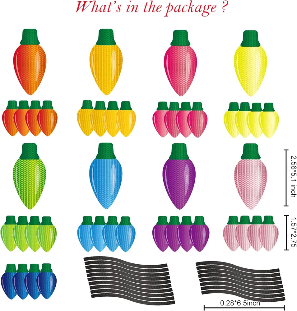 Store New Arrivals Add to Favorite View Feedback Contact Fast deliveries to the customer's home Quality customer service John Make the customers happy! 92 Pieces Christmas Car Refrigerator Decorations,44Pcs Reflective Light Bulb Magnets 48PCS Magnetic Wires Holiday Birthday Cruise Ship Door Mailbox Window Decors Description Package includes: You will receive 8 pieces big reflective lights bulb car magnets,36 pieces small reflective lights bulb and 48 pieces of magnet wires, sufficient amounts to meet your daily usages or festival decoration needs. Material: Made of reflective film and magnetic back. These reflective Christmas bulb magnets appear to be illuminated when the headlights hit them. They glow in the sunlight, just like real light bulbs. This is a fun way to dress up your car for the holidays. Ornaments:These magnets hold the car well in rain, wind, snow, or at high speeds. Make sure the surface is clean and dry before sticking them on. Where to Use: Suitable for any metal surface. Suitable for your cruise ship door ,car, vehicle, Jeep, van, truck, garage door, refrigerator, mailbox, metal desk, metal door, mini fridge, school locker, school bus, dry erase board, magnetic board, dishwasher, file cabinet, etc.Note: Some cars have all-aluminum bodies and the tiles don't stick to them very well. And the sticker is easy to stick on and take off, be careful not to get stolen! Rich and diverse: The reflective magnet is designed in the shape of a light bulb and comes in six colors: yellow, pink, purple, blue, red and green to add color to your home and party and create a warm and happy atmosphere.If the product has any quality or any problem, we will unconditionally return or exchange. Product Description Christmas Decorations Magnetic Christmas Lights for Car Features & Benefits: The combination of 8 large reflective bulbs magnets, 36pcs small christmas bulb magnets and 48pcs line magnets form a great decoration for car and home decoration. Reflective and removable, our bulb magnets suitable for most metal surface, perfect for your car, garage door, refrigerator, mailbox, magnetic board and so on, creating strong festive and joyful atmosphere. Package includes: 8 x Big Reflective Magnetic Bulbs 36 x Small Reflective Magnetic Bulbs 48 x Line Christams Magnets Christmas Magnets Christmas Car Decoration These Christmas car ornaments are one of the easiest ways to make your car one of the most festive and sparkling vehicles on the road. If the lights shine onto the reflective Christmas car magnets, the effect will be even better. The bright light will make the flashing from the Christmas magnets even more dazzling. Attach them to your vehicle/refrigerator/mailbox/garage door/metal trash can, and make your Christmas more festive! It is suitable for any metal surface, including your car, truck, trailer, garage door, refrigerator, mailbox, metal table, metal door, mini fridge, school lockers, school bus, whiteboard, magnetic board, dishwasher, filing cabinet, etc. Please note: It may not stick to Jeep or Ford cars because some Jeep or Ford cars are not made of metal. Item model number BXTDP Unit Count 62.0 Count Color Colourful Material reflective film, magnet Country of Origin China Item Weight 14.4 ounces Shape Bulb-shaped Package Dimensions 8.43 x 6.38 x 0.59 inches Number of Pieces 62 ABOUT US We offer the best prices around on high quality products. Our E-store includes media such as books, movies, music and games while offering electronics, toys, sporting apparel, clothing, tools, general home, garden items and more. SHIPPING We are always working hard to ensure your package arrives as soon as possible. Please understand that some factors like weather, high postal traffic, and the performance of shipping companies are outside of our control. We offer free shipping to the lower 48 states and ship within 2 business days of payment, usually sooner. We do not accept P.O. Boxes. Please provide a physical address. For shipping outside of the continental USA, we only use eBay's Global Shipping Program. The item is shipped to KY and then sent to the rest of the world. International customers are responsible for all duties and taxes. Continue to 'check out' to calculate costs for shipping the item to your country. Messages regarding eBay's Global Shipping Program MUST be directed at eBay EXCLUSIVELY. RETURNS We offer a 30-Day Return Policy on items in which you are not completely satisfied with. You have the option of a full-refund or an exchange of the item. No returns are available on items shipped outside of the USA PAYMENT We accept PayPal. CONTACT US This page content is yet to come Please ad us to your favorite seller and visit again later Thank You CUSTOMER SATISFACTION We try our very best to make sure every customer is completely satisfied. If there's a problem, message us! We're happy to help. WE ACCEPT