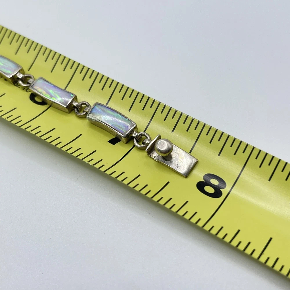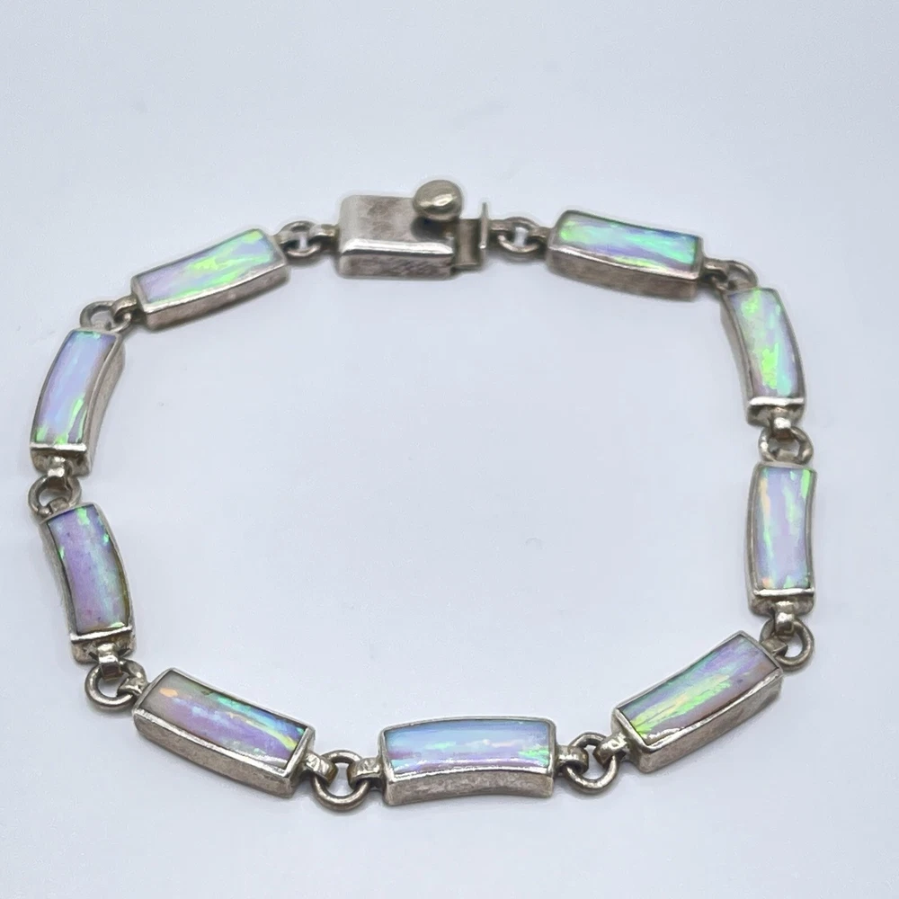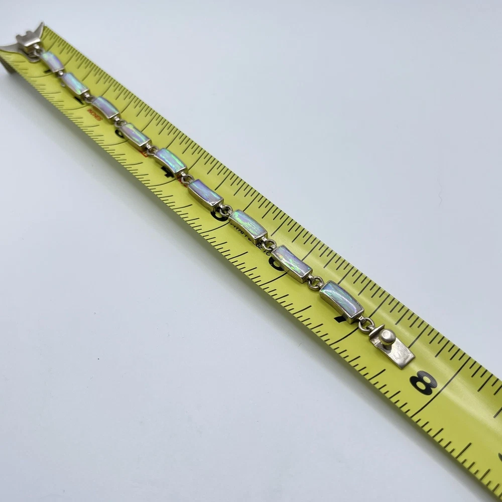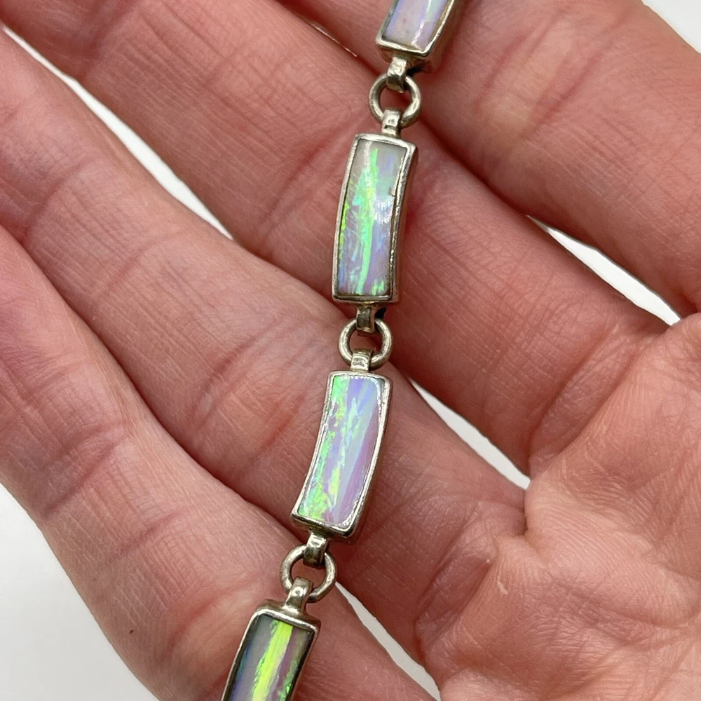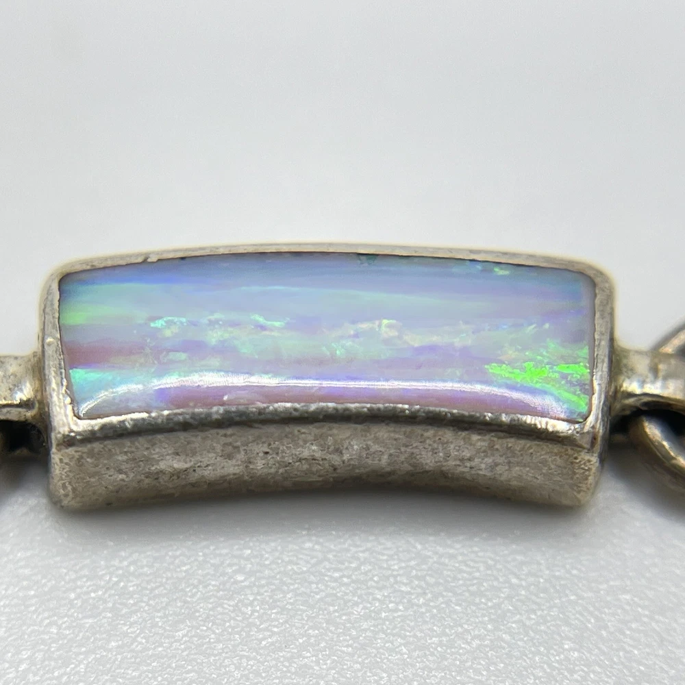 This beautiful bracelet is a unique piece of jewelry that features a stunning white opal stone. The opals are set in 950 sterling silver that has a rectangular shape and a round link chain type. The bracelet is 7.5 inches in length and is designed with a vintage style that adds a touch of ethnic beauty to any outfit. The bracelet is made in Mexico and it boasts of nine opals that are carefully crafted to create a masterpiece.
