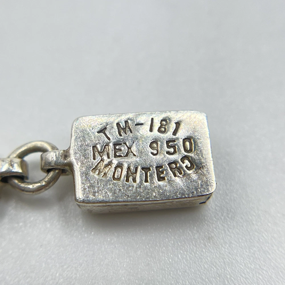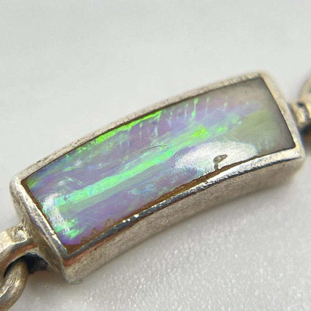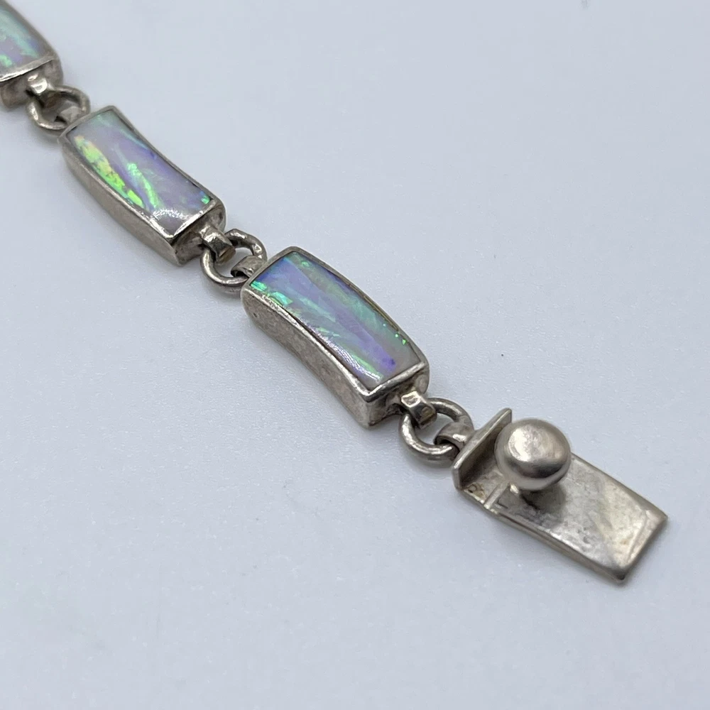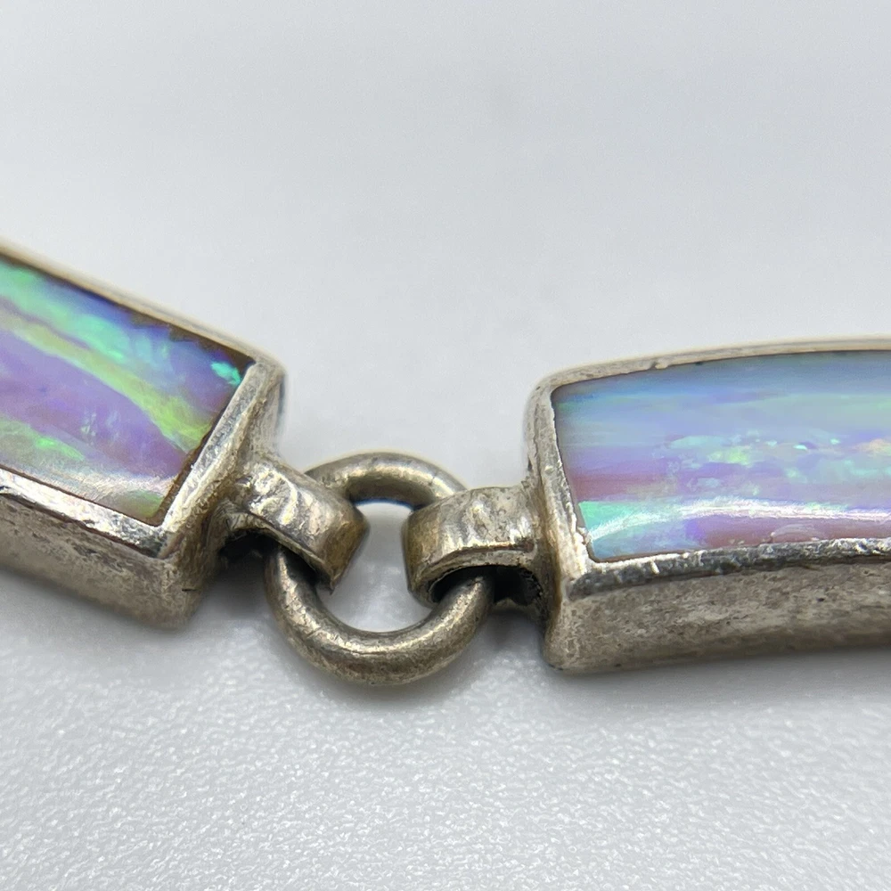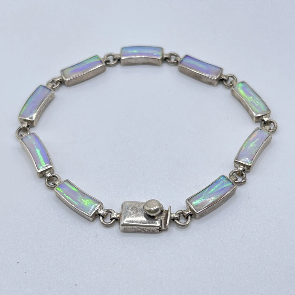 This beautiful bracelet is a unique piece of jewelry that features a stunning white opal stone. The opals are set in 950 sterling silver that has a rectangular shape and a round link chain type. The bracelet is 7.5 inches in length and is designed with a vintage style that adds a touch of ethnic beauty to any outfit. The bracelet is made in Mexico and it boasts of nine opals that are carefully crafted to create a masterpiece.
