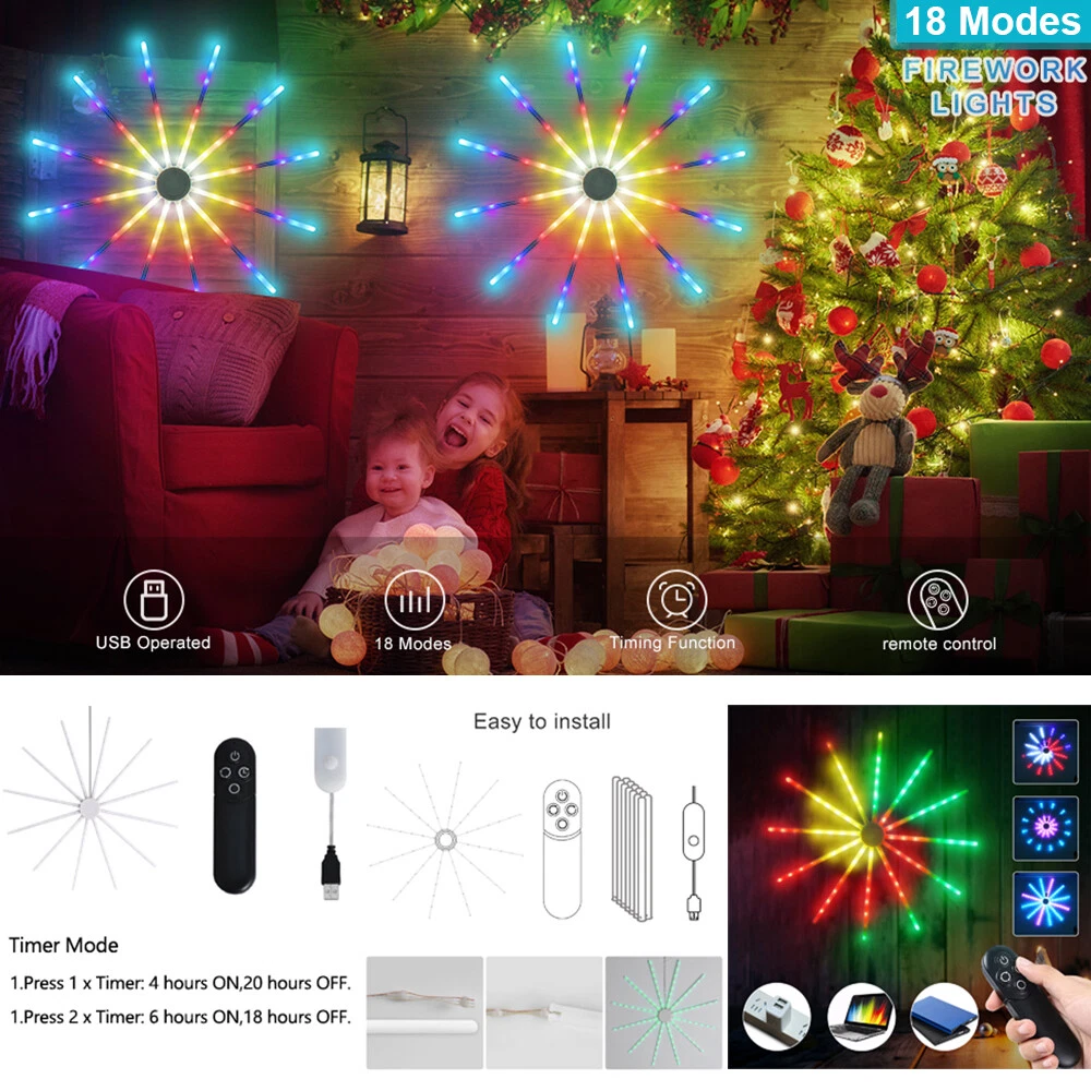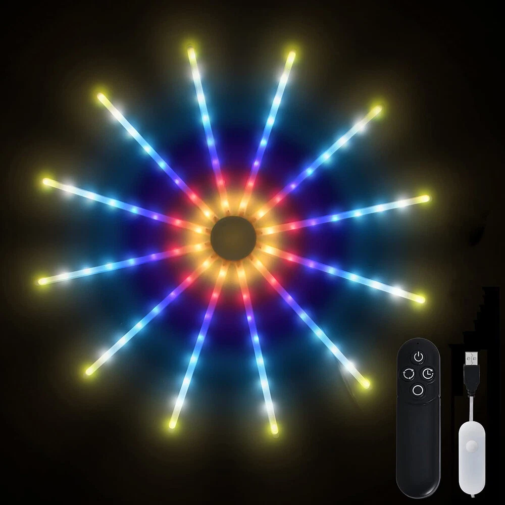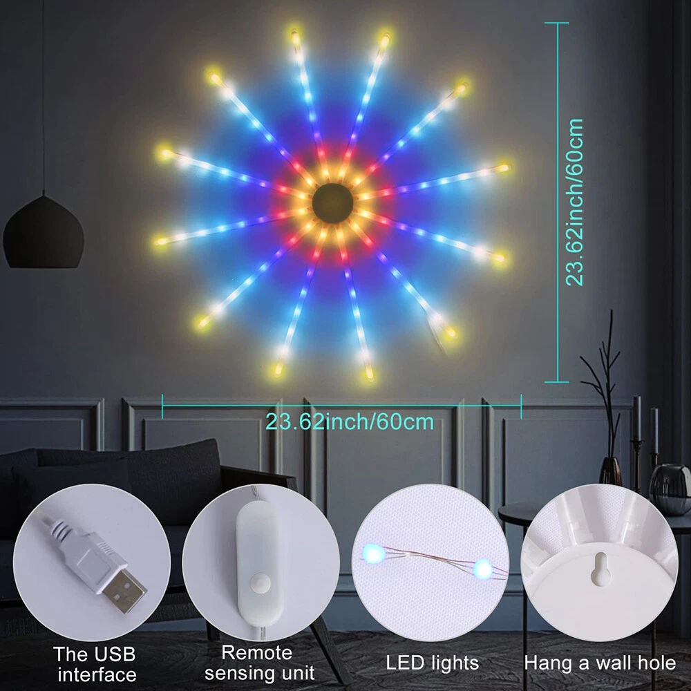 You may also like 15/30M Permanent Outdoor String Light Waterproof RGBIC LED Eave Lamp Party Decor 62.99 USD Free shipping LED Curtain Icicle String Lights Waterproof Big Snowflake Fairy Christmas Decor 21.49 USD Free shipping 20/50/100M LED Fairy String Light Party Christmas Tree Outdoor Home Garden Decor 19.69 USD Free shipping 50/100/200LEDs USB Copper Wire String Fairy Light Garden Outdoor Party Christmas 9.19 USD Free shipping 350 LEDs Outdoor Waterfall String Lights Star Topper Christmas Tree Patio Party 19.89 USD Free shipping 192/288 LED String Meteor Shower Light Fairy Falling Rain Tree Garden Xmas Decor 3.99 USD Free shipping 192/288 LEDs Meteor Shower Lights Fairy String Falling Rain Tree Christmas Decor 3.99 USD Free shipping Christmas Tree Outdoor 192/288 LED Meteor Shower Lights Fairy Falling Rain Decor 3.99 USD Free shipping 500 LEDs String Lights Waterproof 8 Modes US-plug Garden Wedding Christmas Party 22.19 USD Free shipping 100-2000LEDs LED Curtain Long String Light 8 Modes Outdoor Christmas Tree Decor 8.39 USD Free shipping Christmas Outdoor LED Net Light Waterproof Timer Memory Function 8 Modes Wedding 8.39 USD Free shipping Outdoor LED Curtain Lights Icicle String Fairy Garden Christmas Wedding Party US 17.79 USD Free shipping Product Description RGB Dreamcolor LED Firework Light Remote Control 18 Modes String Lights Wall Hanging Lights for Home Party Patio Garden Christmas Valentines Wedding Decorative Description: Features: *【New Design RGB Dreamcolor Firework Lighting Effect in a Plane】With 12 branches copper wire fairy lights which can be built-in 12pcs PC tubes, built-in smart IC, this firework light creates 18 dynamic modes of RGB dreamcolor change lighting effects. USB operated with a modes adjustment button and remote control. *【Wireless RF Remote Control】Support for up to 15 meters / 49.2ft effective receiving range to control On/Off, Timer and 18 different modes (Color Slow-Glow, Color Fast changing, Flash, Slow-moving, Meteor-flash, Fan rotation Effect, Windmill rotation effect, Lineup forward, Chasing forward, Chasing backward, heap up, etc), operated by 2XAAA battery(not included). *【USB Powered LED Fairy Lights with Switch Button】5V/1A USB powered, very easy to use. You can use the remote or USB with a switch button to control the 18 dynamic lighting modes which can create a warm and surprisingly suitable atmosphere for any occasion. *【RGB Dreamcolor LED Firework Lights *【Timing Schedule String Lights】You can press the timer button to set up a personalized time, press first time it will be 4 hours on and 20 hours off, press second time it will be 6 hours on and 18 hours off. with a hanging hole, can be a perfect hanging light for bedroom, Xmas, bar, window, room, wall decor. *【IP65 Waterproof Indoor & Outdoor Lights】Withstand all kinds of weather, including heavy rain and heavy snow, outdoor decoration and high-quality LED fireworks lights sparkling and colorful, but the USB port is not, please keep the USB port away from water. *【Perfect Decoration】With low-energy consumption, the twinkle lights can be widely used for bedroom, birthday, parties, Christmas, Halloween, garden, patio, tent, etc. Specifications: Materials: Copper, Plastic Copper Wire Color: Silver LED Light Color: RGB Dreamcolor Working Voltage: 5V Battery Model of Remote Control: 2X AAA Battery(Not included) LED Qty.: 96LEDs(12 wires, 8LEDs each wire) Size: 60x60CM(WxH)/23.62*23.62inch(WxH) Lead Wire Length: 4M/13.12ft Modes: 18 Lighting Modes Waterproof Grade: IP65(USB Port is not waterproof) Package includes: 1X LED RGB Dreamcolor Fireworks Light 1X Remote Control(Battery Not included) 12X PC Tubes Payment Shipping Returns Contact Us Paypal. We only ship to confirmed paypal address. Items are generally dispatched within 1~3 business days after payment is cleared. Please make sure your address in Paypal is matched with your shipping address before you pay. We offer a 30 days return guarantee. If you are not satisfied with the item, you can return it within 30 days after item received. If items have any problem due to quality, please contact us for refund, exchange or a replacement. Please contact us first before item returned. Customer Service from 9:00 am - 6:00 pm on Business Days. Payment Paypal. We only ship to confirmed paypal address. Shipping Items are generally dispatched within 1~3 business days after payment is cleared. Please make sure your address in Paypal is matched with your shipping address before you pay. Returns We offer a 30 days return guarantee. If you are not satisfied with the item, you can return it within 30 days after item received. If items have any problem due to quality, please contact us for refund, exchange or a replacement. Please contact us first before item returned. Contact Us Customer Service from 9:00 am - 6:00 pm on Business Days. powered by