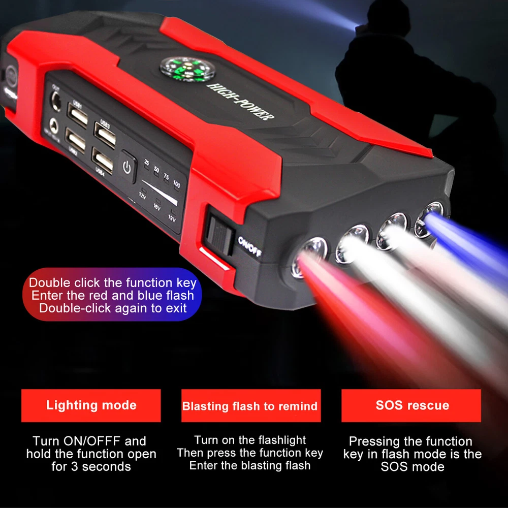 99800mAh Car Jump Starter Booster Jumper Box Power Bank Battery Charger 4 USB 12V 1200A LED Car Jump Starter Portable Emergency Charger Battery Power Bank Car Booster Starting Device Feature: 1. With strong light flashlight function. This LED light has 3 modes: Glare lighting, Strobe and SOS, it is ideal for camping, outdoors, indoors, emergencies, travel, etc. 2. The shell cloth wrapper has better hand feeling and better scratch resistance. 3. With car emergency ignition function, provide better protection for your travel. 4. Fast charging output, with 4 USB ports, fast charging speed. Faster and compatible with almost all devices. 6. With precise compass positioning function, outdoor off-road is safe and reliable. 7. With nine protection functions,overheating protection, short circuit protection, voltage protection, overcurrent protection, overcharge protection, over discharge protection, anti-anti-protection, magnetic field protection, and cell protection. Including integrated circuit board, including software and hardware protection. 8. Easy to use, no need to install, no need to set up, just use a clip to connect the car positive and negative, turn the power on, the car can start. Specification: Item Type: Car Jump Starter Battery Capacity: 99800mAh Car Start Port: 12V USB Port: 5V Notebook Port: 19V/16V Vehicle: 12V Charging Voltage/Current: 15/1A Starting Current: 400A Peak Current: 1200A (<3S) Operating Temperature: -20℃ to 60℃ Full Charge Time: About 4 Hours Cycle Life: More Than 10,000 Times Plug: US Item Size: As the picture show Package List: 1 x Car Jump Starter 1 x Power Adapter 1 x Car Charge-r 2 x Battery Clamps(Black+Red) 1 x 4 in 1 Mobile Phone connectors 8 x Laptop connectors 1 x Laptop Adapter Cable 1 x User Manual 1 x Carrying Bag Payment Only PayPal is acceptable. It is a safe and easy payment method for buyers. Please pay in 48 hours after you win the item(s). If payment cannot be made in five days, your order(s) will be claimed as unpaid case and the item will be relisted. Shipping All item will be carefully packaged very well with safe material and shipped to US States. Items will be sent in 2 working days, usually shipped by USPS Priority Mail. It will take about 3-5 days to US addresses. If you would like to ship by other shipment methods,please contact us. ( shipping cost will be combined for multiple items you purchase at a time.) Returns Customer satisfaction is our first priority. 30-days return is available after delivery. However, return shipping and insurance cost will be on buyers. Please email us before returning. Delivery date will be different according to UPS or USPS tracking system, so please inspect your item immediately upon arrival. Money will be return to you after the return item is sent back. We can not refund to you, if your return item is broken or damaged. Please ensure its safety. Feedback Your feedback is very important to us. If you can't leave us a "5-Star" rating and a positive feedback, please contact us without hesitation before leaving feedback. We are eager to work with our customers. We believe in communication. Give us a call or send us an email, we will make things right for our buyers. Positive feedback for our buyers will be left automatically by eBay Seller Manager Pro.
