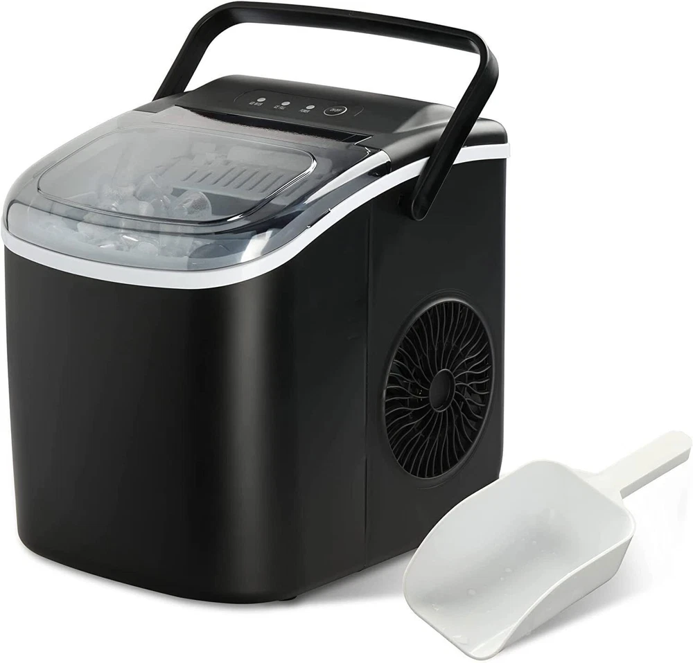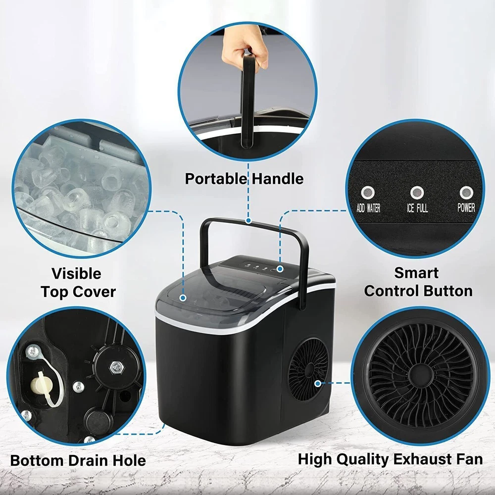 Specification Product Information Item Code: W113468210 Product Type: General Item Product Name: Simple Deluxe Ice Maker Machine for Countertop, 26lbs Ice/24Hrs, 9 Ice Cubes Ready in 6 Mins, Portable Self-Clean Ice Machine with Scoop and Basket, 13.7lbs, for Home Kitchen Office Bar Party, Black Place of Origin: China Main Color: Black Main Material: ABS Product Dimensions Assembled Length (in.): 9.84 Assembled Width (in.): 12.20 Assembled Height (in.): 12.60 Weight (lbs.): 14.00 Package Size Length (in.): 9.84 Width (in.): 12.20 Height (in.): 12.60 Weight (lbs.): 14.77 Product Features 2022 new upgraded version: With new upgraded compressor, this ice maker produces 9 ice cubes within only 6-8 minutes. It even can produce up to 26 pounds of ice per day, will be a perfect substitute for the old one in your home. Portable and compact: The lightweight and portable design of the mini–ice maker makes it easy to store or carry, just 8.8(W)*11.6(D)*11.4(H) inches and weighs less than 14lbs, more light than other brand, widely used in home, kitchen, office, bar, RV etc. Great user experience: Operates at a low 35 decibel level, so you can have a quiet environment; Equipped with a quiet cooling fan, quickly dissipate heat for long-term use; Visible top can monitor water level and ice cubes interior of the machine. Self-cleaning function: With self-cleaning function, just press on/off button for 5s to start self-cleaning mode, which allows you not to worry how and take time to clean it. Maybe add a small amount of lemonade and soda can help a better cleaning. Easy to use: Just fill the ice maker with water (less than 1.2L), press the ON button. With infrared sensor, when the ice basket is full (over 1.3lbs), or the water is insufficient, the indicator light will turn on, it will stop the ice making. On Jul 5, 2024 at 10:13:13 PDT, seller added the following information: