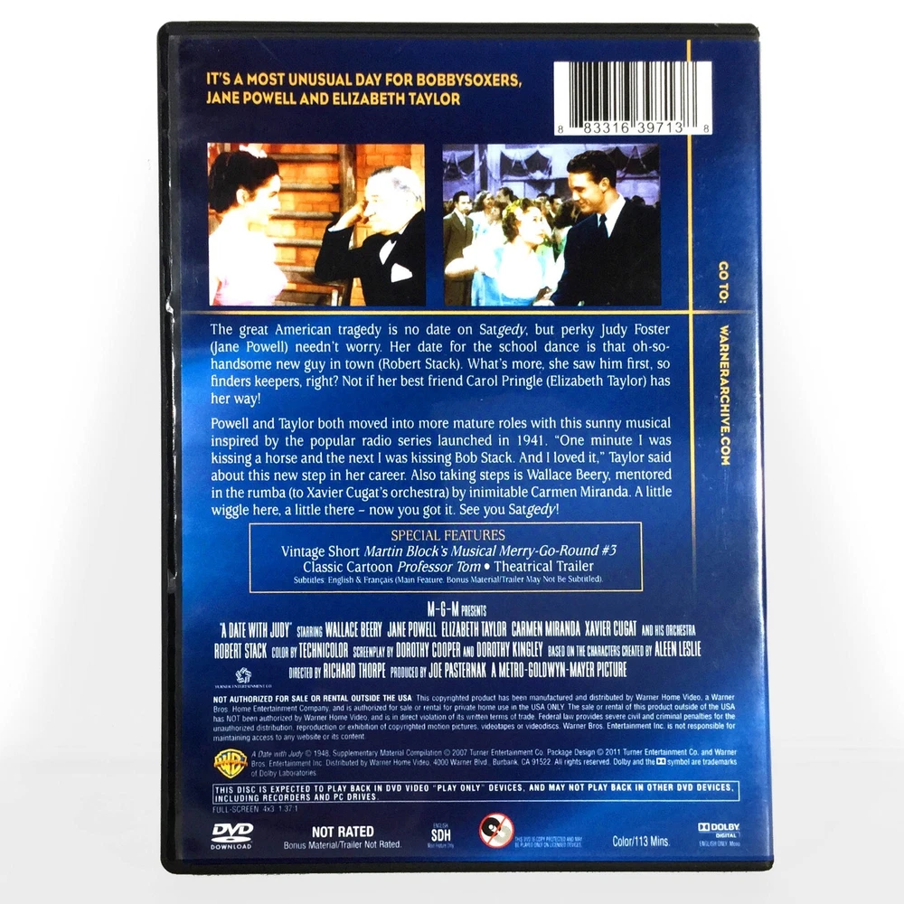 PLEASE READ INFORMATION & CAREFULLY REVIEW ALL PHOTOS ! Authentic, * Like New Condition DVD of "A Date With Judy - Full Screen "Warner Archives Collection" Edition (1948)" ! * The Disc Is A Made-On-Demand (M.O.D.) DVD-R Distributed By The Original Studio ! * The DVD Case May Have Some Minor Shelf Wear ! Sold "As- Is" ! Total Running Time Approximately 113 Minutes ! Starring Elizabeth Taylor, Jane Powell, Carmen Miranda, Xavier Cugat, Wallace Beery & Robert Stack ! ( please carefully review all photos ) Please Take A Look At My Other Listings For Many Rare, NEW & USED DVD's & Blu-rays Including Vintage Collectibles, Toys & Hot Wheels ! I strive to ship very quickly, usually within 24 hours after payment is received (check my feedback). You will also automatically receive a tracking number for your package ! I package very carefully and use Bubble, Padded, Poly or Kraft Paper envelopes and will ship USPS Media Mail for most DVD' s & Blu-Rays. * Please Contact Me First Before Purchasing For Additional Cost For Extra Padding, Cardboard Protection And/ Or Shipping In A Box ! Sorry, but I do not ship internationally and ask that you please feel free to contact me with any questions!