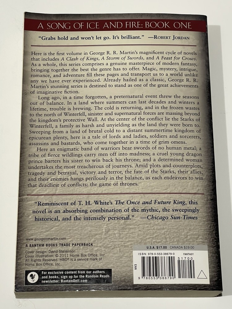 Format:Trade PaperbackBook Title:Game of Thrones (Hbo Tie-In Edition)Illustrator:YesBook Series:A Song of Ice and Fire Ser.Item Height:1.2 inISBN:9780553386790Item Weight:20.5 OzItem Width:6 ingtin13:9780553386790Topic:Action & Adventure, Fantasy / Epic, Media Tie-InPublication Year:2011Language:EnglishAuthor:George R.R. MartinNumber of Pages:720 PagesPublisher:Random House WorldsGenre:FictionItem Length:9.2 in