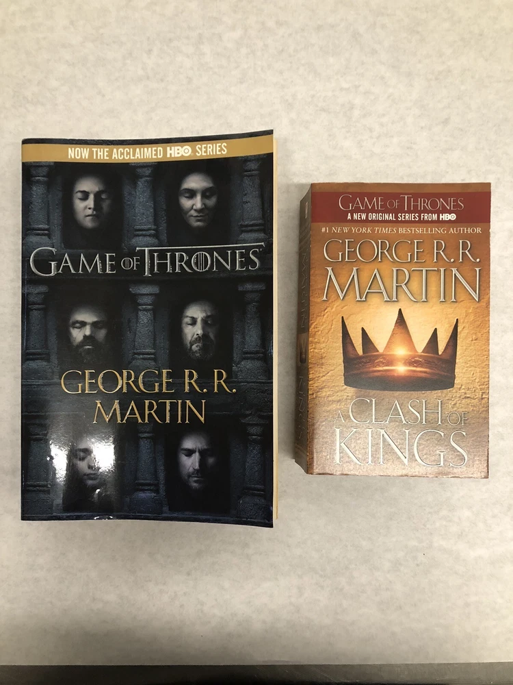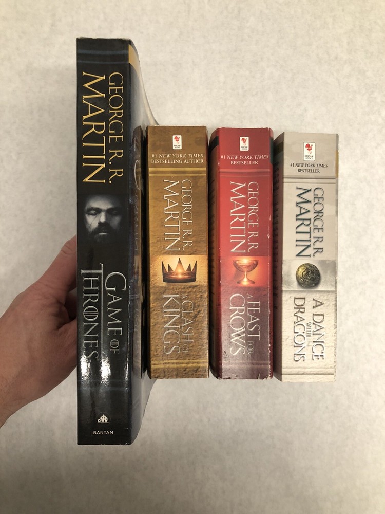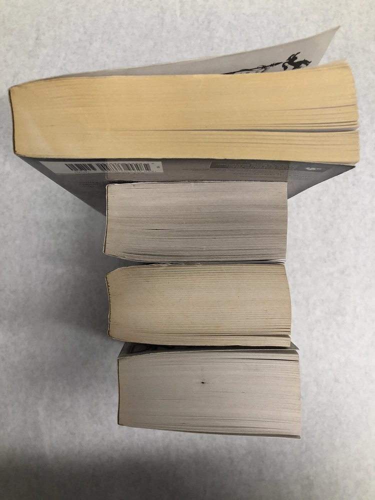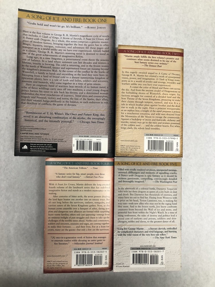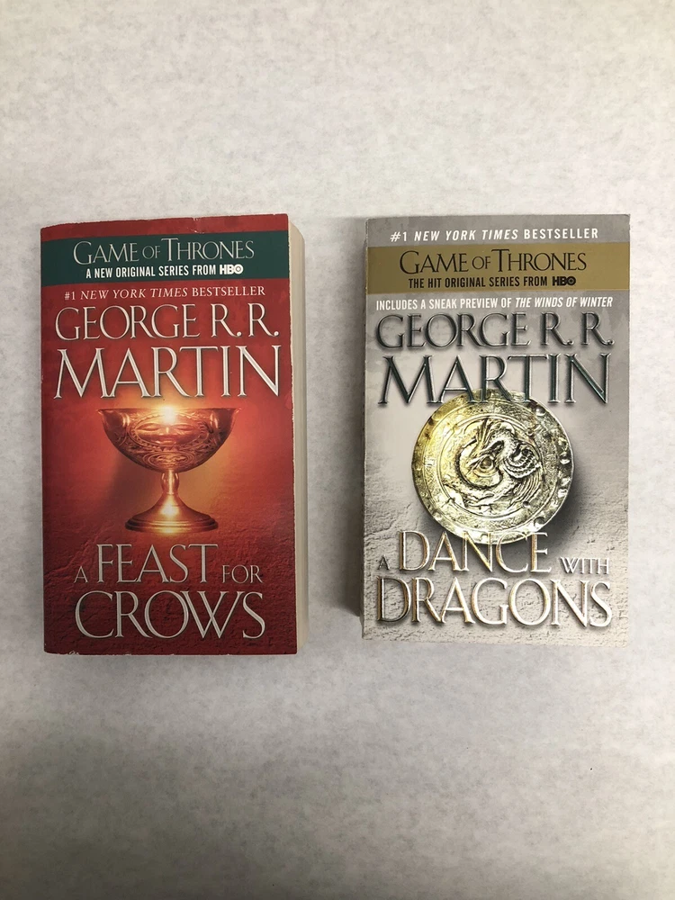 Hello and welcome! Immerse yourself in the world of Westeros with this four book lot of "A Song of Ice and Fire" series, including "Game Of Thrones," "A Clash Of Kings," "A Feast For Crows," and "A Dance With Dragons". Written by George R.R. Martin, this action-packed adventure fantasy series will take you on a journey through the seven kingdoms. The books come in a paperback format and are written in English. They are perfect for adults and make a great addition to any fantasy or action book collection. Whether you're a fan of the books or the TV series, this is a must-have for any "Game of Thrones" enthusiast. The books are in pretty nice shape overall. They are all in good condition and most have never been read at all. That being said, they have sat on the shelf for several years and have acquired a small amount of shelf wear in places such as the corners and the edges. They have also discolored on the edges of the books somewhat. The actual inside pages are in nice bright condition. There may be other light wear or marks as well. From a pet free, smoke free home. Please examine the pictures and feel free to ask me any questions. Penny is shown for scale and is not included. Thanks for looking!