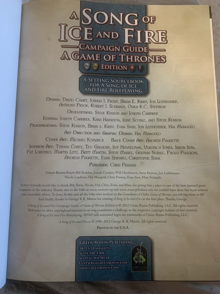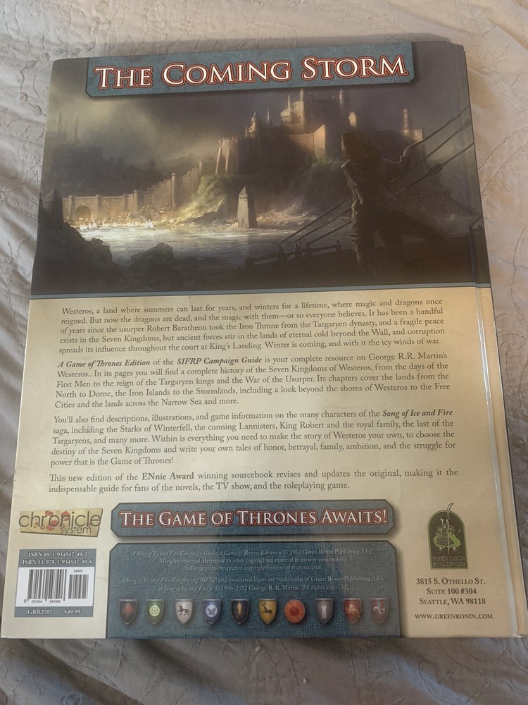 This A Game of Thrones RPG Supplement is a must-have for fans of the A Song of Ice and Fire series. It provides extensive information for players looking to immerse themselves in the world of Westeros. The book is in English and is suitable for young adults and adults alike. It was published in 2013 by Green Ronin Publishing and is available in hardcover format. The book features contributions from David Chart and includes details on the fiction, genre, and topic of the game. It also provides information on the film/TV adaptation and is perfect for those interested in adventure and fantasy. This item is ideal for collectors and fans of the A Song of Ice and Fire series.