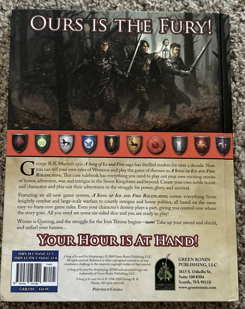 "A Song of Ice and Fire Roleplaying: Adventures in the Seven Kingdoms" by Robert J. Schwalb is a game book set in the immersive world of George R.R. Martin's fantasy series. Published by Green Ronin Publishing in 2009, this hardback book features 192 pages filled with roleplaying activities and game mechanics to help players explore the intricate politics and conflicts of the Seven Kingdoms. With beautiful illustrations and a focus on storytelling and character development, this book is a must-have for fans of the Song of Ice and Fire series looking to experience the epic saga through roleplaying.