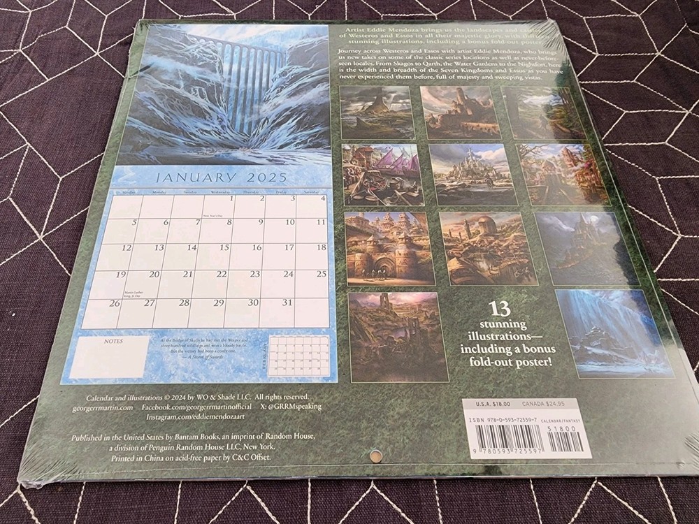 This calendar is a must-have for any fan of George R.R. Martin's epic fantasy series, A Song of Ice and Fire. Featuring stunning illustrations by Eddie Mendoza, this 2025 calendar is a great way to keep track of the days and months while enjoying beautiful pieces of art. With 24 pages of content, this calendar covers a full year and includes illustrations that capture the essence of the series' action and adventure, media tie-in, and fantasy/epic genres. Published by Random House Worlds and Bantam, this calendar is a great addition to any book lover's collection. Please look at the pictures of the item for sale. Please ask any questions before purchasing this listing. Thank you for looking and good luck!