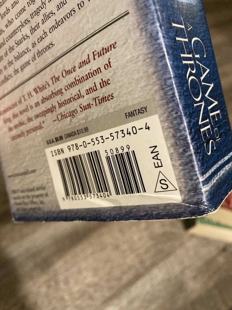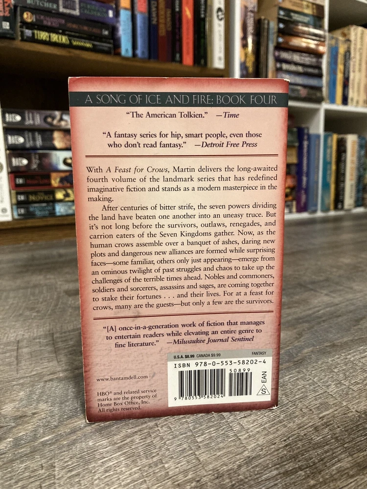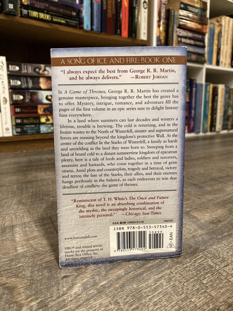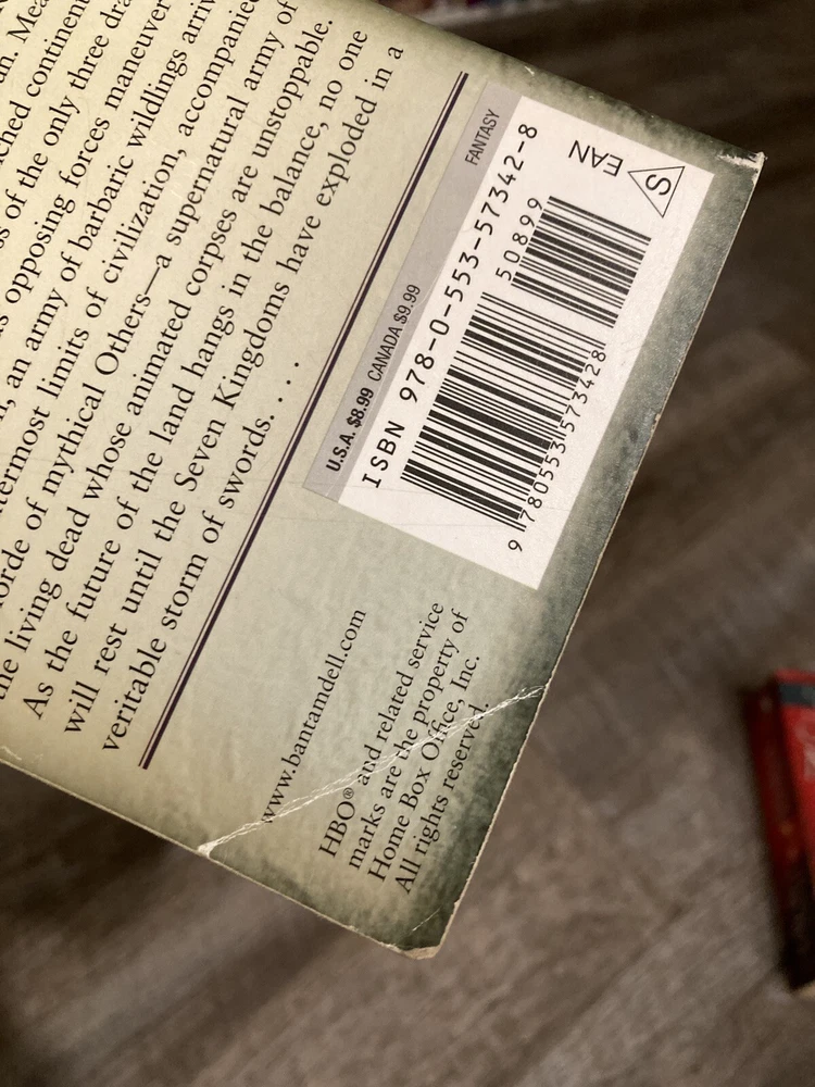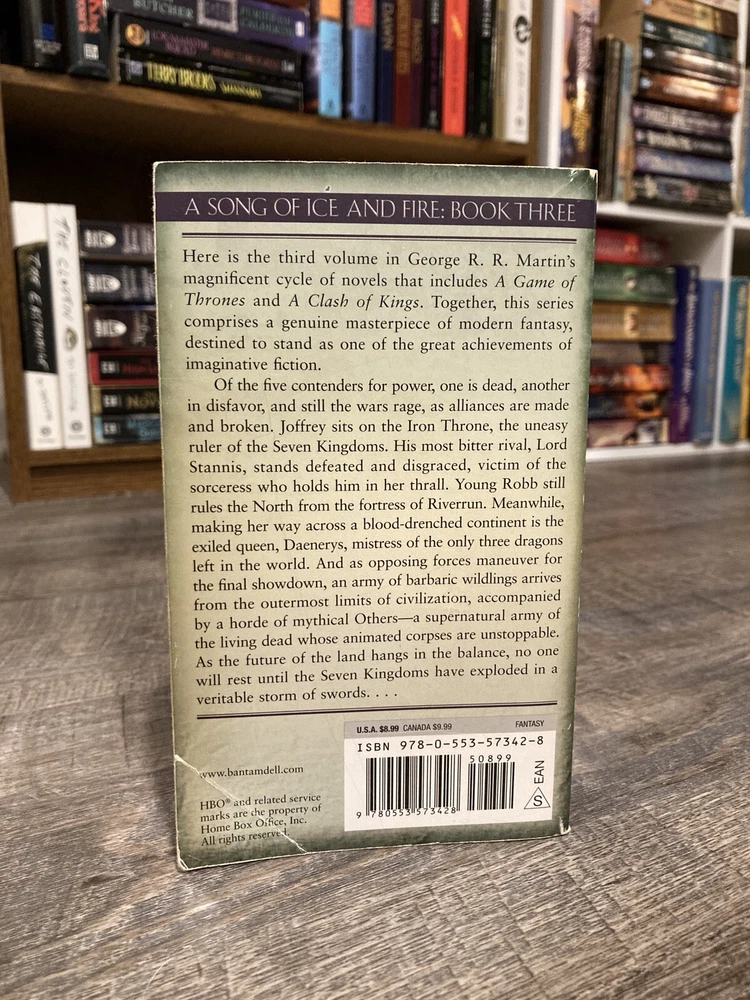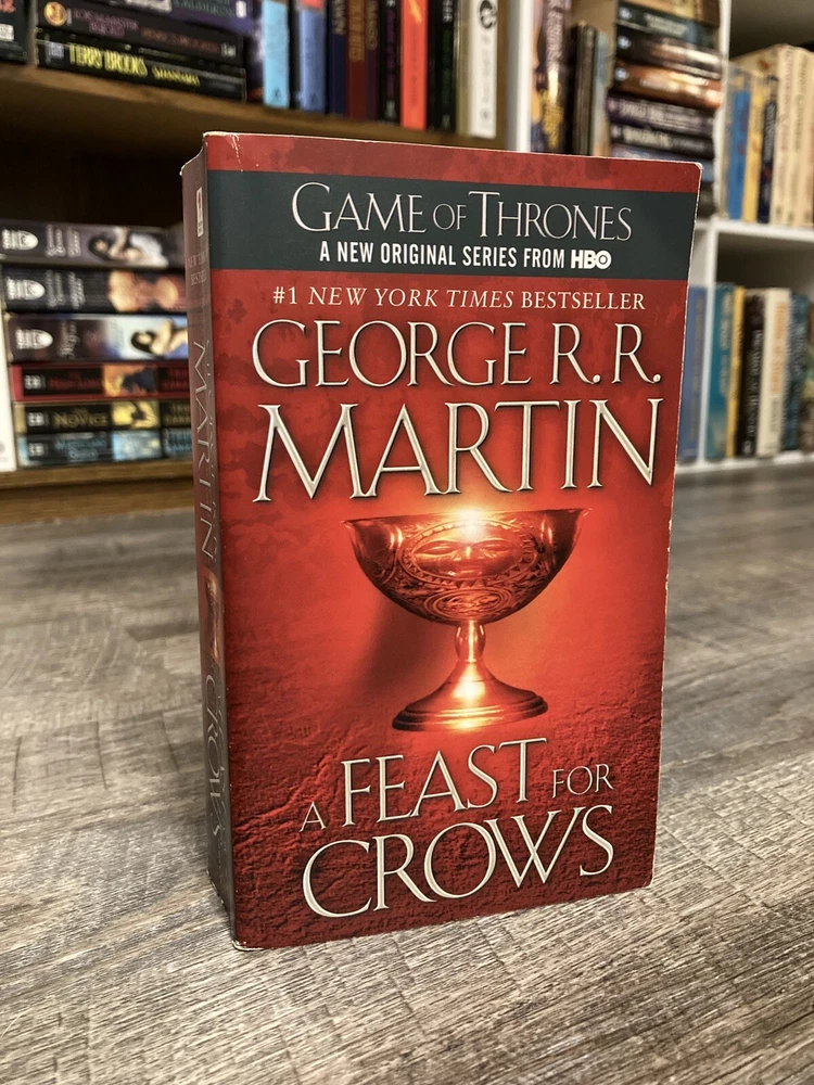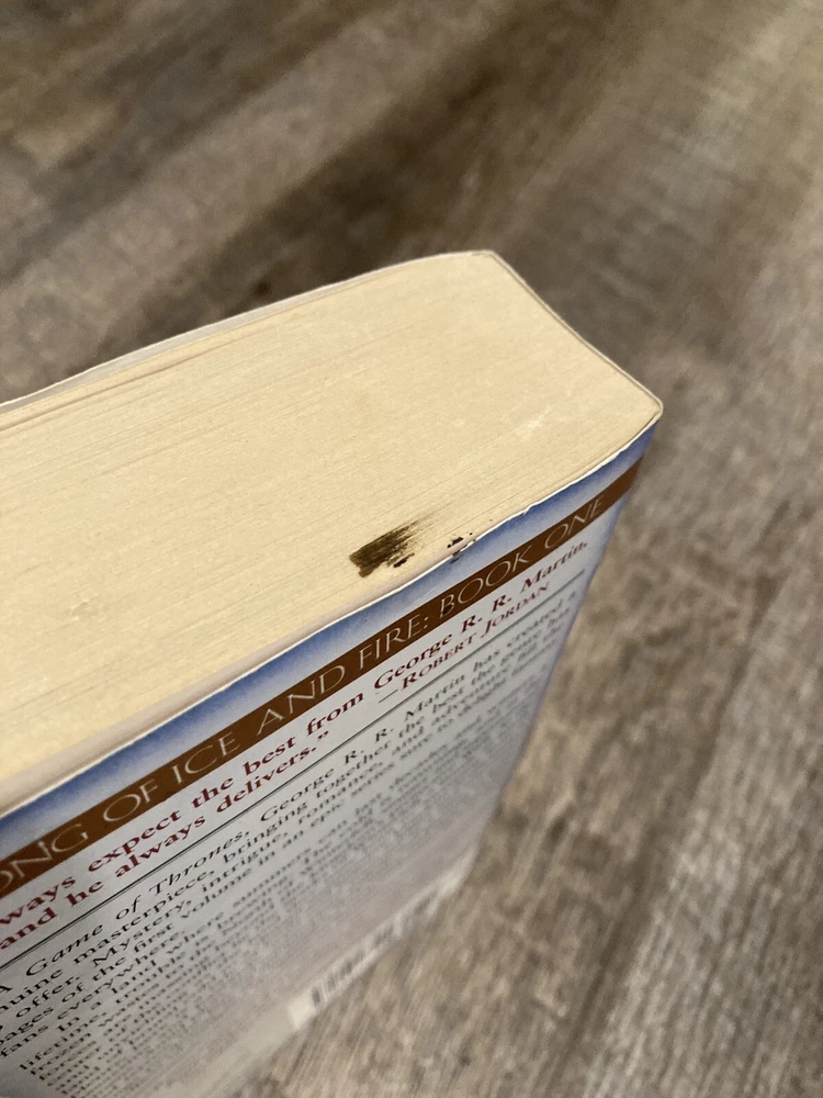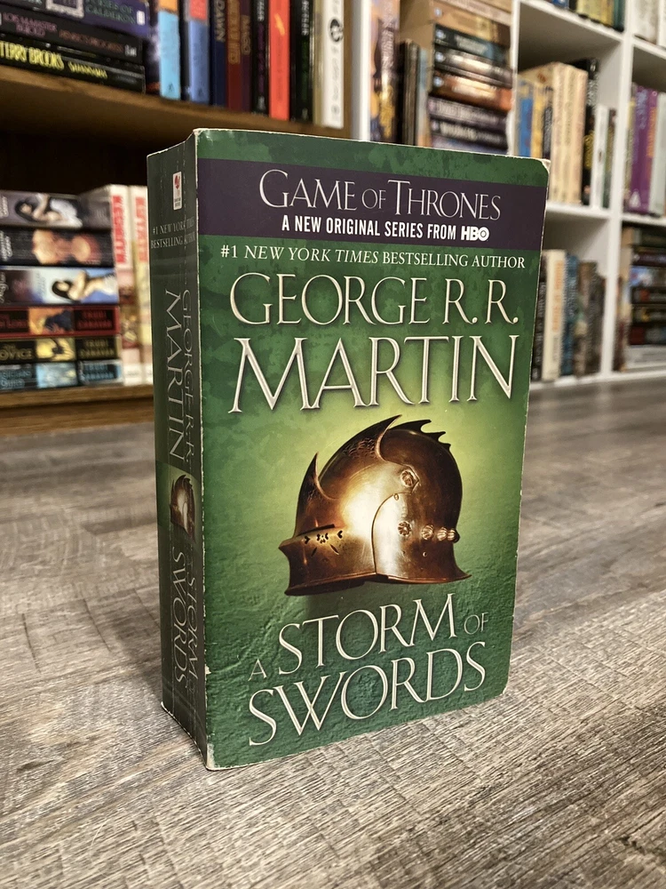 Here is a lot of books one, three and four in George R.R. Martin’s A Song of Ice and Fire (Game of Thrones) series in mass market paperback, Bantam. Books included are: A Game of Thrones / A Storm of Swords / A Feast for Crows. GoT has some cover creasing, small mark on outside top of pages, and two small circular dents in front cover. ASoS has a crease on the back cover. All have some spine curving and creases. Fairly clean readers overall. No writing inside or out. All known imperfections are visible in the photos above. Packaged with care and shipped via USPS Media Mail.