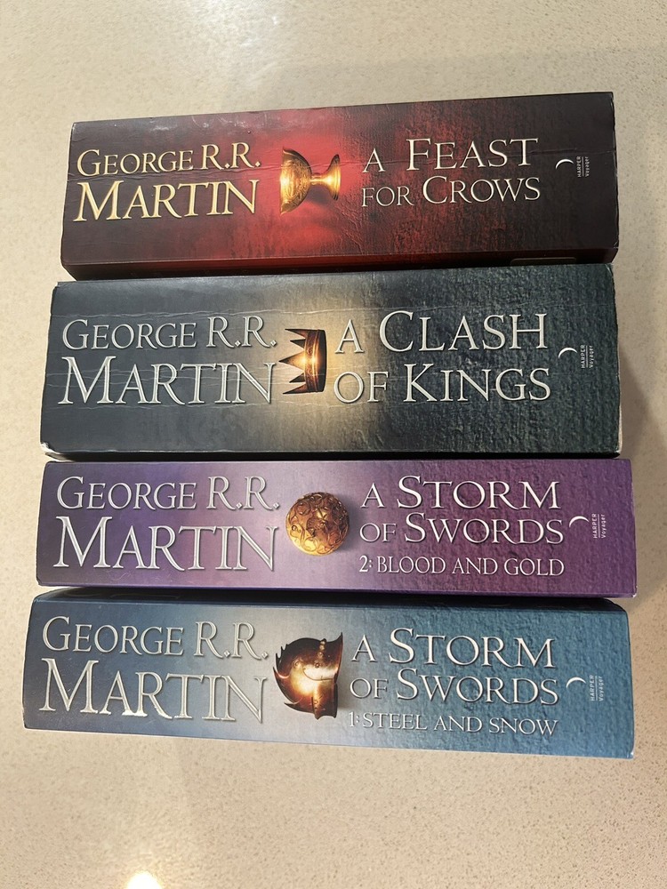 The A Song of Ice and Fire book series by George R.R. Martin is a must-read for any fantasy fan. This epic tale takes place in a world full of political intrigue, dragons, magic, and unforgettable characters. With its intricate plot and richly detailed world-building, this series has captured the hearts of millions of readers worldwide. This e-commerce listing includes all books in the series, making it the perfect addition to any book lover's collection. Each book is written in English and promises hours of captivating reading. Don't miss out on this opportunity to immerse yourself in the world of Westeros and beyond.