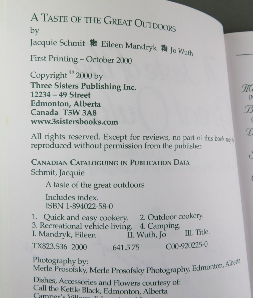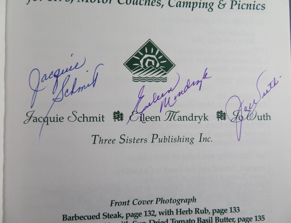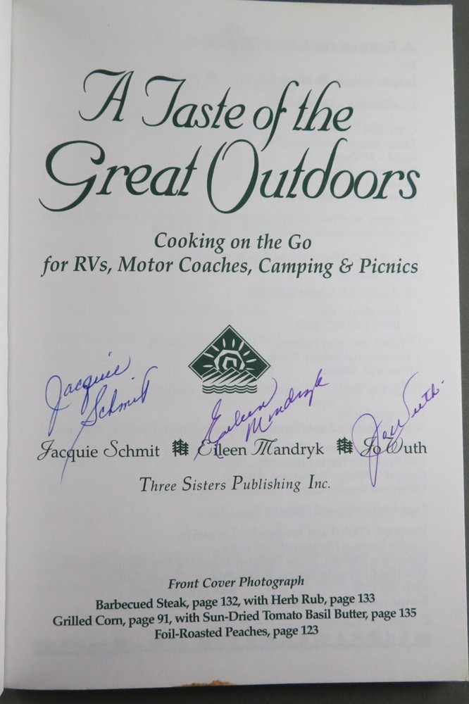 A TASTE OF THE GREAT OUTDOORS Cooking on the Go for RVs, Motor Coaches, Camping & Picnics - by Jacquie Schmit & Eileen Mandryk & Jo Wuth VERY RARE SIGNED by all three authors. The book is a NEAR FINE trade-size softcover Published by Three Sisters Publishing, Edmonton, Alberta, Canada, 2000, FIRST EDITION 172 pages; glossy photo wraps; color photo plates; index. There is a very slight, small stain on the bottom-edge (the reason the the 'Near Fine' rating, instead of 'Fine'). --------------------------- Ordering more? Combined order shipping discounts. Any problems with your order? Contact me FIRST and I will fix it. --------------------------- 17, 21-C