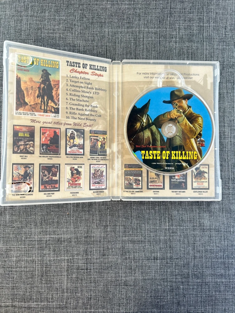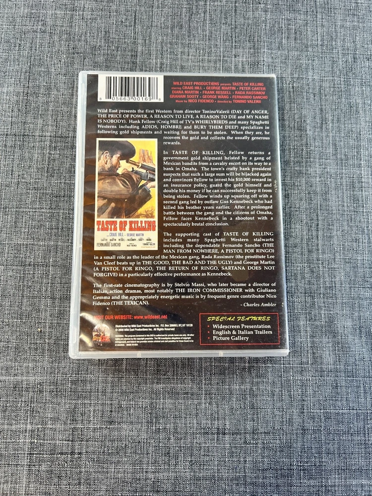 Taste of Killing DVD Per il gusto di uccidere / Spaghetti Western Collection Vol. 14 Wild East Productions | 1966 | 84 min | May 23, 2006 Video Codec: MPEG-2 Encoding format: 16:9 Resolution: 480i (NTSC) Aspect ratio: 2.35:1 Original aspect ratio: 2.35:1 Audio English: Dolby Digital 2.0 Discs DVD Single disc (1 DVD) Packaging Inner print Playback Region 1 Taste of Killing (1966) Hank Fellows is a bounty hunter who is also dedicated to recovering the loot that robber gangs steal from banks.