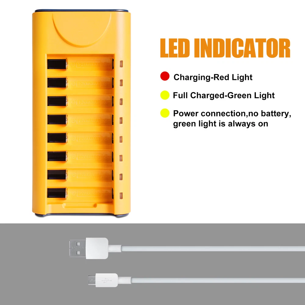 AA AAA Rechargeable Battery Charger 8-Slot For AA AAA Rechargeable Batteries US Features: 1. 【Smart Rechargeable AA Battery Charger】 AA AAA battery charger 8 bay for Ni-MH Ni-CD rechargeable batteries can charge any quantity in any slot. Single, double or triple ones can be charged, and not necessary to put them in neighboring slots. Besides, you can also mix charge AA and AAA batteries, as long as they are Ni-MH or Ni-CD batteries. 2.【Safety Protection】 Comes with special charge and discharge management circuit. With multiple security protection settings, battery charger aa can effectively prevent reverse, short circuit, overcharge, over discharge, over-current damage to the battery, which makes users using the product without any safety concern. 3.【LED Indicators Charging Display】 This aa aaa battery charger with Red/Green led light display, And the aa rechargeable battery charger will display the status of each rechargeable battery when you insert a battery to charge, the light will turn solid red, only on the port(s) containing the battery, to indicate the battery is charging. The light turns solid green when charging is complete. 4.【USB AA Battery Charger】 USB Powered Universal Intelligent Battery Charger, allows for on the go worldwide portability.the USB charging line can be connected to USB socket, car charger, computer, phone adapter, other USB output equipment to charge. 5. Note: Products with electrical plugs are designed for use in the US. Outlets and voltage differ internationally and this product may require an adapter or converter for use in your destination. Please check compatibility before purchasing. Specification: 1. LED state the charging statues: Power connection, no battery, Green light is always on. Charging - Red light Full charged- Green light 2. Compatible: Can both charge AA and AAA Ni-MH Ni-Cd rechargeable batteries (Do not charge alkaline or Lithium batteries) 3. Input and Output: Input: DC 5V 1A, Worldwide voltage Output: DC 1.2V 200mA, faster for charging 4. Individual fast-charging,LED indicator light, Easy to use AA/AAA/ Ni-MH Ni-CD rechargeable batteries,Perfect Fit 6. Can charge any number of batteries at the same time, independent charging channels 7. Safety Charging, Offer over-voltage over-current protection, short-circuit protection, over-charge protection, over-heat protection, Good Protection Package Included 1 x AA Battery Charger 8 Slot 1 x USB Cable On Jan 26, 2025 at 23:39:29 PST, seller added the following information: