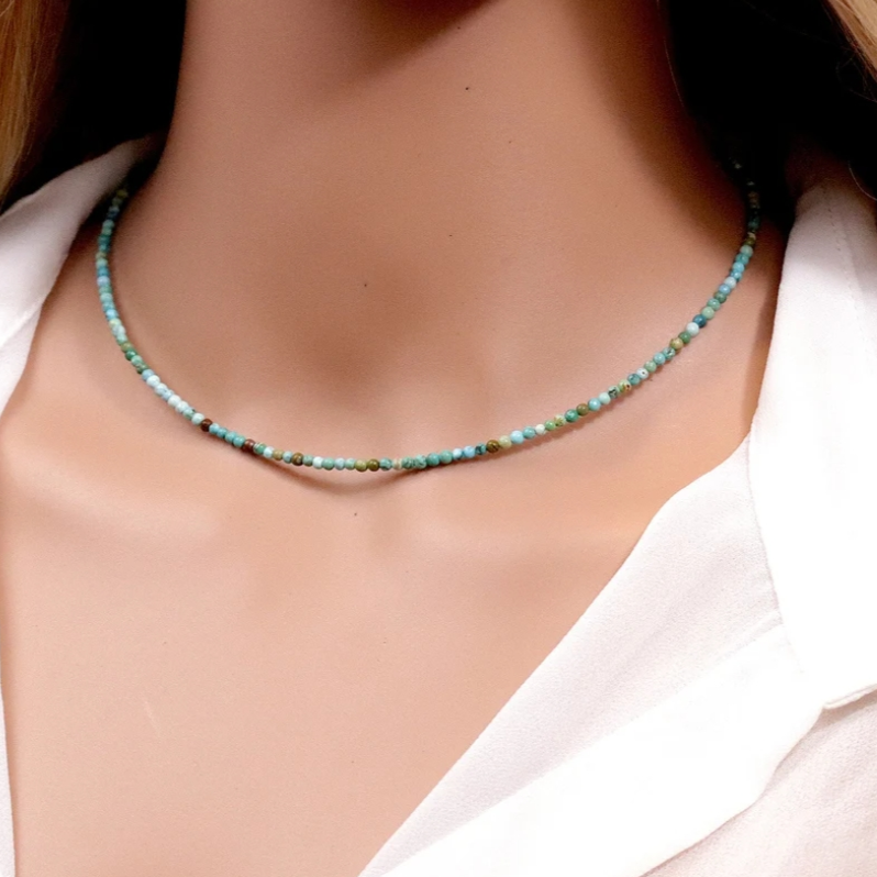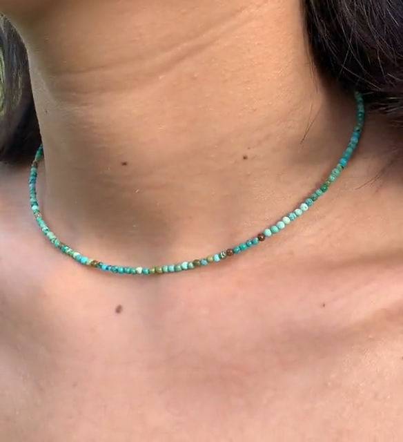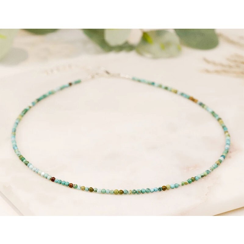 Necklace size: 15 inches with 2 inch extender. Turquoise Healing Properties: ♡ As a blue stone, turquoise supports the throat chakra. ♡ Turquoise means it helps in communicating clearly with more confidence, standing up for yourself, speaking your truth, and expressing - your individual creativity. ♡ Wearing or keeping Turquoise will help restore depleted vitality and lifts sagging spirits, relief stress and bring focus back to the center heart. ♡ It is empathetic and balancing, helping one to recognize the causes of happiness and unhappiness, and to master them Can be a gift for loved ones, friends or a treat to yourself. Please note that due to the fact these are natural stones, the colors may vary but will be equally as beautiful. Package included: 1x choker 1x gift cloth sack