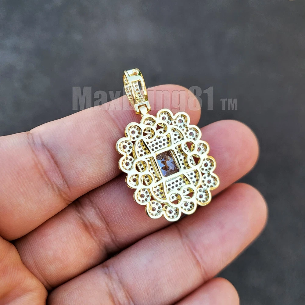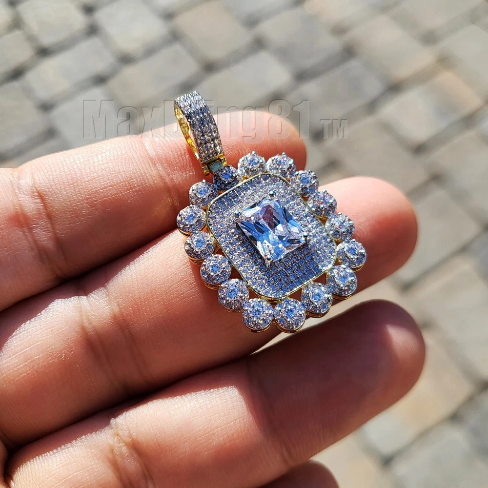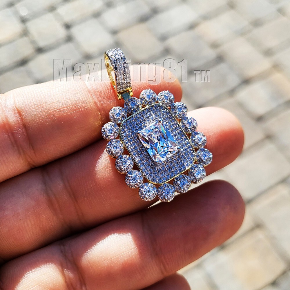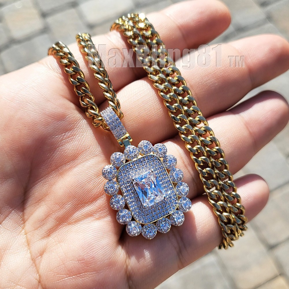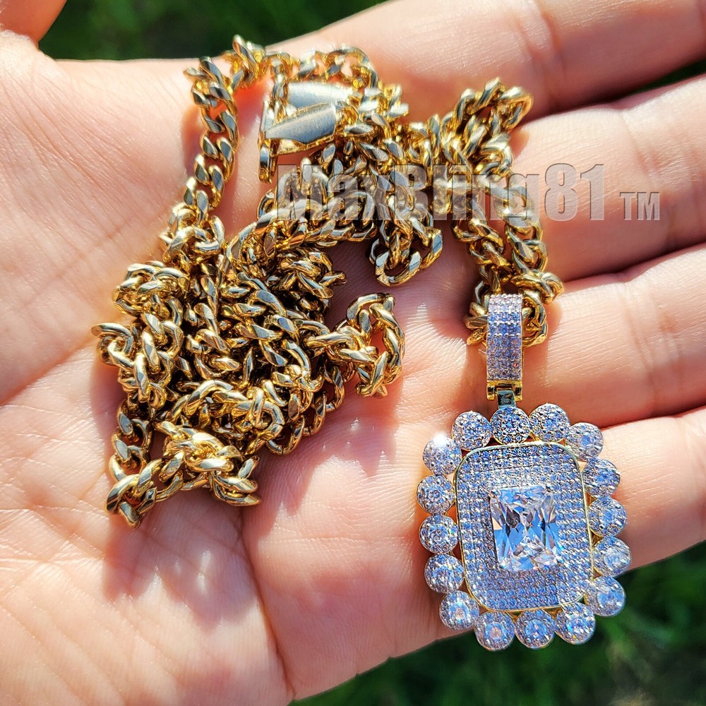 AAA+ SIMULATED DIAMOND ICED GOLD PLATED BRASS & 18" ~ 24" CUBAN CHAIN NECKLACE Hip Hop Celebrity Style Pendant & Chain . Different from cheap material pendant. Diamond Test Passed SIZE OF PENDANT : 25mm X 22mm High Quality Simulated Diamond Stones COLOR: 14K Gold Material : Brass Chain : 4mm 18" 20" 24" Cuban Chain High Quality & Polished Retail Price : $89.99 Payments: US Customers: Paypal accepted International Customers: Paypal accepted Shipping: For Shipping & Handling within the US: FREE We do combine shipping! We ship via USPS (Post office) First Class Mail Tracking Info will automatically be posted via Paypal and ebay. Approximate Delivery Times: US: 2-5 BUSINESS DAYS Canada: 1-2 weeks Europe: 1-6 weeks South America: 2 weeks Australia: 2 weeks Asia: 2 weeks We do everything possible with the packaging to ensure it arrives to you in perfect condition. If you have any questions please feel free to ask. Returns: 100% Satisfaction Guarantee! Exchanges: We replace defective items if sent back within 14 days upon receipt. Lost or Damaged Items: If insurance is purchased, items will be reshipped absolutely Free of Charge. (Damaged goods must be sent back) Refunds: If the item is in new condition, we can accept returns less s&h charges and a 20% restocking fee. Please email first for return authorization.