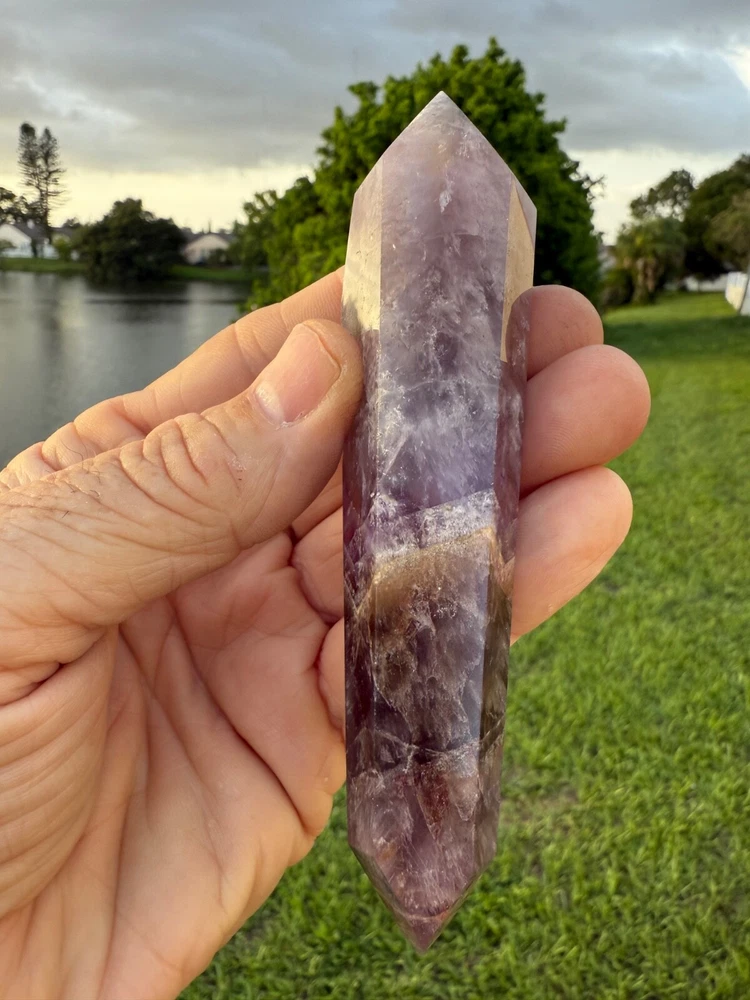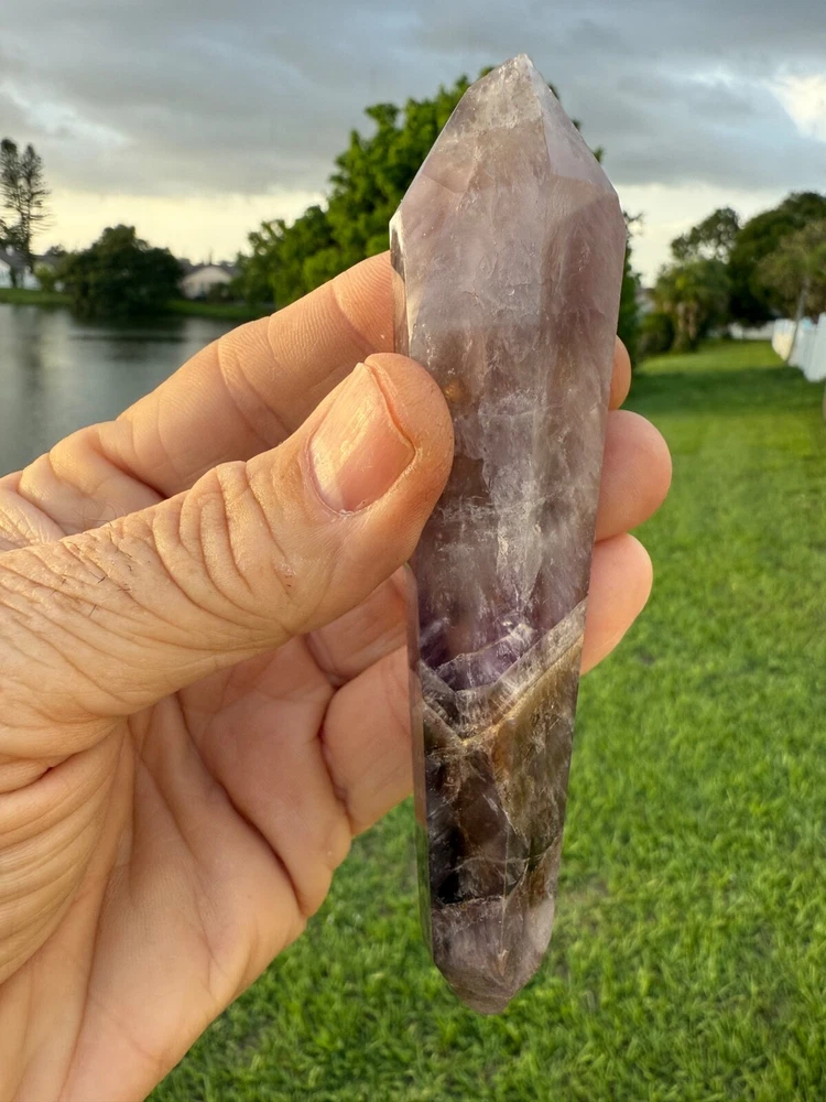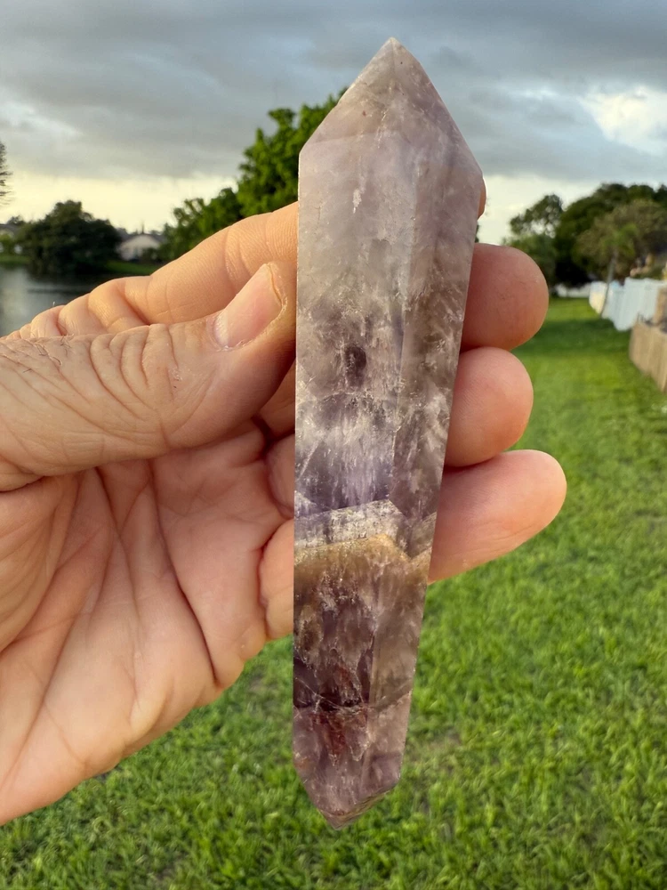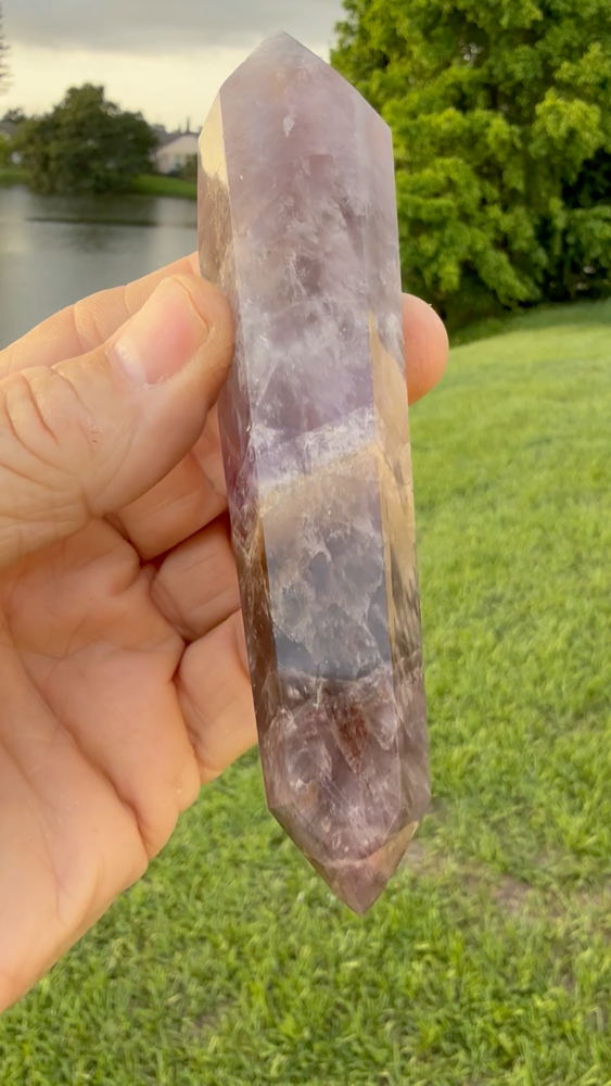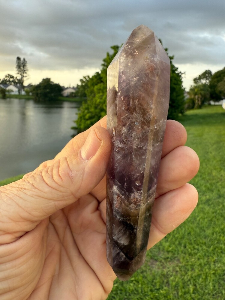 AAA Long Super Seven Melody Stone Double Terminated Point Wand 5" 114 grams Polished! Money Back Guarantee! Great for meditation. Super Seven, also known as Melody’s Stone or Sacred Seven, is primarily a crystal composed of seven minerals, including Amethyst, Clear Quartz, and Smoky Quartz. It is widely used in metaphysical and spiritual practices for its purported healing properties. Super Seven is said to balance and activate all seven chakras, from the Root to the Crown, promoting overall harmony. This makes it a popular choice for holistic healing practices.