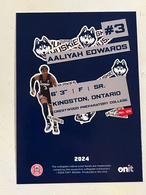 AALIYAH EDWARDS 2023-2024 Onit Athlete UConn Women's Basketball set Sticker Series insert HOLO parallel CONDITION: These cards are from boxes opened by me, and they are in the condition that they were in as I pulled them. Please understand that these Onit cards typically have minor imperfections - white corners/edges, print lines, small surface imperfections, etc. *Check out my OTHER AUCTIONS for more Onit cards - I'll have many cards available of various teams* You are bidding on the listing above, from 2023-2024 Onit Athlete UConn Women's Basketball. Make sure to check my other auctions for more Onit cards! Shipping will be $1 via eBay's Standard Shipping service COMBINED SHIPPING: Each additional card is free shipping