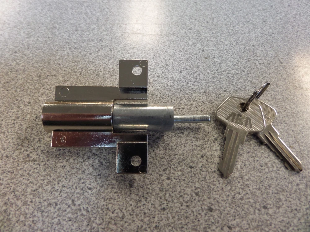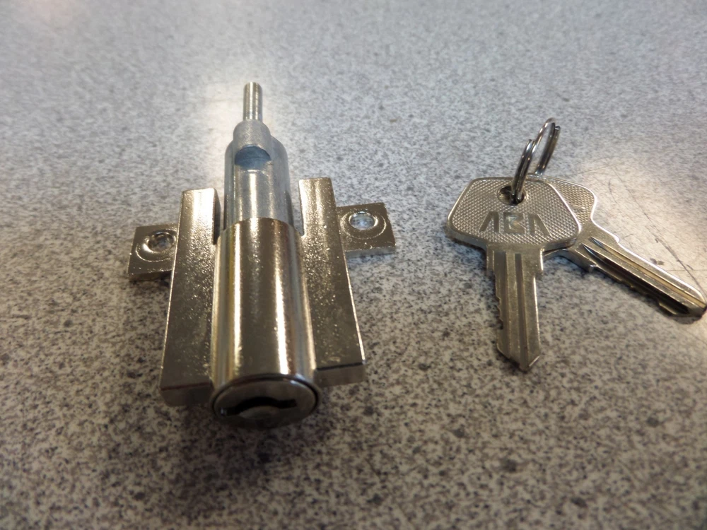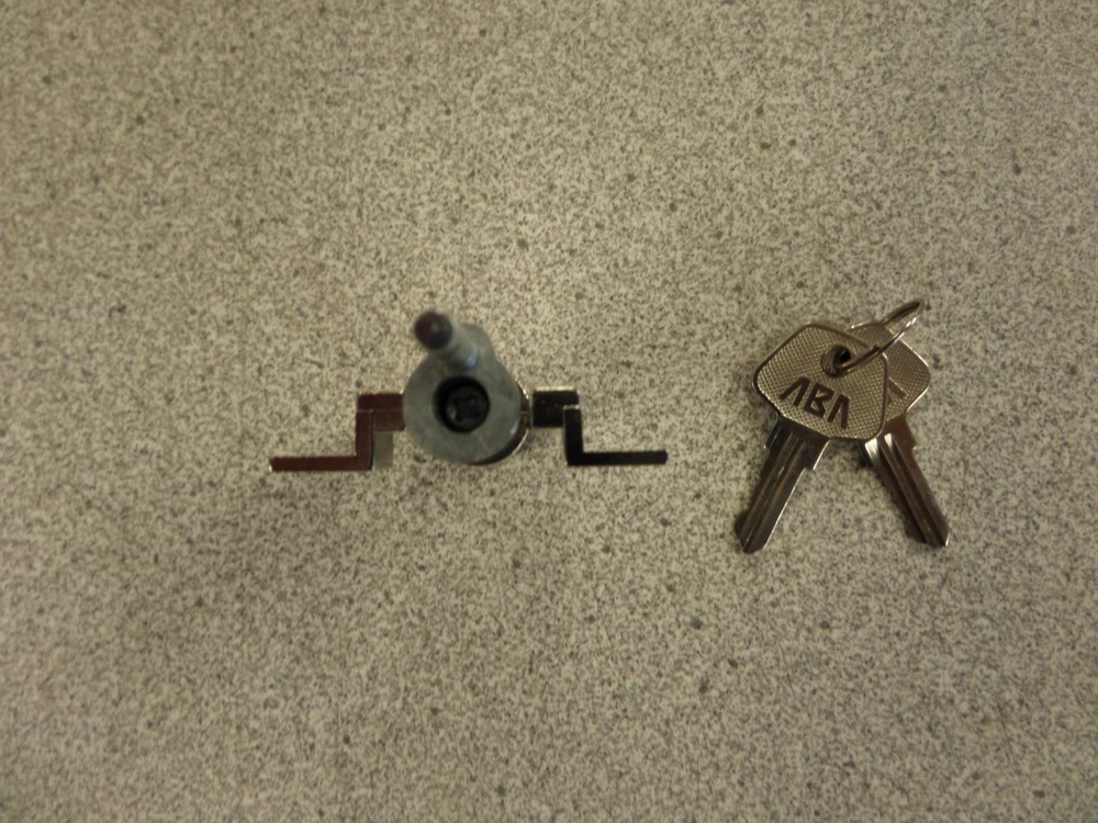 ABA Metal Desk Gang Lock ABA metal desk gang lock. Locks multiple drawers on some metal desks. 9/16" diameter lock barrel with a 2 3/4" overall lock length. Pin on back of lock is 11/16" long. Mounting holes measure 1 3/8" center to center. 5 wafer cylinder. Lock includes 2 keys and mounting screws. Locks are keyed alike to EB129. Multiple lock orders will be keyed alike. Please make sure this is the correct lock for you application before ordering. Check out our Ebay store to see all the items we sell!