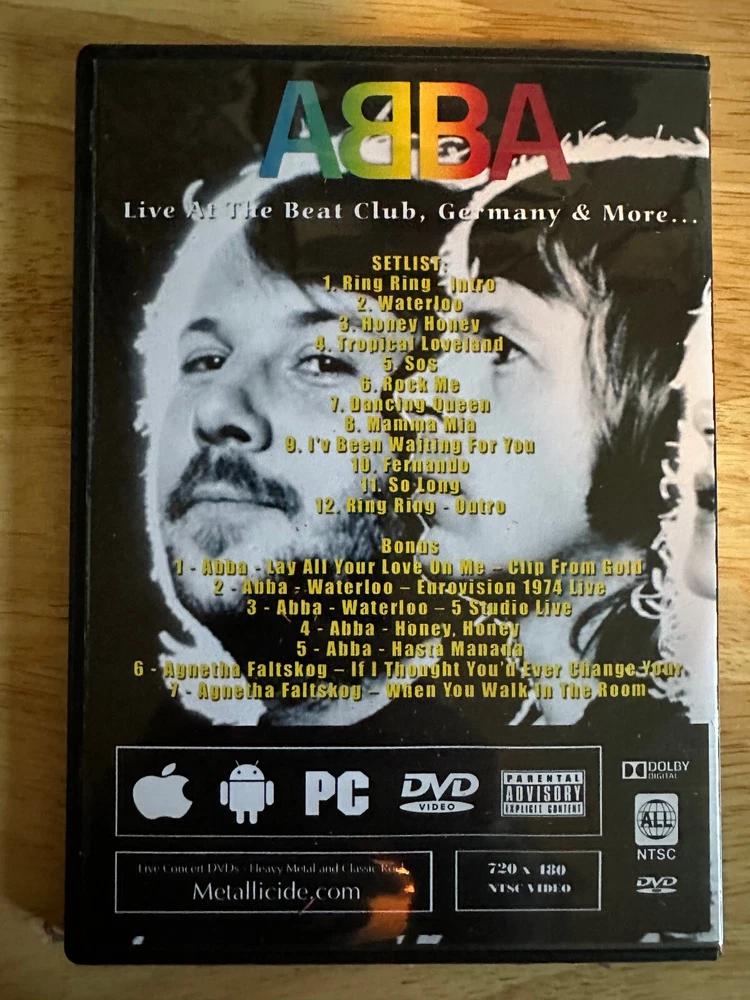 ABBA Live at Beat Club & More... TRACKS: 1. Ring Ring - Intro 2. Waterloo 3. Honey Honey 4. Tropical Loveland 5. Sos 6. Rock Me 7. Dancing Queen 8. Mamma Mia 9. I've Been Waiting For You 10. Fernando 11. So Long 12. Ring Ring - Outro Bonus: 1 - Abba - Lay All Your Love On Me Clip From Gold 2 - Abba - Waterloo Eurovision 1974 Live 3 - Abba - Waterloo 5 Studio Live 4 - Abba - Honey, Honey 5 - Abba - Hasta Manana 6 - Agnetha Faltskog If I Thought Youd Ever Change Your 7 - Agnetha Faltskog When You Walk In The Room INFO: Professional Filmed QUALITY: A/A+ VIDEO: NTSC/16:9 Widescreen CHAPTERS: YES (Song Select) Audio1: AC3/448 Kbps/5.1 Ch Audio2: AC3/448 Kbps/2 Ch Audio3: LPCM/1536 Kbps/2 Ch DISC: 1 DVD REGION: 0/ALL REGIONS CASE, COVER AND ARTWORK: YES (as pictured)