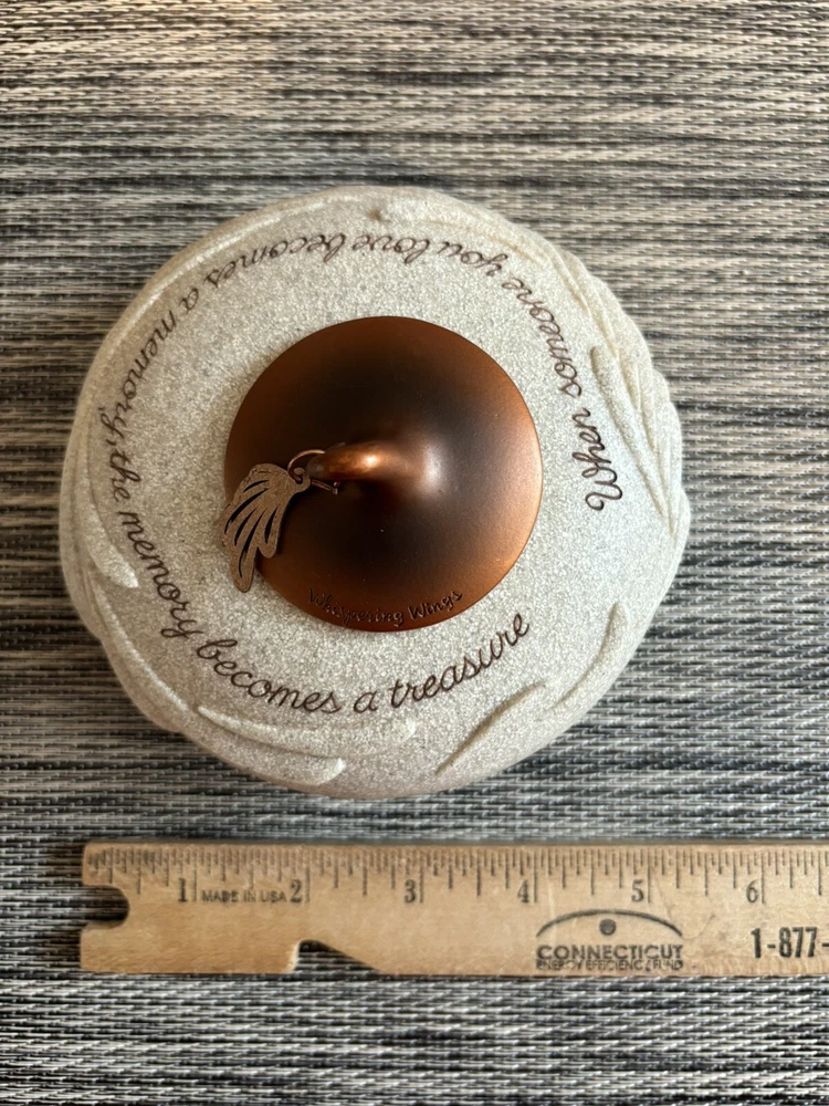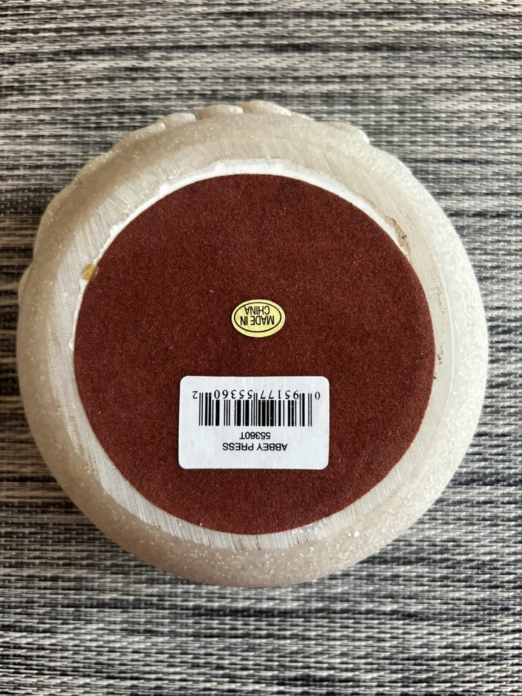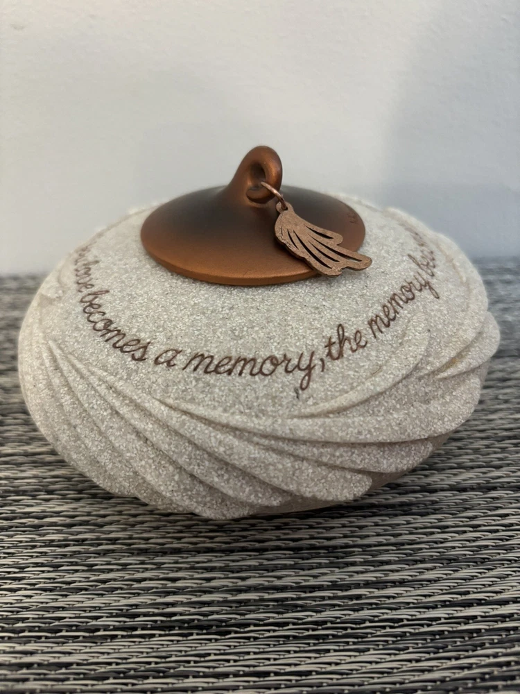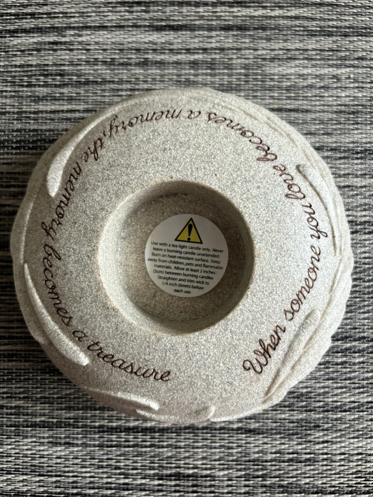Add a touch of elegance to any room with this Abbey Press Tea Light Candle Holder from the Whispering Wings collection. The round candle holder is made of beige resin and features a textured pattern with a matte finish. This decorative candle holder is perfect for creating a warm and cozy atmosphere in any setting. This is a perfect idea for anyone who has memories of a loved one and wants to honor him or her. The etched words “When someone you love becomes a memory, the memory becomes a treasure” are in cursive letters. The bronze removable lid is perfect when candle is not in use. Candle holder is pre-owned from estate but in Very Good condition. Shipped with USPS Ground Advantage.