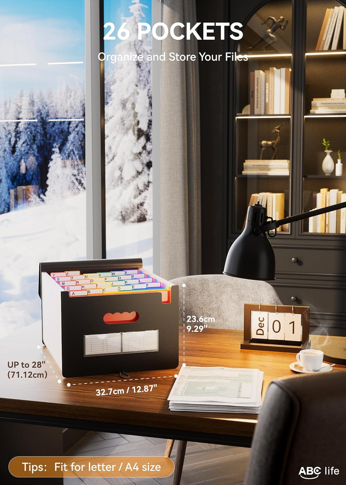 Store New Arrivals Add to Favorite View Feedback Contact ABC Life 26 Pockets Accordion File Organizer, Expanding File Folders, Portable Monthly Bill Receipt Organizer with Colorful A-Z Tabs, Desktop Folders Letter A4 Paper Document Storage for Home Office Description Item model number 2021 Version Sheet Size A4/Letter (not for Legal Size) Inches Number of Items 1 Color A Black Classic Brand ABC life Material Top-end 700D Polyester & Polypropylene Material Type Top-end 700D Polyester & Polypropylene Manufacturer Part Number file folder 24 Cover Expansion 26 Inches Style Accordian File Classification Item Weight 1.23 pounds Fastener Capacity 3000 sheets Lines Per Page 18 Tab Position Top Is Discontinued By Manufacturer No Product Dimensions 13 x 9.4 x 1.96 inches Tab Cut 1/12 Cut Manufacturer ABC life 【26 Expanding File Folder】ABC life pockets accordian file organizer suitable for filing tax and storing important family documents. Product size is 13 "x 9.4"x 28", top and bottom are both expandable, For letter/A4 size files. 【Expandable Capacity】alphabetical file organizer can be extended to 28”, Which means file folders can expand and shrink with growing files flexibly, 26 pockets enough for more than two years of documents, . Closed bottom makes papers stay in the proper slot 【Easy to Categorize】Unique A-Z large tabs and color inner pages design help you to classify your files effectively. Perfect for organizing alphabetically 【Practical and Convenient】Files no longer covering up index tab. can store multiple items, family tax records, bills, receipts, invoices, identification documents, medical finance records, etc.Compact and lightweight a-z accordion file organizer for home, office, school, archives and libraries 【Free up Your Home/Office Space】Accordion file organizer is best for home filing. It can expand well to hold a lot of files and collapses small enough to take up less space. Making your life easier and pleasant. Product Description 1 Expandable Capacity 2 Pen Slot 3 2 types 4 Waterproof Material 1 January-December labels 2 A-Z Tags 3 Hand-written labels 1 Office Organization 2 Test Paper Organization 3 Household Storage 4 Archive Room ABOUT US We offer the best prices around on high quality products. Our E-store includes media such as books, movies, music and games while offering electronics, toys, sporting apparel, clothing, tools, general home, garden items and more. SHIPPING We are always working hard to ensure your package arrives as soon as possible. Please understand that some factors like weather, high postal traffic, and the performance of shipping companies are outside of our control. We offer free shipping to the lower 48 states and ship within 2 business days of payment, usually sooner. We do not accept P.O. Boxes. Please provide a physical address. RETURNS We offer a 30-Day Return Policy on items which you are not completely satisfied with. You have the option for a full-refund or an exchange of the item. No returns are available on items shipped outside of the USA. PAYMENT We accept PayPal. CONTACT US This page content is yet to come Please ad us to your favorite seller and visit again later Thank You CUSTOMER SATISFACTION We try our very best to make sure every customer is completely satisfied. If there's a problem, message us! We're happy to help.