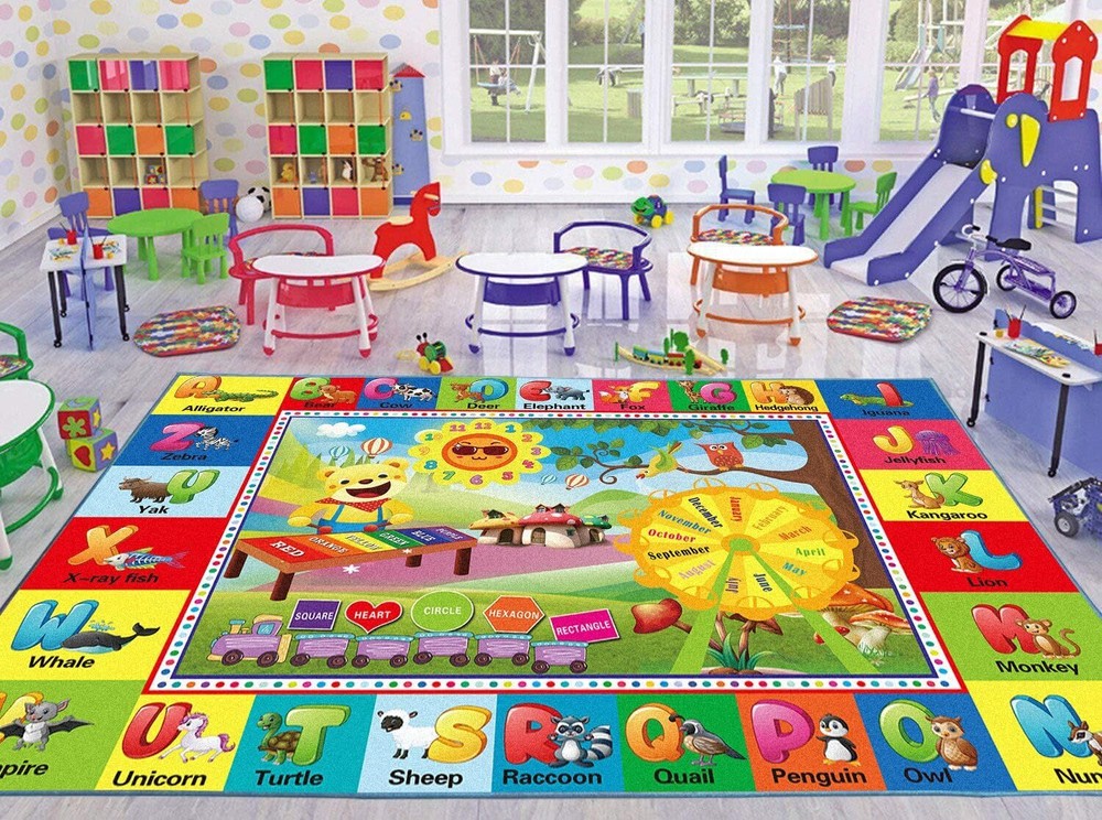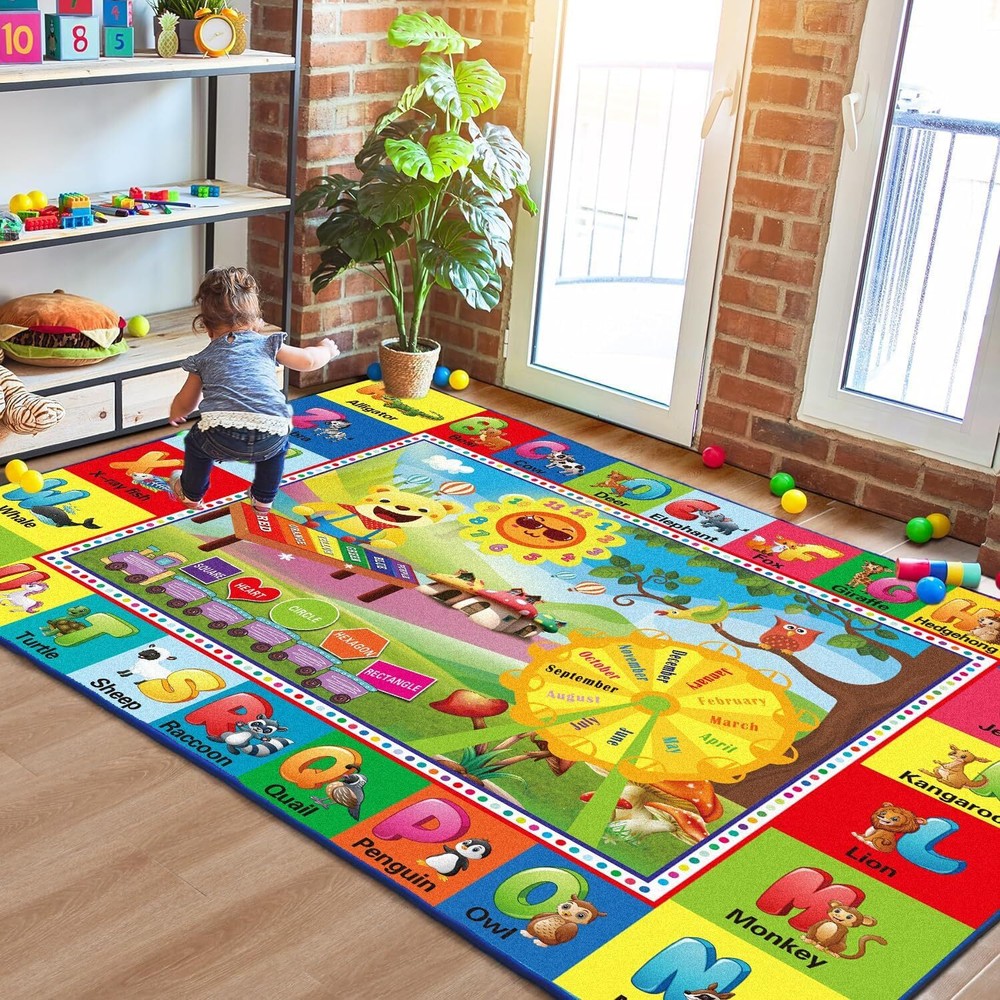 ABC Rug, Play Mat for Kids Playroom, Alphabet 59X39.4‘’, Abc Rug Product Details Brand: yongjoy Size: 59X39.4‘’ Material: Crystal fleece Weave Type: Machine Made Pile Height: 1 PREMIUM QUALITY - Crafted from high-quality crystal velvet and resilient sponge, our baby play mat boasts a super-soft surface and impeccable edge stitching. The non-slip backing with anti-slip particles ensures your child's safety. VERSATILE DESIGN - Measuring 78.7X59", this preschool carpet fits seamlessly into any room. Whether it's the playroom, bedroom, game room, living room, nursery, daycare, or classroom, your child will adore this ABC-themed rug. EDUCATIONAL FUN - Our classroom mat features an engaging alphabet design, with each letter represented by a corresponding animal object. It also includes numbers around the cute sun, various shapes in vibrant colors loaded by a truck, and a rotating disk with months. This baby play mat promotes early education in an exciting way. PERFECT FOR PLAY AND LEARNING - Ideal for playtime, movement, crawling, and learning, this kids rugs playmat enriches your home or classroom environment. It sparks your child's curiosity and fosters a love for learning.