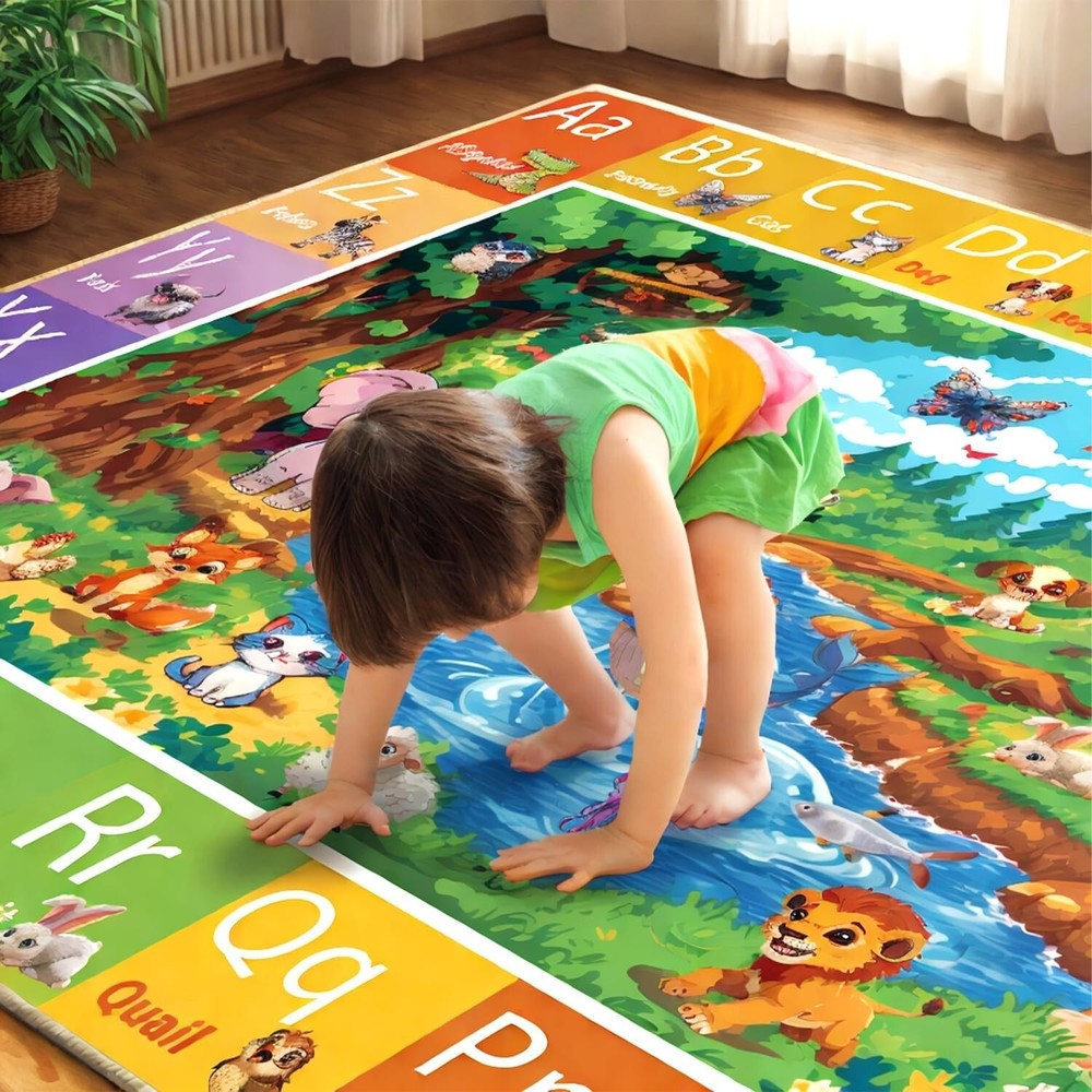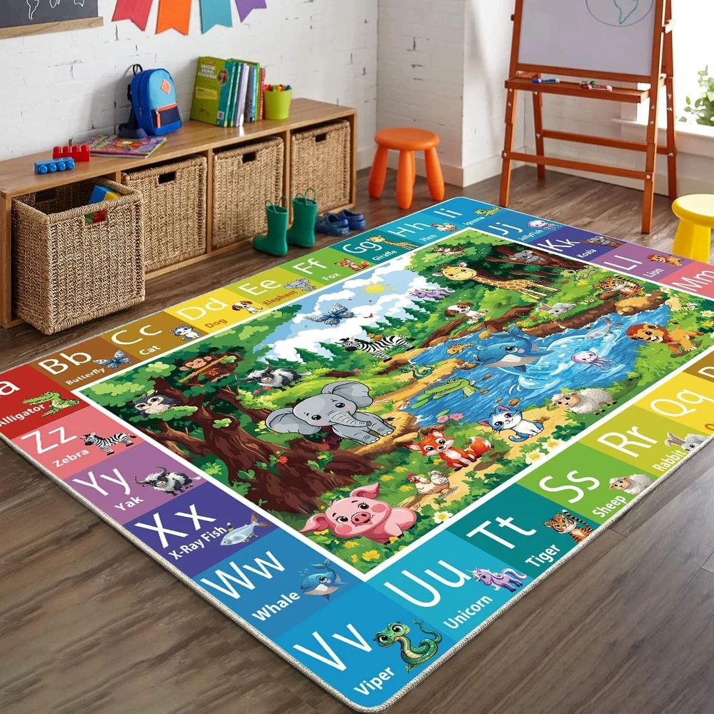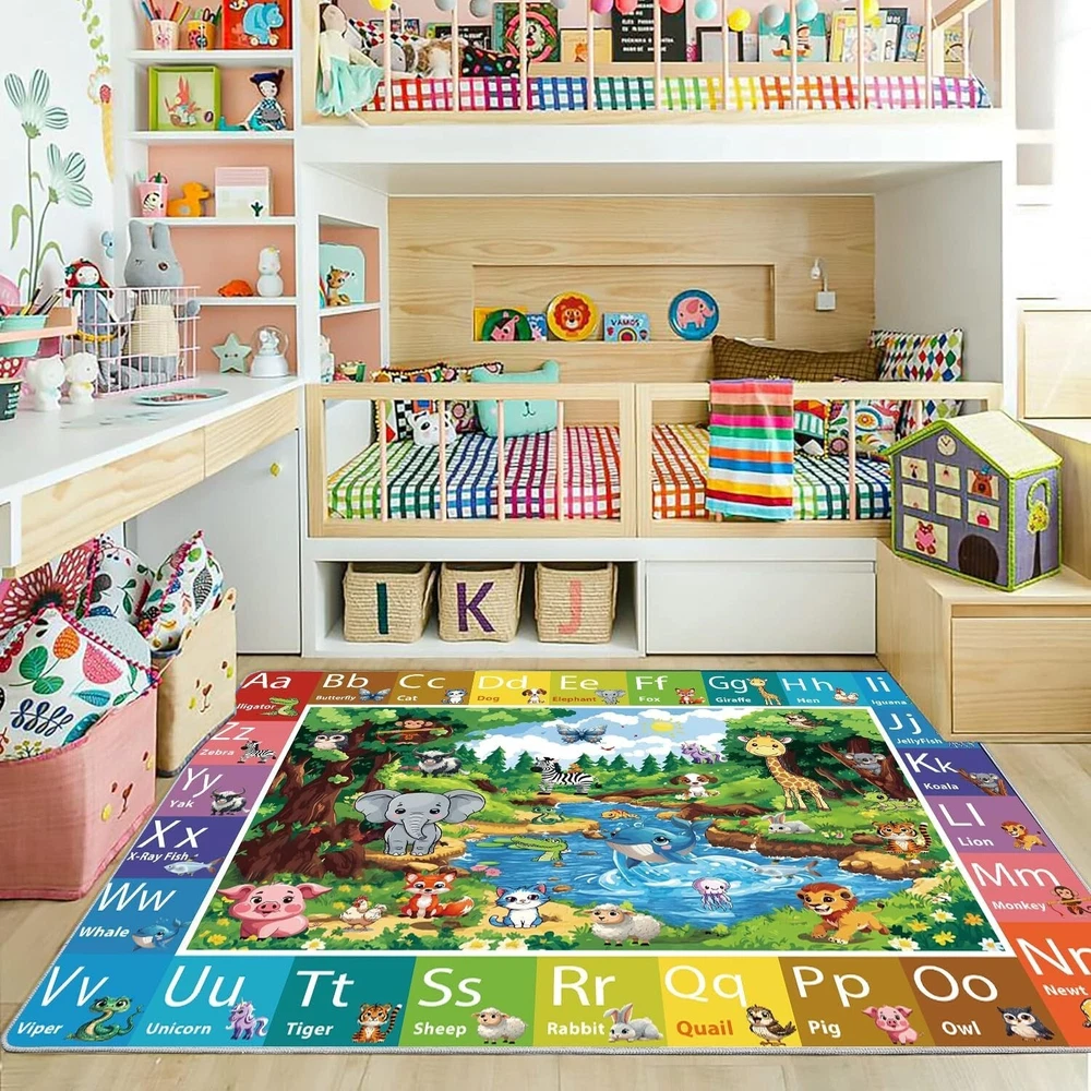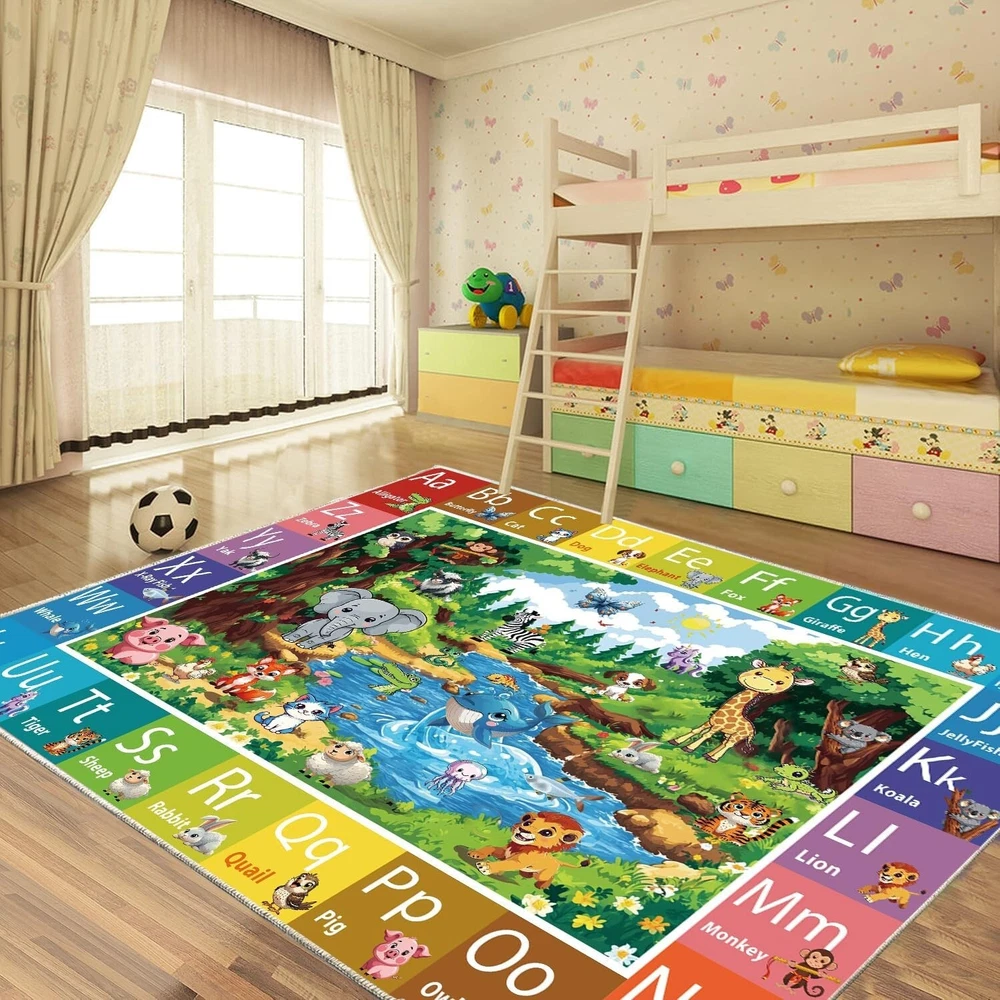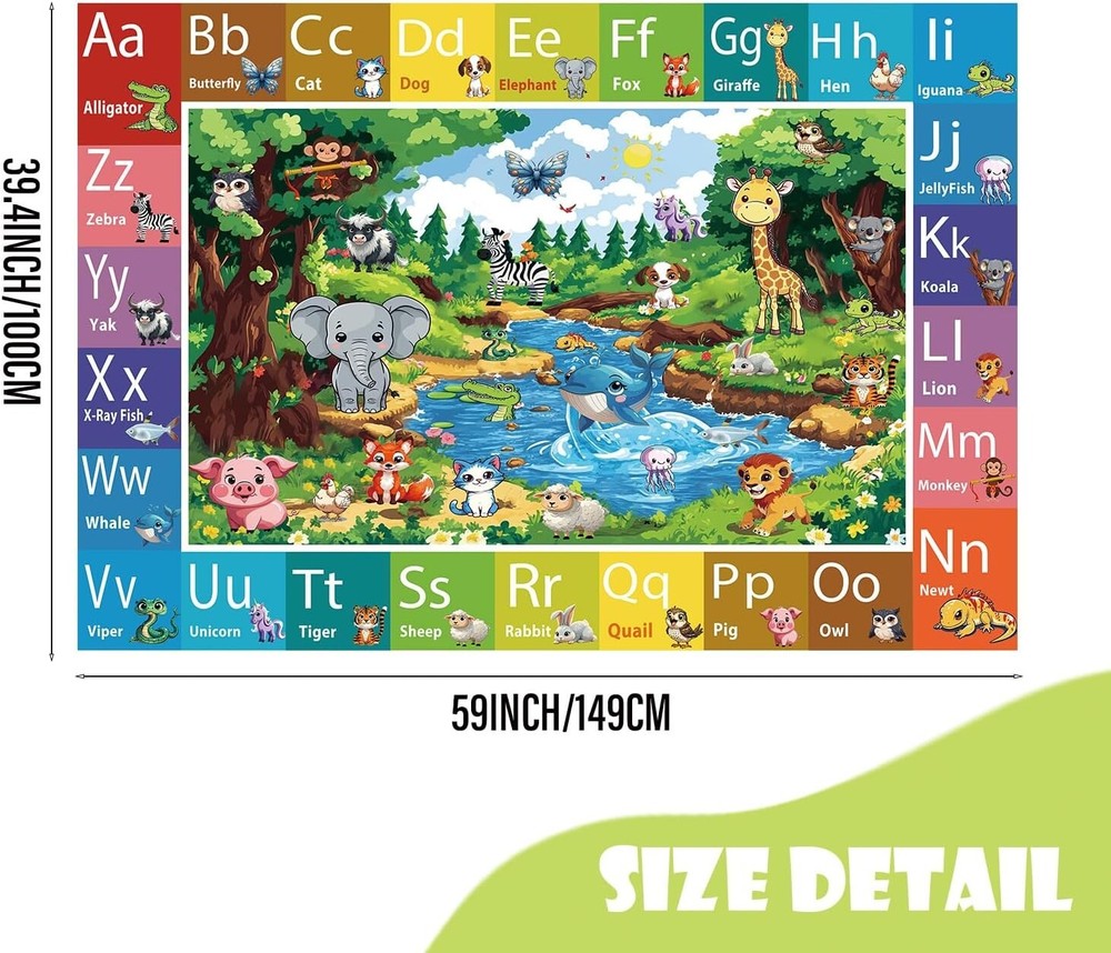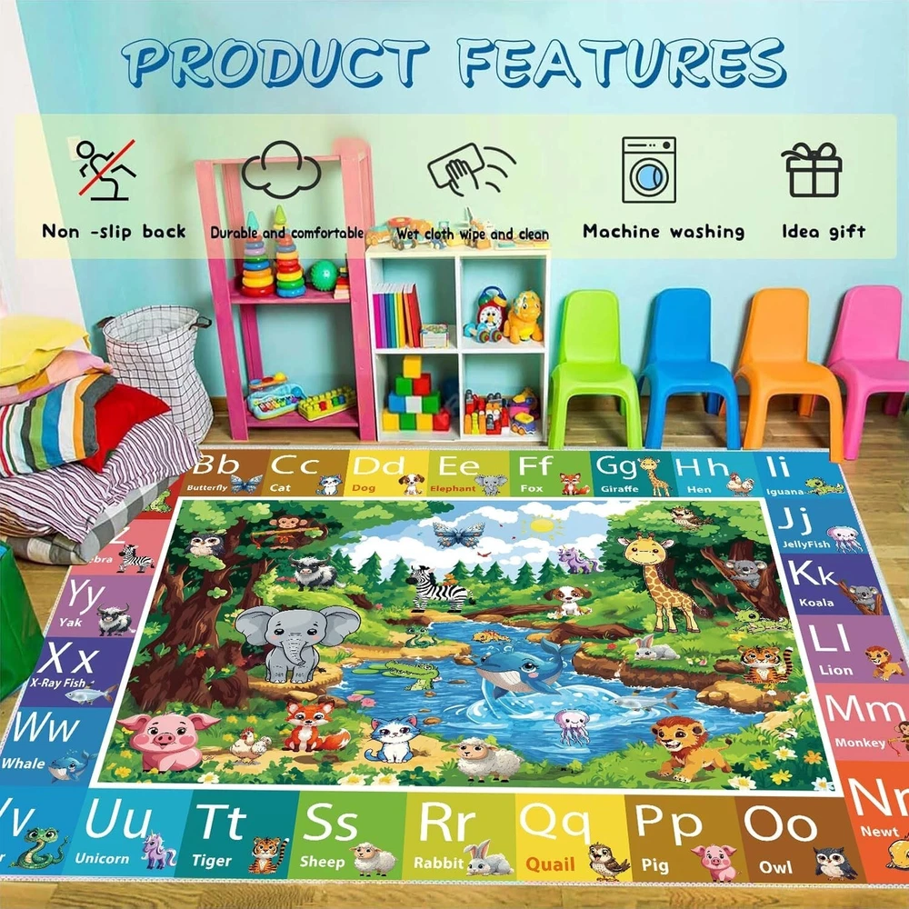 ABC Rug for Kids Room, ABC Baby Mats for Floor Toddlers, Alphabet Play Mat Elementary Preschool Kid's Rugs with Animal Illustrations - Inches MATERIALS FOR COMFORT: Crafted from soft crystal velvet and durable sponge, this play mat offers a plush surface for your little one. Reinforced edge stitching ensures long-lasting quality, while the anti-slip backing keeps it securely in place. LARGE & VERSATILE DESIGN: Measuring 59''", this ABC rug is perfect for playrooms, nurseries, bedrooms, classrooms, or daycare centers. Its vibrant design makes it a standout addition to any space. FUN & EDUCATIONAL: Teach while they play! Each letter of the alphabet is paired with an adorable animal, creating an engaging learning experience. Numbers, shapes, and bright colors spark curiosity and encourage early education. PERFECT FOR ALL KINDS OF PLAY: From crawling and tumbling to learning and exploring, this kid's rug provides a safe, comfortable environment for kids to grow. It’s designed to support active play and creative learning. EASY TO CARE FOR: Designed with busy parents in mind, the abc mat is easy to clean and maintain. Creases from folding? No problem! Simply place a heavy object on the edges, or use warm water and a hair dryer for quick results. THOUGHTFUL PACKAGING: Packed with care, the nursery rug may arrive with slight creases—just air it out or follow our crease-removal tips. Not happy? Contact our friendly customer service team through "contact sellers" for assistance. Your satisfaction is our priority!