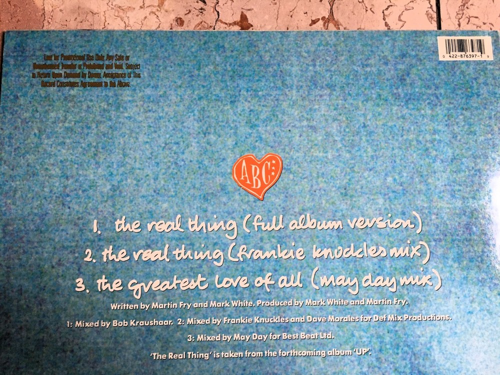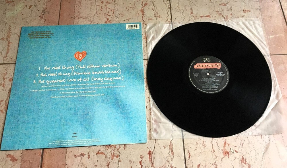 This is a gently pre-owned RARE PROMOTIONAL copy and original pressing of the 12 inch mixes of "The Real Thing" by ABC. This 33rpm 12" was released in 1989 by Mercury Records, USA # 876-397-1. I purchased this record "brand-new" when it was first released. As I did with many of my records, I only played it once, and then filed it away for "safe keeping". I visually grade the 12" record to be in "excellent plus" clean condition. The labels on the record indicate "Promotional Copy" (see photos). The outer cover is in excellent condition. There is a Gold Promotional stamp on the back cover. This record contains three tracks (see below). This will be a nice addition to your collection. My date of purchase (12-20-1989) is lightly written in pencil on the inner lip of the cover, it is very easily erasable. I will combine shipping for multiple purchases. Songs: Side 1 The Real Thing (Full Album Version) 4:52 Side 2 The Real Thing (Frankie Knuckles Mix) 7:03 The Greatest Love Of All (Mayday Mix) 6:01