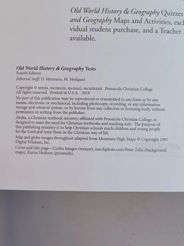 ABEKA homeschool curriculum Old World History & Geography in Christian Perspective Grade 5 (4th edition) lot of two books: TESTS and TEST KEY. Preowned, intact stapled bindings, unmarked pages. Light handling wear and soil to covers, corners, edges. Payment is expected within 48 hours of winning this listing. Combined shipping of like items available on request. Shipping will take place within one business day of receiving payment. Please email with questions. Thank you for looking!