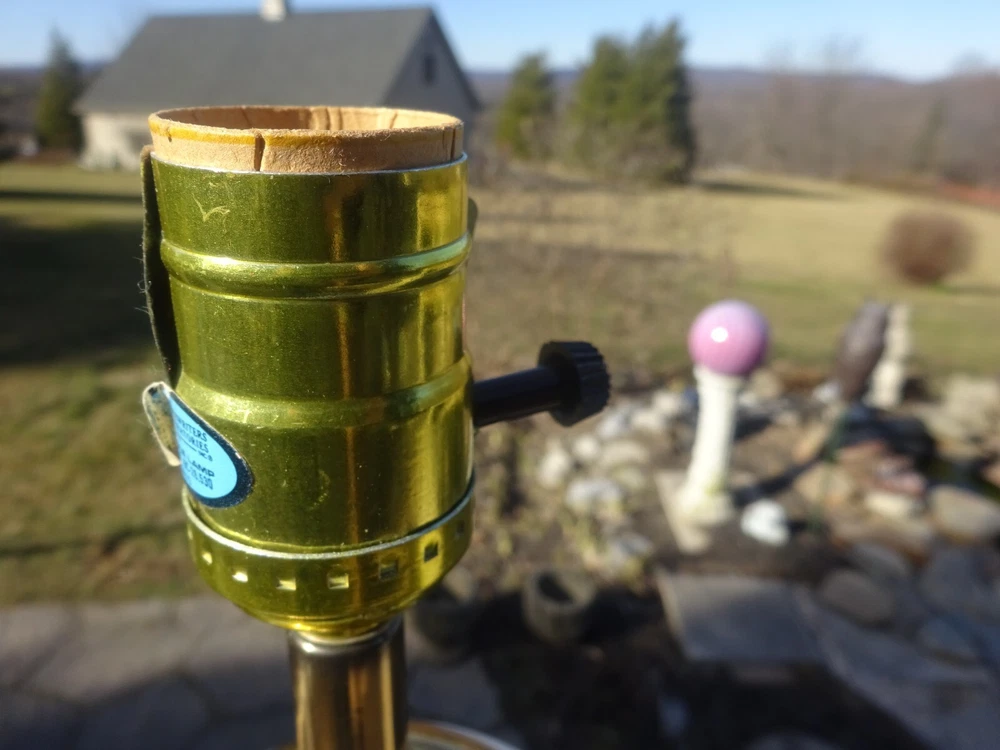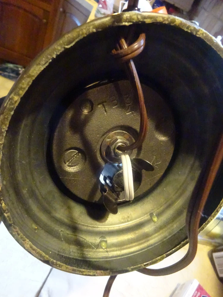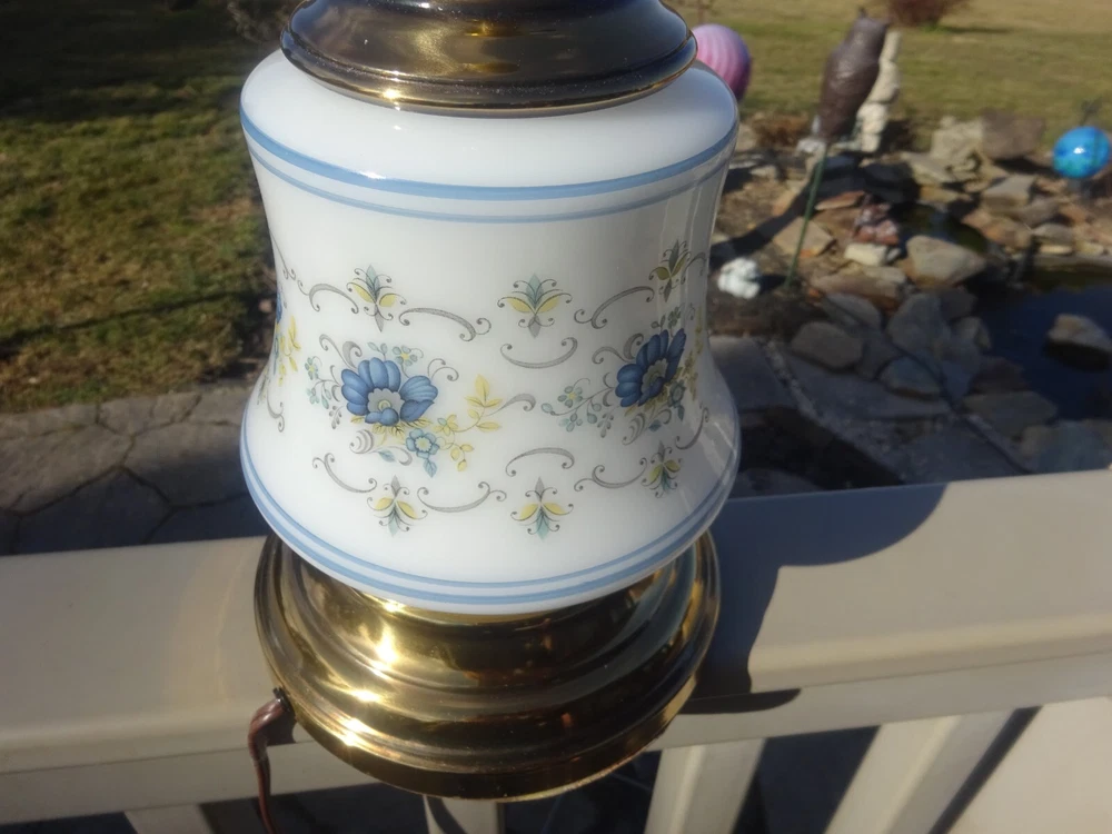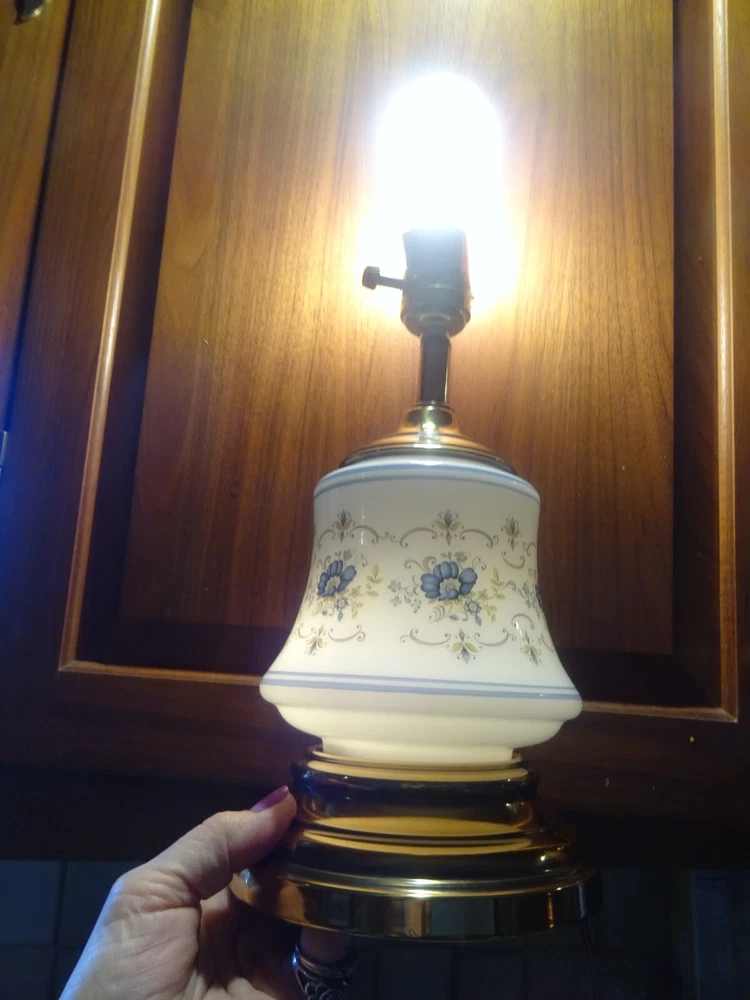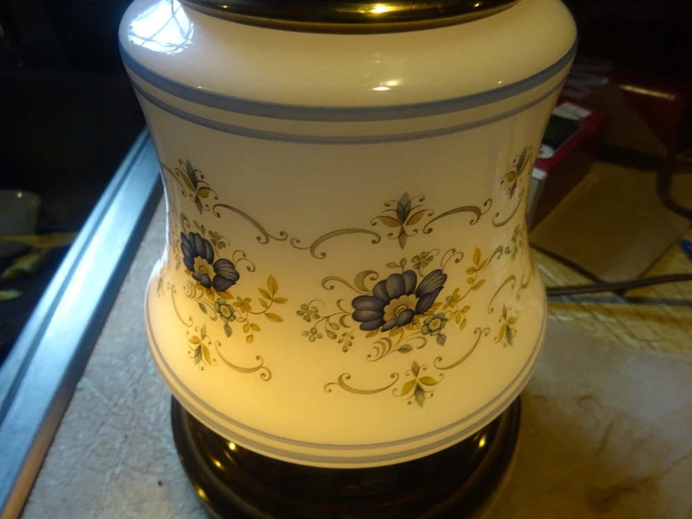 TABLE LAMP OFFERED AS SHOWN NO HARP NO SHADE 3 WAY WORKS AS A NIGHTLIGHT NIGHTLIGHT & MAIN LIGHT AND MAIN LIGHT NICE GOLD FIXTURE GOOD CORNFLOWER GLASS BODY AS IS AS SHOWAPPROX 12 1/4 INCHES TO TOP OF SOCKET BULB NOT INCLUDED