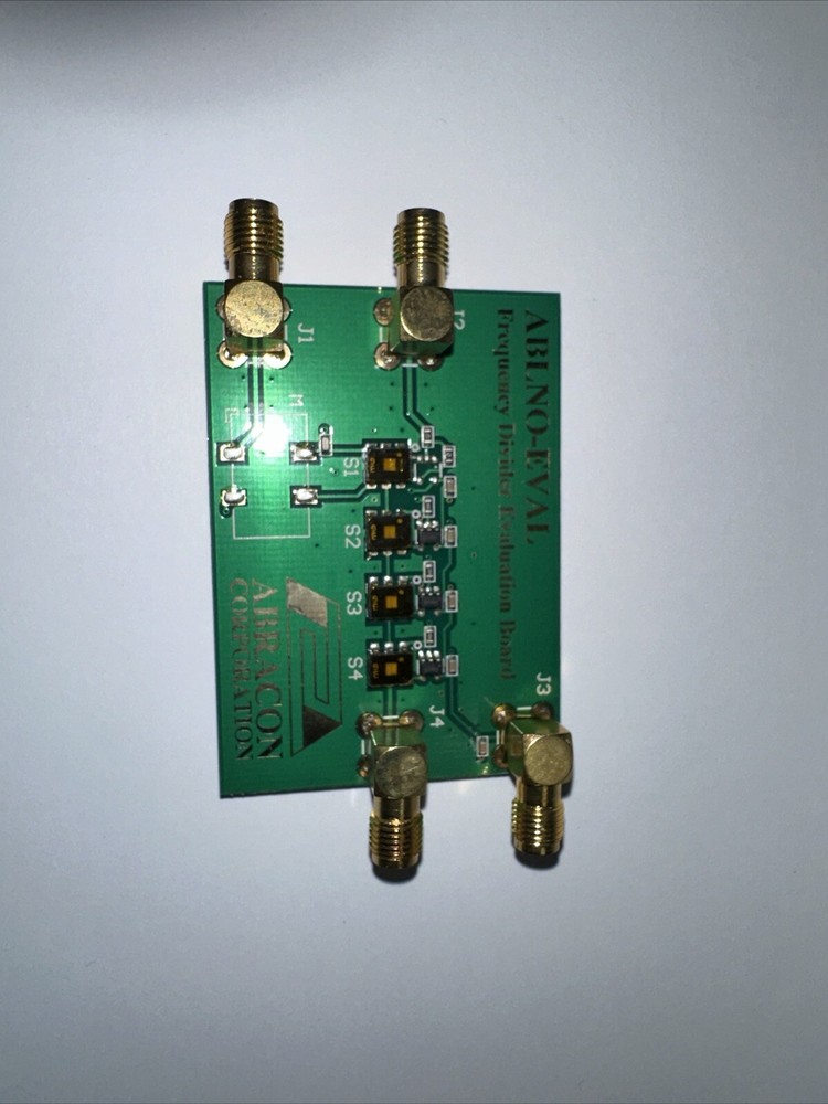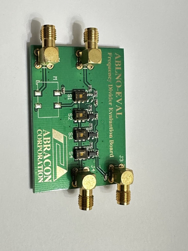 Frequency Divider Evaluation Board 60.4 x 42.7 x 13.0 mm ||||||||||||||| ABLNO-EVAL; Frequency Divider Evaluation Board shown in figure (1) is designed to facilitate engineering evalu- ation of Abracon’s Ultra Low Noise – ABLNO series of fixed clock and voltage controlled crystal oscillators. Further, there is a provision through the RF_IN SMA Connector to supply any other oscillator signal between 10MHz and 200MHz; if ABLNO series is not being characterized. This Evaluation Board is ideal to conduct the following measurements: • Phase Noise and rms jitter for ÷1, ÷2, ÷4 and ÷8 frequency outputs • Frequency Pull Characteristics of the ABLNO by using the Vc port as the control voltage • Frequency Stability over operating temperature (-40oC to +85oC) Figure (1) Designers who are interested in using the ABLNO as an Ultra Low Noise platform device to generate additional Low Noise frequencies will find this Evaluation Board to be of exceptional value. Abracon has implemented Ultra Low Noise ÷2, ÷4 and ÷8 circuitry on this board, that can also be incorportated in end-customer solutions; please contact tech-spport@abracon.com for additional details. Tpycial Phase Noise and jitter peformance in ÷1, ÷2, ÷4 and ÷8 modes is depicted in section 2.0.