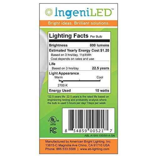 Return Policy Fast Delivery Trusted seller ABL-A19W-10E6W-A-SN A19 LED Light Bulb Product Description LED 10W 800 Lumens 60W Equivalent Non-dimmable Shipping Returns Payment Shipping Shipping is FREE to all addresses other than APO/PO boxes in the lower 48 states. All our stock ships from US-based warehouses. Shipped via USPS or UPS (depending on location and package weight) Unless stated otherwise, all orders will ship within 24-72 hours of your payment being processed. Check our feedback to see the great reviews of FAST shipping we offer. Returns Seller does not accept returns Payment We currently accept payment via eBay managed payments only. Once payment is cleared, we will dispatch your shipment within 1-3 business days. Please refer to the "Shipping" tab for more information regarding shipping speed to your destination.