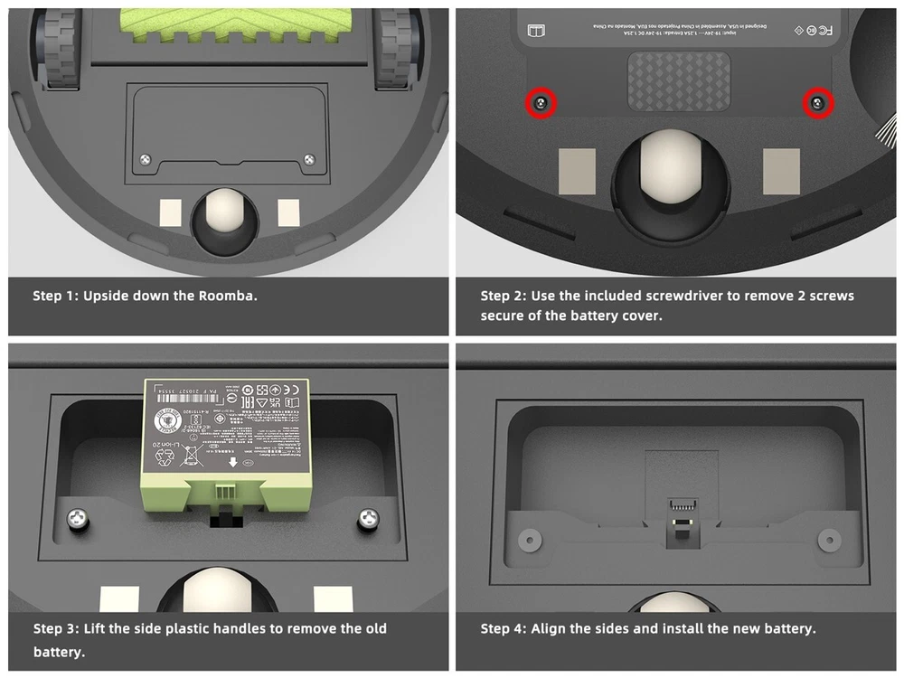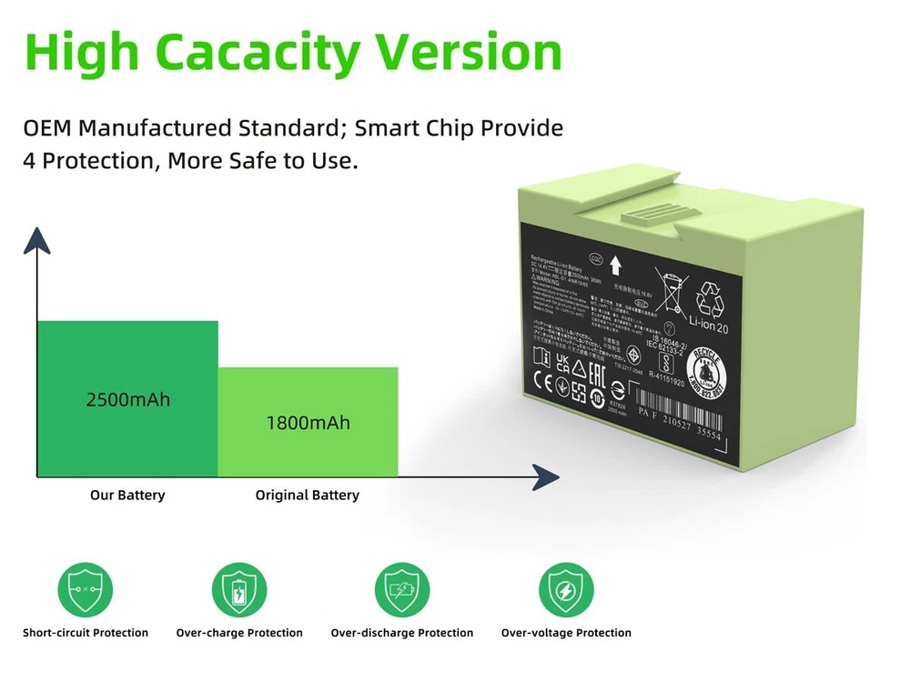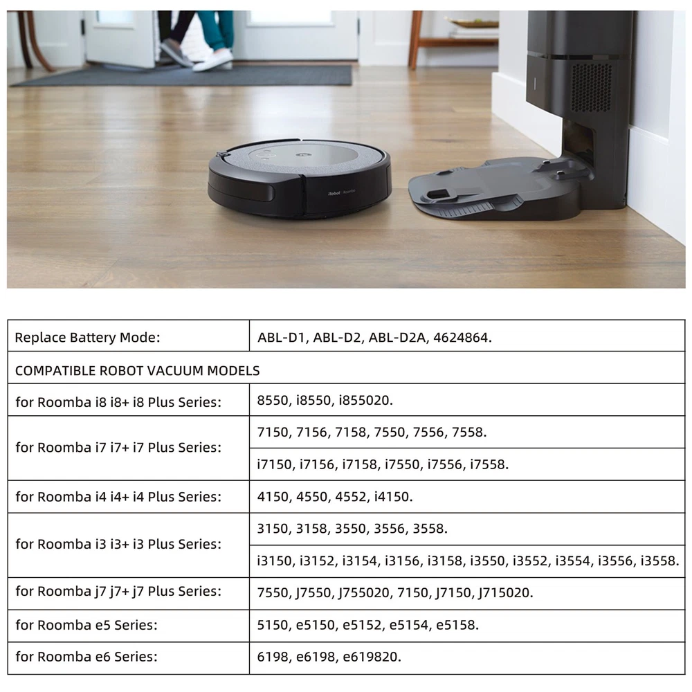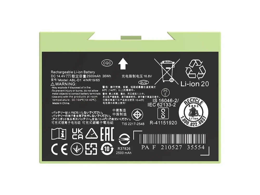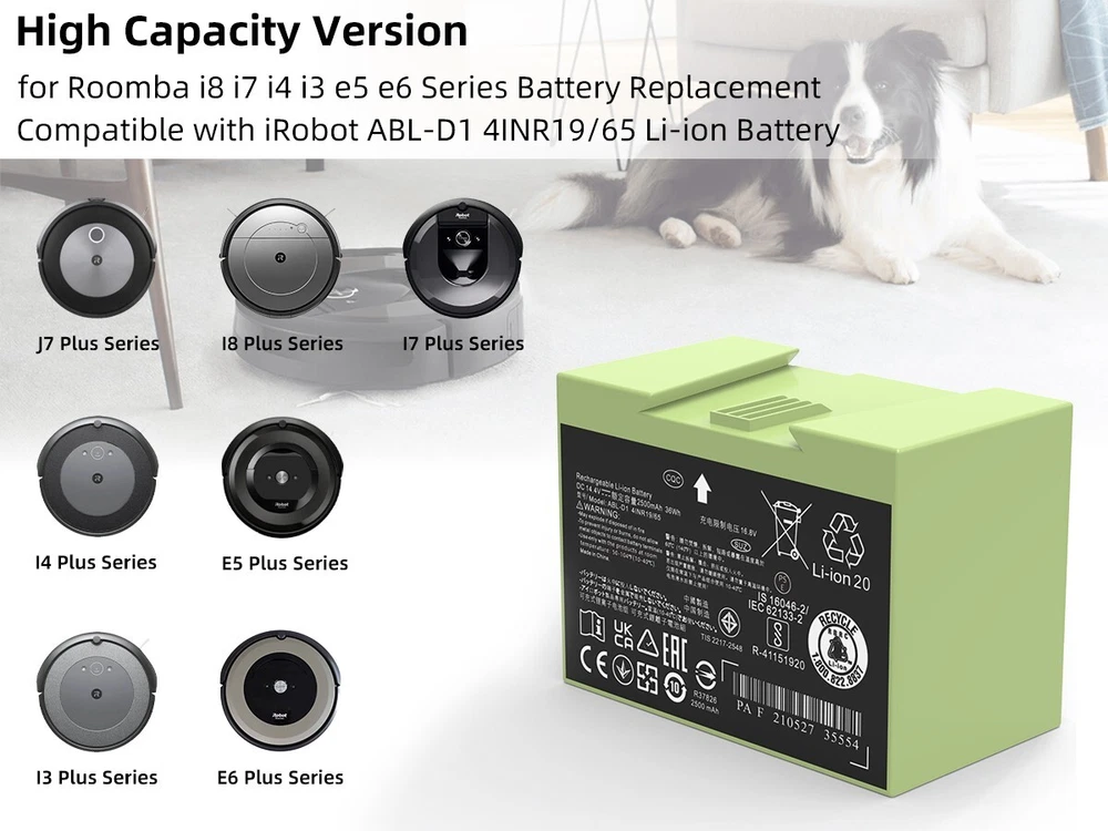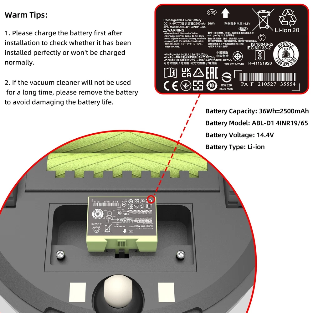 Specifications: Type: ABL-D1 Li-ion Battery Nominal Capacity: 36Wh/2500mAh Nominal Voltage: 14.4V Color: Green Condition: Replacement Battery, Brand New Compatible Brand: for iRobot Roomba Compatible Part Numbers: For iRobot ABL-D1,4624864, 4INR19/65 Compatible Models: For iRobot Roomba e Series e5 e6 and Roomba i Series i3 3150 i3+ 3550 i4 4150 i4+ i7 i7+, 7150 7550 5150 e5150 e515020 e5152 e5154 e5158 e5, e515840 e6 e6198 e619820 i7158 i7550 i755020 i7558 Easy to install: 1. Power off iRobot machine. 2. Use a screwdriver to unscrew the bottom side brush. 3. Unscrew 5 screws on the bottom lid. 4. Pull out the old battery and insert the new battery. 5. Use a screwdriver to screw the bottom lid and the side brush back. Note: 1. Please take a fully charge before first use. 2. Please don't charge the battery immediately after use, let the battery cool down for 5-10 minutes before recharge. 3. If the machine cannot be used for the first installation, please try to remove and reinstall the battery then it will restore to normal.