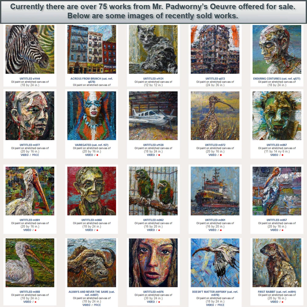 nn188 UNTITLED nn188 2024 Oil Paint on Gallery wrapped canvas stretched canvas dimensions: 12 by 12 by 3/4 in. (30.5 cm by 30.5 by 1.9 cm.) [Please allow me a few days to package and ship these oil paintings -- thank you!] signed with initials on front and full signature on back Note: I am very happy to entertain all offers on paintings. Every offer received is always considered a compliment. - DP Note: I am very happy to entertain all offers on paintings. Every offer received is always considered a compliment. - DP S C R O L L D O W N T O V I E W M O R E D E T A I L I M A G E S To sign up for the weekly newsletter of new auctions and paintings in the eBay store Title and Provenance This painting is entitled UNTITLED nn188 , and includes the original signature of artist on front of painting and verso, with painting catalogue series and number applied on verso. Painting also includes a Certificate of Authenticity documenting chain of title and provenance for this work. Painting number nn188 may be included in forthcoming Catalogue Raisonné of the works of DAVID PADW0RNY. Medium and Dimensions Oil Paint on canvas of 12 by 12 by 3/4 in. (30.5 cm by 30.5 by 1.9 cm.), including hanging clip. This painting is pre-stretched and sides of the canvas are painted (see images below). Each of the sides are painted differently, to read more about why each is painted in a unique manner please click here . The staples holding the canvas to the stretcher bars are on the back so the painting is ready for immediate display. Shipping notes: We are pleased to combine shipping. If you intend to buy/bid on additional works, please send email to let us know your preferences. If you would prefer overnight or expedited shipping we will be happy to accommodate your wishes - please email for a specific bid. If you wish to combine shipping -- please request that the future invoices be changed to reflect combined shipping. For more details on combined shipping please visit these links based on your location: United States , Canada , all other International . Payment: PayPal is preferred. Paintings will ship upon bank clearing your funds. Please make payment within 5 days of sale. If there are special circumstances that might prevent this -- please email prior to sale. Thank you. Guarantee: If for any reason the actual painting does not meet your full expectations, please return it upon receiving it in its original condition and packaging materials. We will refund the full cost of the painting, less shipping costs. Additional Images and Materials (All links below will open in a new window) About The Artist DAVID PADW0RNY was born in Norristown Pennsylvania. He is a graduate of the Maryland Institute College of Art and is currently working full time as a professional artist in Chelsea, NYC. Awards and Honors Scholastics Portfolio Award, New York, New York Ed Lindgren Memorial Scholarship, Sponsored by Artworks Orlando Orlando, Florida Fanny B. Thalheimer Scholarship, Maryland Institute College of Art Baltimore, Maryland First Place and Honorable Mention in Painting, Maitland Arts Festival Maitland, Florida Best of Show and First Place, "Enjoying Our Lakes" Photography Contest Windermere, Florida Three Gold Medals, Scholastics Competition, University of Central Florida Orlando, Florida Collector Comments Please feel free to email your opinions and comments of the paintings. We look forward to hearing more from you, our Valued Collectors, Gallerists and Curators. -- D.P. "Every time I paint a portrait I lose a friend." John Singer Sargent (1856 - 1925)