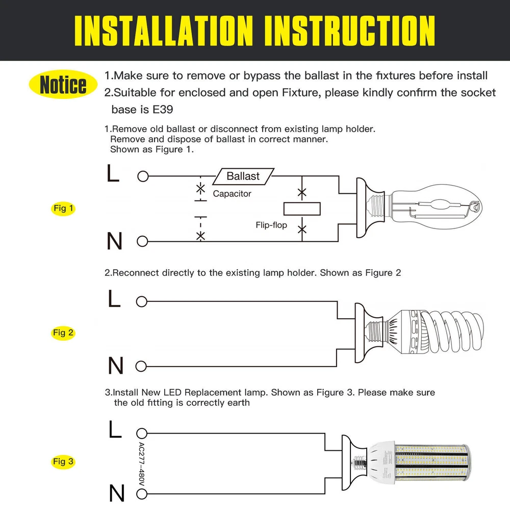 Product Description AC480V 347V LED Corn Cob Light Bulb 60W E39 Mogul Base Led Bulbs 5000K Daylight 【Super Bright】60W led corn cob with 8,400 lumens and 360 degree beam angle fits to be 250W HID Replacement retrofit. The installation height is recommended between 7ft and 12ft. 【90% Energy Saving】The LED corn light reduce more than 90% electricity consume than traditional light. Available for working voltage from 277VAC to 480VAC 【Quality Listed】The industrial quality light passed ETL certification. It offers a safer using at home, commercial, industrial area. 【Easy Installation】E39 Base is easy to Connect directly a screw base. Must be remove or bypass the ballast in your electric circuit before installation. 【Long Lifespan】This bulb has 50,000 hours lifespan. Offering at least 11 years of lighting time if used 12 hours a day. 【Warranty】We provide with 5 years warranty for all our bulbs. If any problem or question about bulbs please contact us by email. We will reply within 24 hours. Product Description The LED cob bulb are ETL listed with outstanding industrial quality, superb energy efficiency, long lifespan and easy installation. Compared with traditional light bulbs, we provide brighter lighting and wider applications, but we have achieved up to 90% energy saving. So our LED light bulbs can help you save more than 90% of electricity bills. The design of Non-flickering No UV or IR radiation can provide higher stability and reliability when using the bulbs. Feature: 1. ETL Listed 2.Replace 250W HID bulb 3.Instant lighting 4.6K high voltage surge protection 5.Non-flickering No UV or IR radiation Technical Data: 1.Lighting Technology: LED 2.Bulb Shape: Corn Cob 3.Rated Power: 60 watts 4.Input Voltage: AC277-480V 5.Bulb Base: E39 Base 6.Power Factor: >90% 7.Power Efficacy: 140 Lm/W 8.Color Temperature: 6,000K 9.Color Rendering Index (RA) : >80 10.PC Cover: Transparent 11.Materials:Aluminum+ASA 12.Lifespan: 50,000 hrs Wide Application: Indoor High Bay Area: warehouse, factory, workshop, shopping mall, church, garage, grocery, car wash-shop, gym, basketball court, tennis court, office, garden, community, back-yard, aircraft storage, farm, restaurant, airport, subway, convention center, swimming pool etc. Outdoor: Parking lot: shoebox, pole/box fixture. Street: cobra head, pole fixture. Gas station: canopy/High bay fixture. Yard/Garden: post top, floodlight/wall pack fixture, Billboard etc. About Us Payment Shipping Returns Contact Us SHENZHEN NUOGUAN TECHNOLOGY CO. LTD founded in 2010. We are high-technology comany specialized in manufacture Commercial and industrial LED light. Advanced production equipment and excellend R&D ability help us to combining service ,production sell together provide top-level products to our customers. 1. Payment is expected within 7 days of auction close. Or Unpaid Items will be forfeited per eBay . 2. Taxes may be applicable at checkout as states adopt new laws and regulations regarding sales tax collection. 1. We ONLY ship to USA . 2. Orders processed within 1-2 business day of payment verification. There’s no Delivery service or courier service on Saturdays, Sundays or Public Holidays. 3. We have 3 different warehouse in US,so due to stock status and time differences, we will choose to ship your item from our first available warehouse for fast delivery. 4. We offer Free Shipping within the Lower 48 states! All packages are sent via UPS or USPS.The delivery time for UPS Ground is typically 2-5 business days. We strive to ensure 100% satisfaction for each and every one of our customers. we offer a 30-day 100% money-back guarantee on all eBay orders. If your item isn't just as you wished, simply send it back to us and we'll refund or replace your item. Please note that all returns must be authorized by our Customer Service department. please contact us though message first if you have any problem. USA Warehouse. Fast shipping! We are appreciated your purchasing form our eBay store. Office Time: 9:30 - 18:30, Monday - Saturday (UTC+8) Please contact us with eBay Message. We will respond you within 24 hours on business day. About Us SHENZHEN NUOGUAN TECHNOLOGY CO. LTD founded in 2010. We are high-technology comany specialized in manufacture Commercial and industrial LED light. Advanced production equipment and excellend R&D ability help us to combining service ,production sell together provide top-level products to our customers. Payment 1. Payment is expected within 7 days of auction close. Or Unpaid Items will be forfeited per eBay . 2. Taxes may be applicable at checkout as states adopt new laws and regulations regarding sales tax collection. Shipping 1. We ONLY ship to USA . 2. Orders processed within 1-2 business day of payment verification. There’s no Delivery service or courier service on Saturdays, Sundays or Public Holidays. 3. We have 3 different warehouse in US,so due to stock status and time differences, we will choose to ship your item from our first available warehouse for fast delivery. 4. We offer Free Shipping within the Lower 48 states! All packages are sent via UPS or USPS.The delivery time for UPS Ground is typically 2-5 business days. Returns We strive to ensure 100% satisfaction for each and every one of our customers. we offer a 30-day 100% money-back guarantee on all eBay orders. If your item isn't just as you wished, simply send it back to us and we'll refund or replace your item. Please note that all returns must be authorized by our Customer Service department. please contact us though message first if you have any problem. Contact Us USA Warehouse. Fast shipping! We are appreciated your purchasing form our eBay store. Office Time: 9:30 - 18:30, Monday - Saturday (UTC+8) Please contact us with eBay Message. We will respond you within 24 hours on business day. You may also like 100W LED Barn Light with Dusk To Dawn Photocell Outdoor Garden Yard Night Light 69.05 USD Free shipping 200W UFO LED High Bay Light In